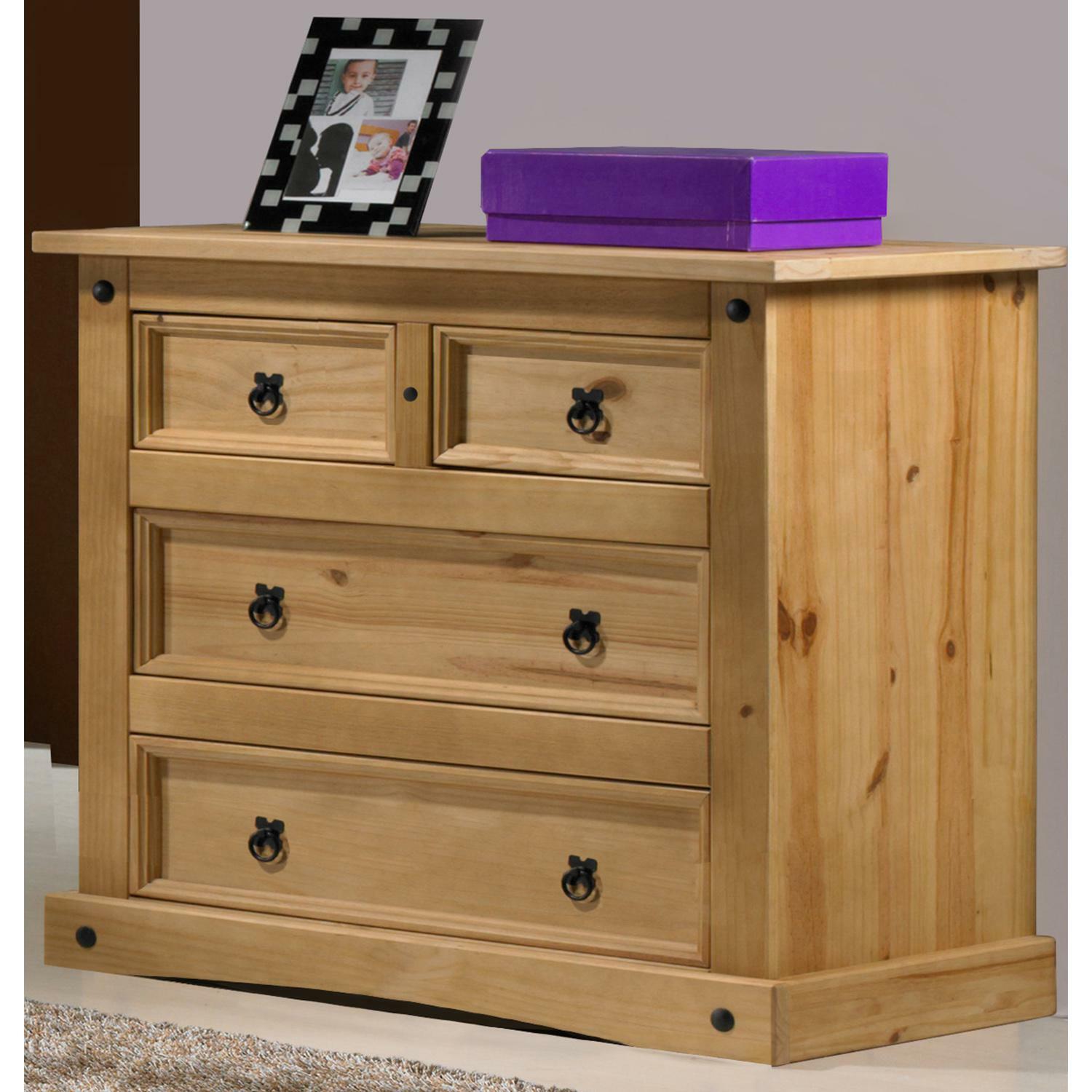 materiál masiv borovice voskovaná v medovém odstínu 2 malé a 2 velké zásuvky, kovové ozdobné úchytky vhodný doplněk je nástavec CORONA 16463 součást sestavy Corona