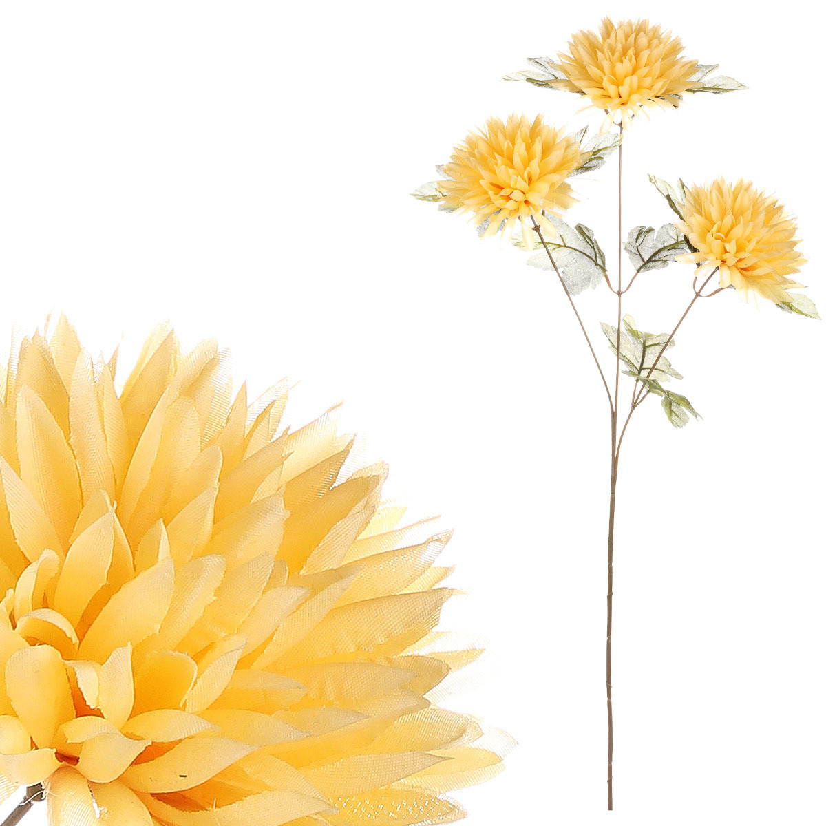 Udělejte si radost pořízením nevadnoucí krásy v podobě umělé řezané květiny a oživte svůj interiér, či jiné zvolené místo, nádhernými květy a barvami. Nechť je právě žlutá trojhlavá chryzantéma tím významným bodem pro vaší vytouženou výzdobu. Variant použití je mnoho a je jen na fantazii každého z nás, k čemu tuto umělou dekoraci použije. Můžeme ji nechat vyniknout třeba v krásné váze na viditelném místě, nebo vytvořit s dalšími druhy nádhernou kompozici. Naše široká nabídka umělých řezaných květin totiž nabízí nepřeberné množství možností, ze kterých si vybere každý dle svého vkusu či události, pro kterou je určena. Pokud hledáte oživení vybraného místa přírodním půvabem a barvami, ale zároveň nemáte možnosti, jak se starat o živé rostliny, bude právě tato umělá květina pro vás ideální volbou.