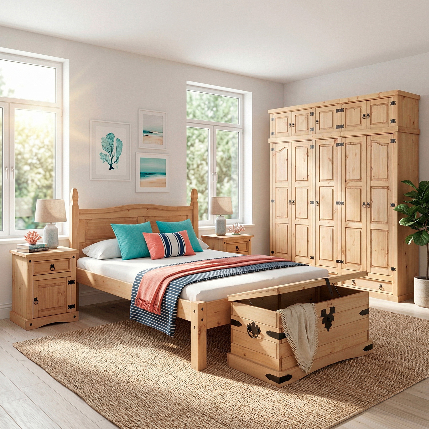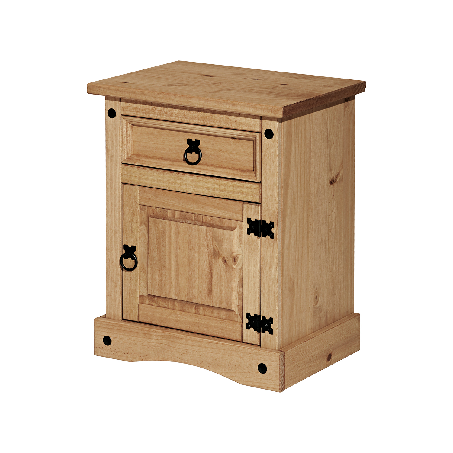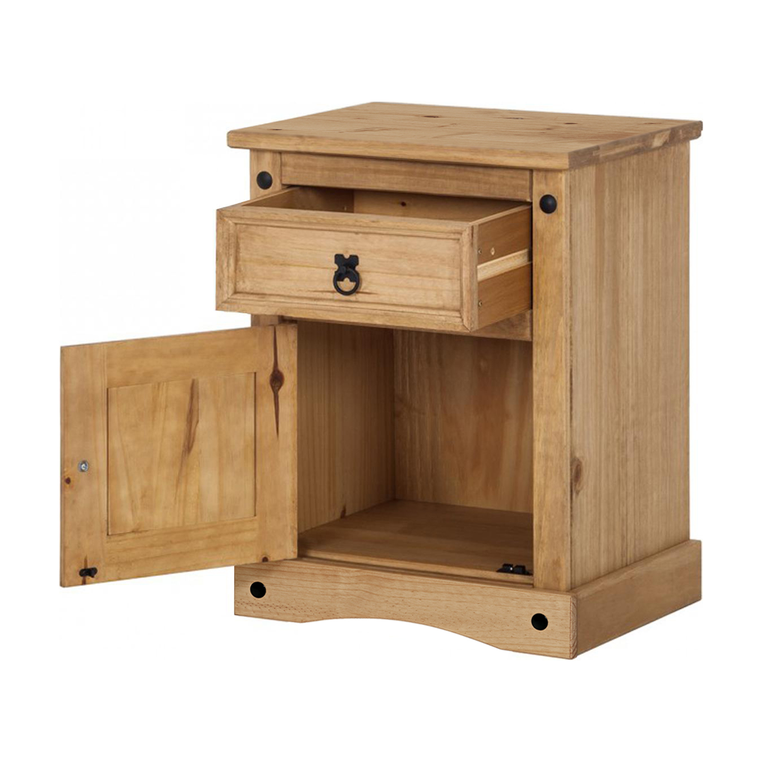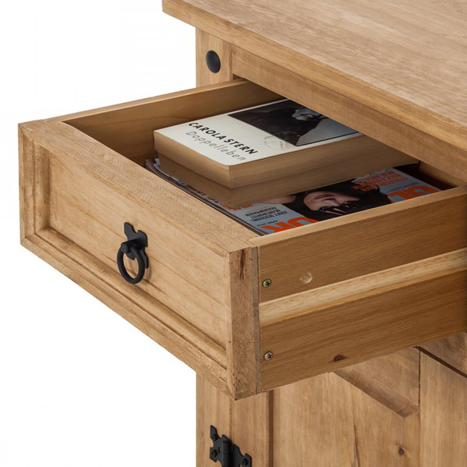 materiál masiv borovice voskovaná v medovém odstínu 1 zásuvka, 1 dvířka, hloubka zásuvky 30 cm, kovové ozdobné úchytky možnost montáže pantů na levou i pravou stranu součást sestavy Corona