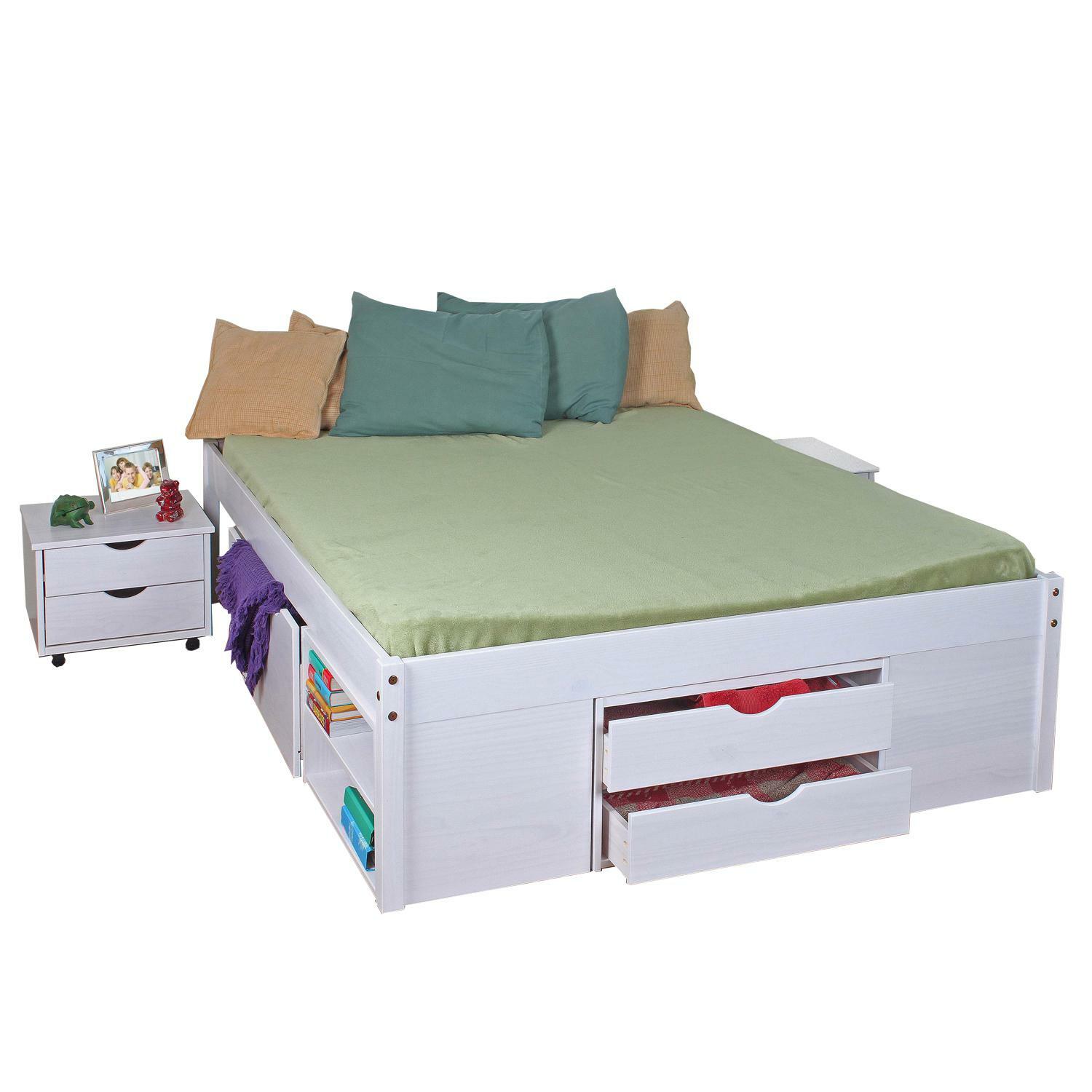 materiál masiv borovice, barevné provedení bílý lak praktické úložné prostory pod postelí, výška sedu 44,5 cm 2 výsuvné noční stolky a rošt (dřevěný laťkový) jsou v ceně, matrace není v ceně doporučený rozměr matrace 160 × 200 cm nebo 2 kusy 80 × 200 cmID20900175 till