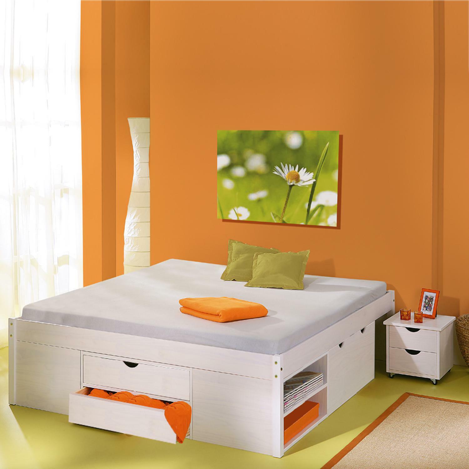 materiál masiv borovice, barevné provedení bílý lak praktické úložné prostory pod postelí, výška sedu 44,5 cm 2 výsuvné noční stolky a rošt (dřevěný laťkový) jsou v ceně, matrace není v ceně doporučený rozměr matrace 180 × 200 cm nebo 2 kusy 90 × 200 cmID20900180 till
