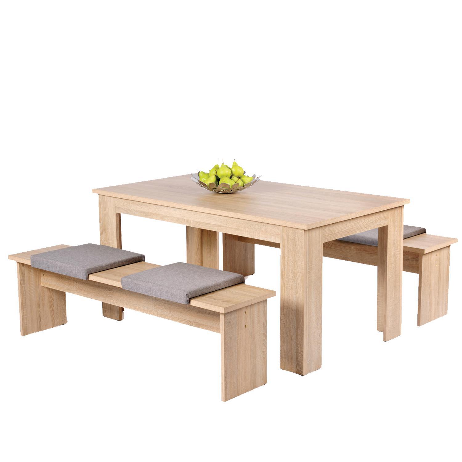 materiál MDF (22 mm), barevné provedení dub Sonoma sestava obsahuje stůl a 2 lavice, každá lavice je určená pro 2 osoby doporučená nosnost jedné lavice je do 180 kg rozměr stolu (š/h/v) 140 × 80 × 75 cm, rozměr lavice (š/h/v) 140 × 37 × 45 cm cena je bez sedáků a bez dekorací