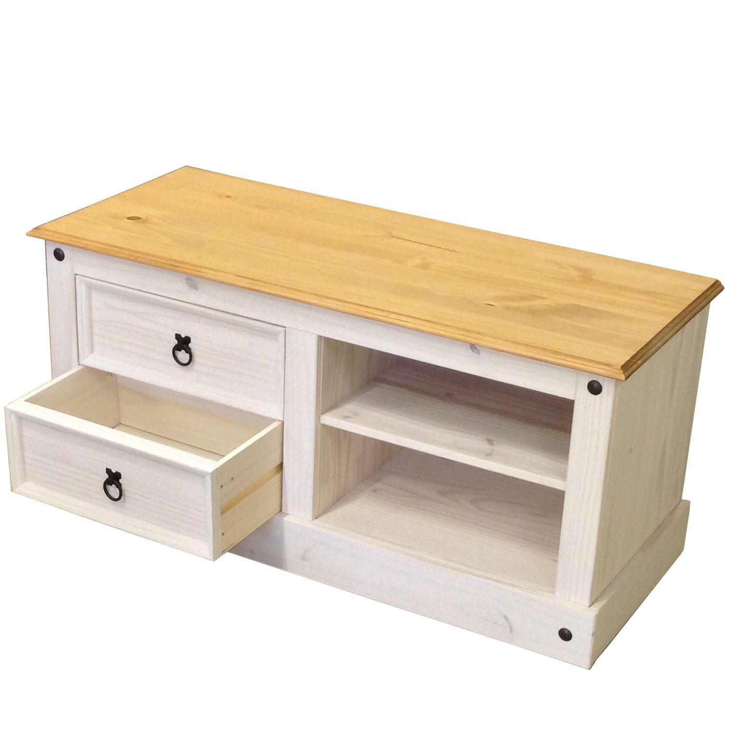 materiál masiv borovice voskovaná v bílém odstínu horní deska masiv borovice voskovaná v medovém odstínu 2 malé zásuvky, 1 police, kovové ozdobné úchytky součást sestavy Corona bílá