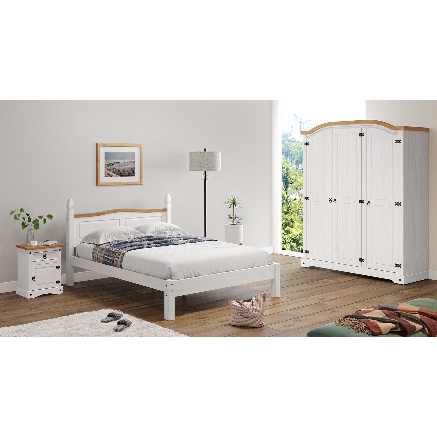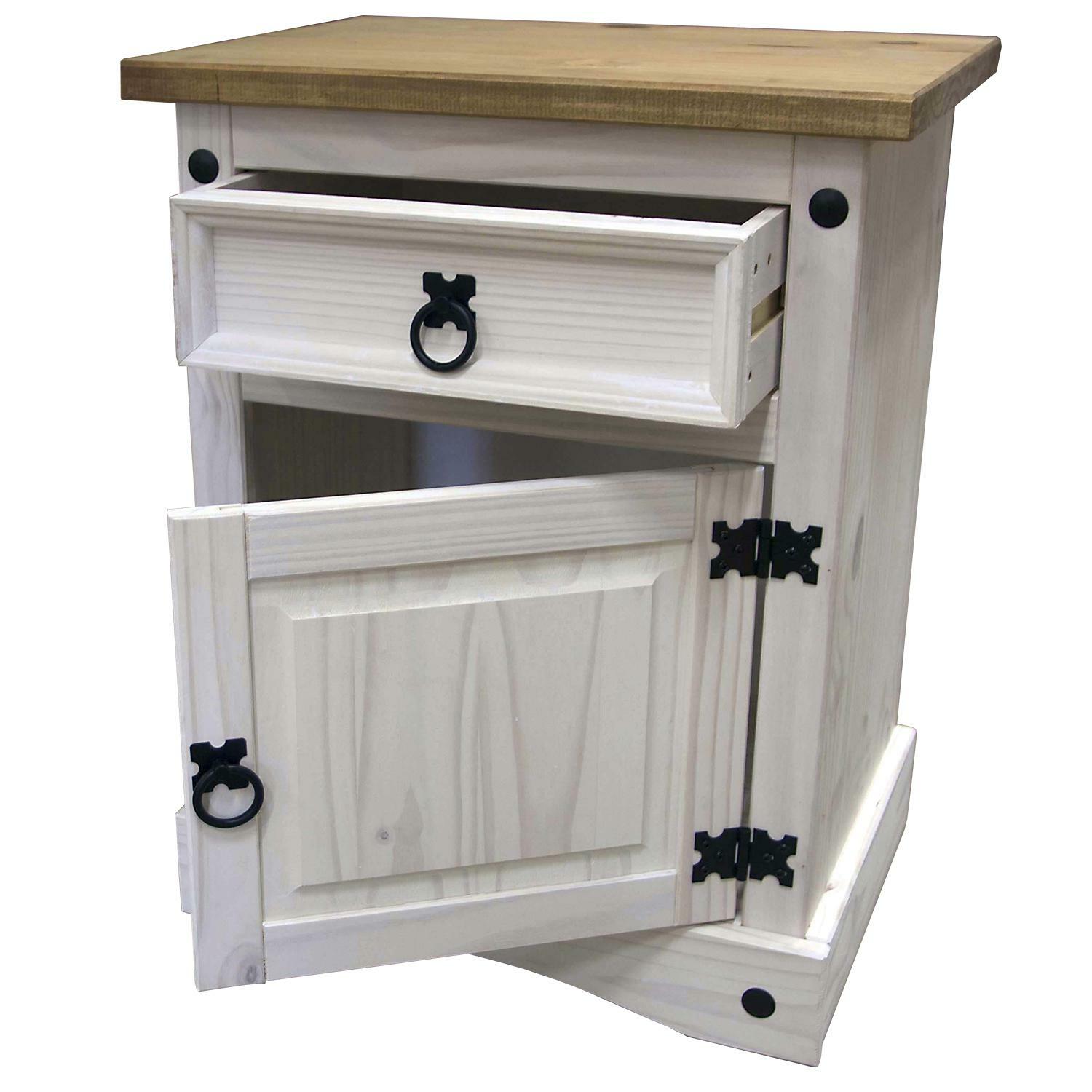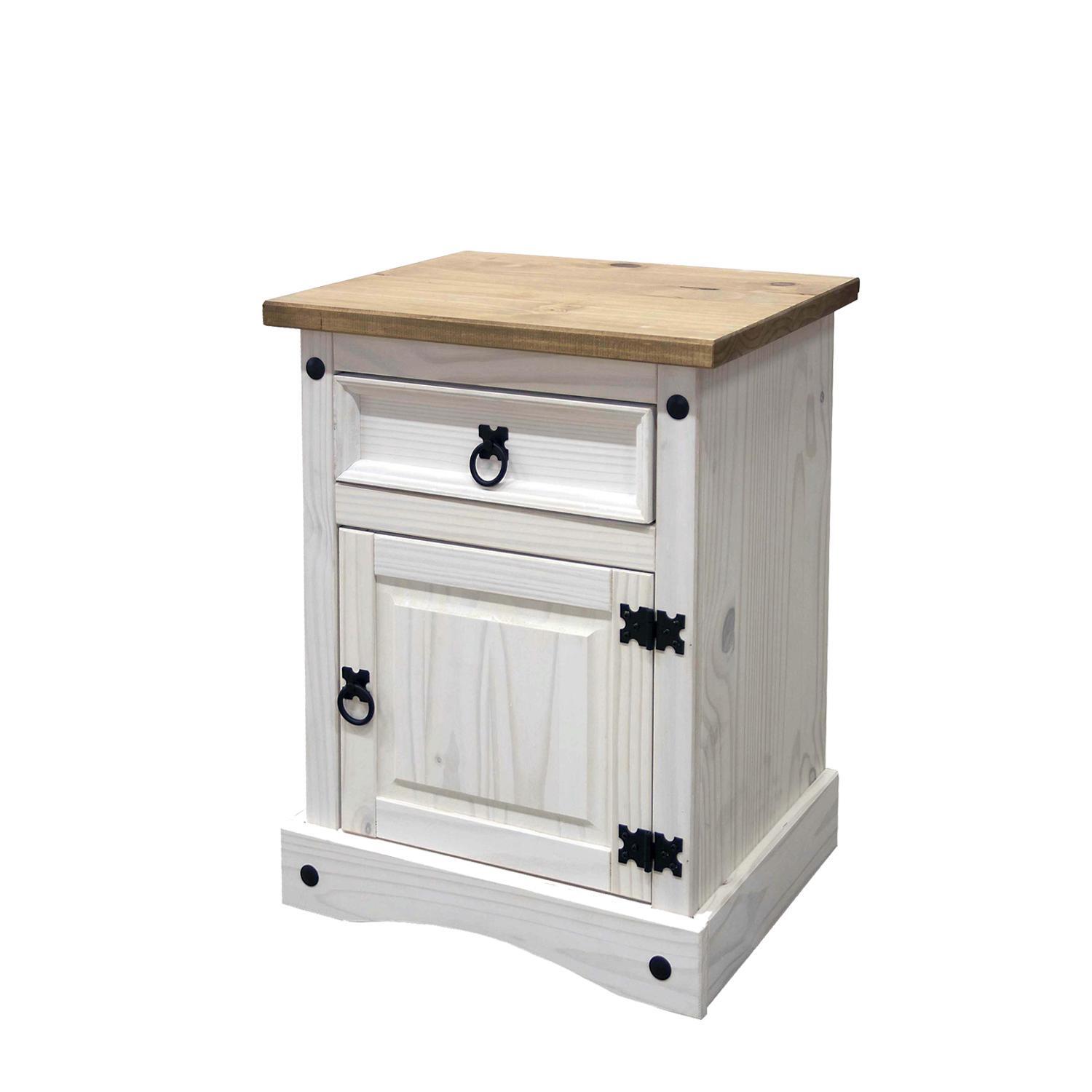 materiál masiv borovice voskovaná v bílém odstínu horní deska masiv borovice voskovaná v medovém odstínu 1 zásuvka, 1 dvířka, hloubka zásuvky 30 cm, kovové ozdobné úchytky možnost montáže pantů na levou i pravou stranu součást sestavy Corona bílá