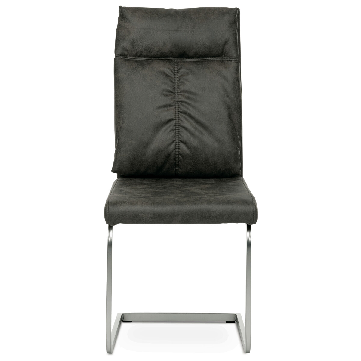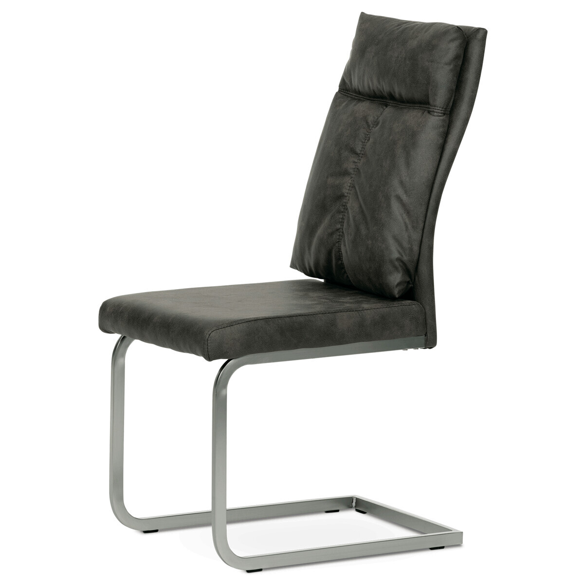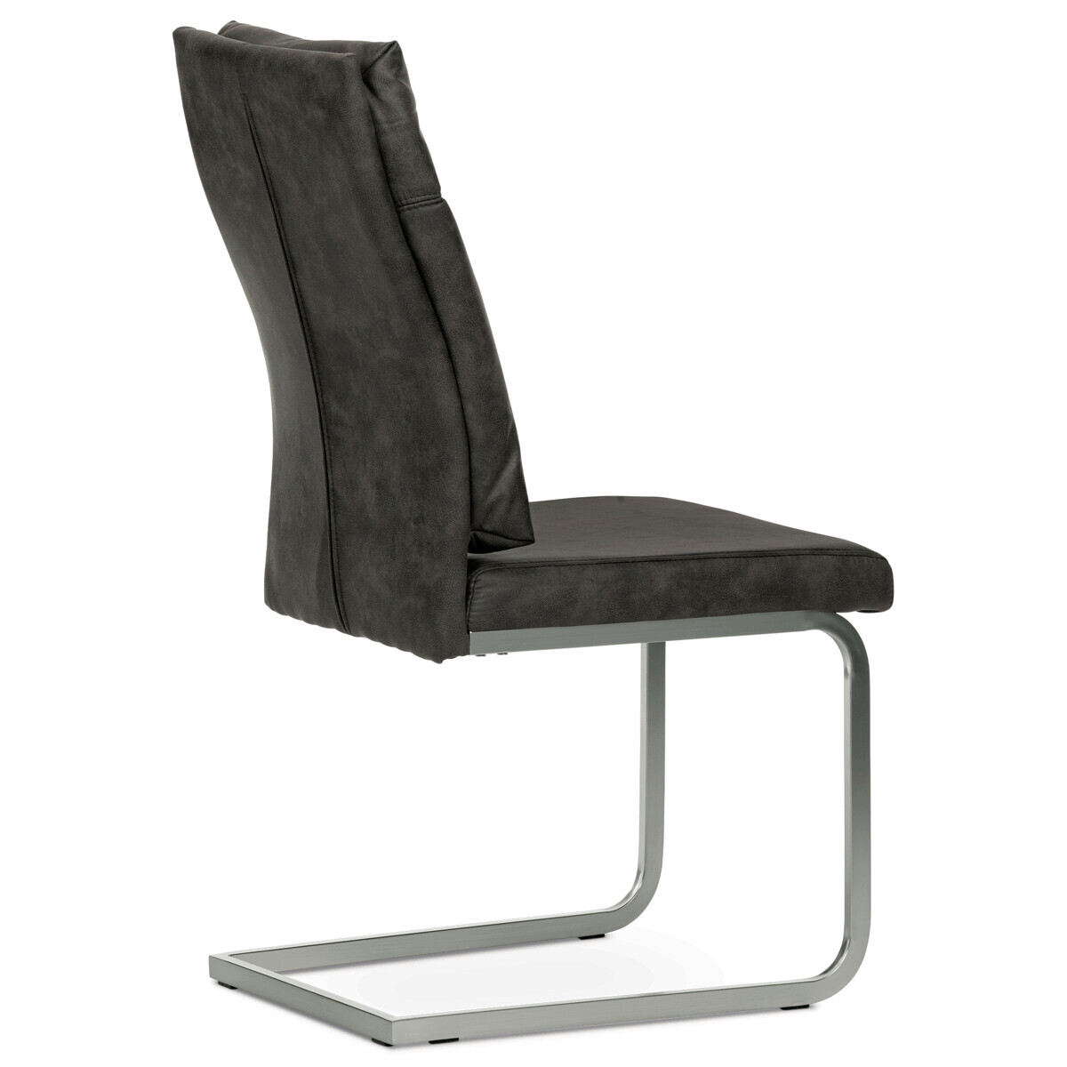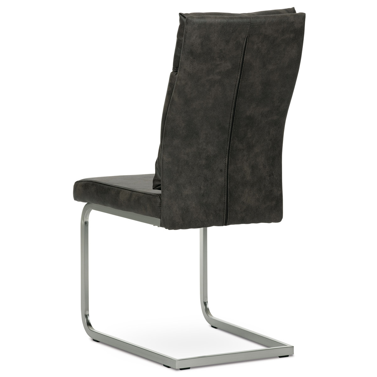 Designová jídelní židle s vysokým extra polstrovaným opěradlem. Potah je z látky v šedohnědém odstínu ve velmi žádaném dekoru vintage kůže. Prošití přední části opěráku je ve tvaru "T" vytváří trendy zvrásnění a záhyby na povrchu potahu. Polstrování je z velmi kvalitní PU pěny. Použitá látka je na povrchu hladká, velmi dobře se udržuje a čistí. Elegantní a vintage vzhled této židle podtrhuje kovová podnož v povrchové úpravě matného niklu. Je obdélníkového průřezu a opatřena černými plastové kluzáky, které sníží riziko poškození Vaší podlahy na minimum a zabraňují i překlopení židle. Nosnost židle je až 120 kg.