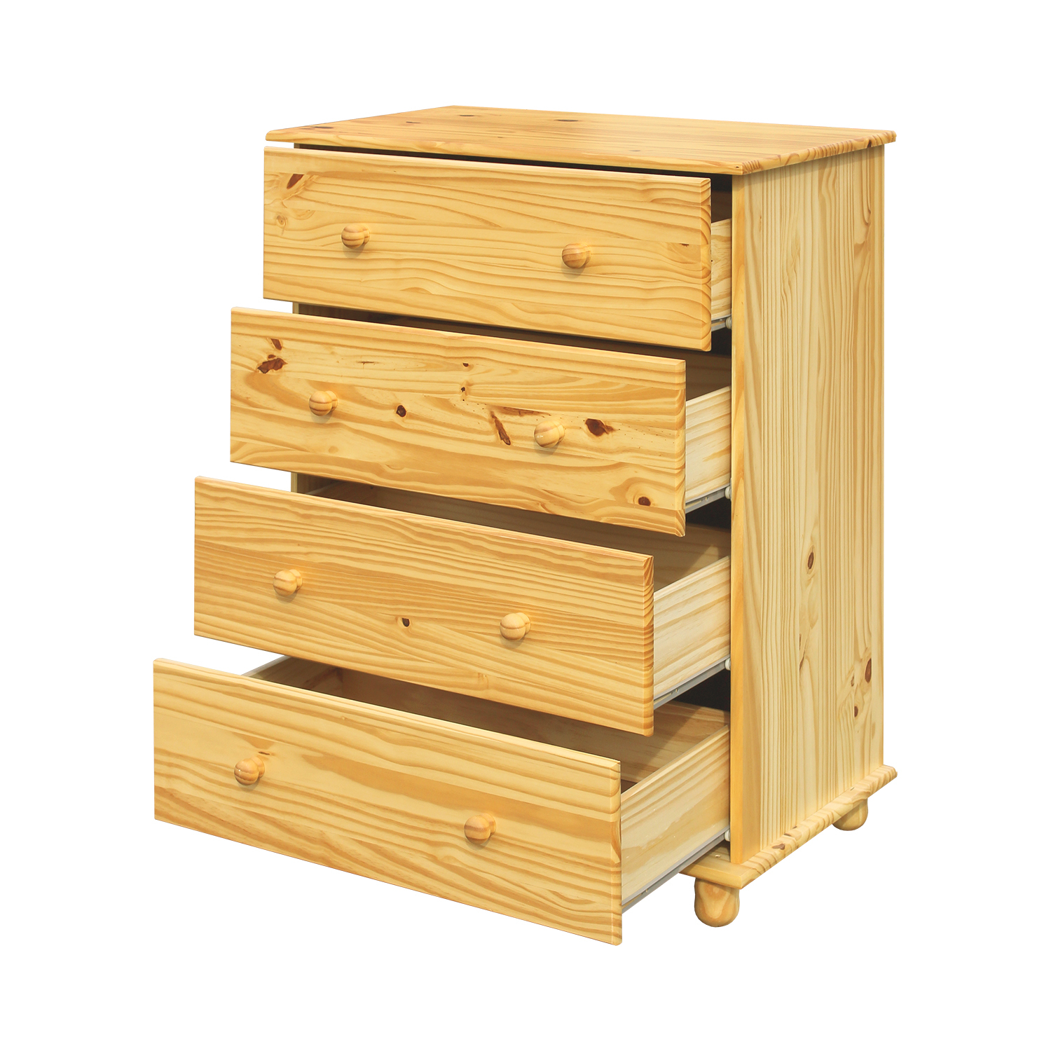 materiál masiv borovice, lakované provedení 4 široké zásuvky s kovovými pojezdy, hloubka zásuvky 33,5 cm
