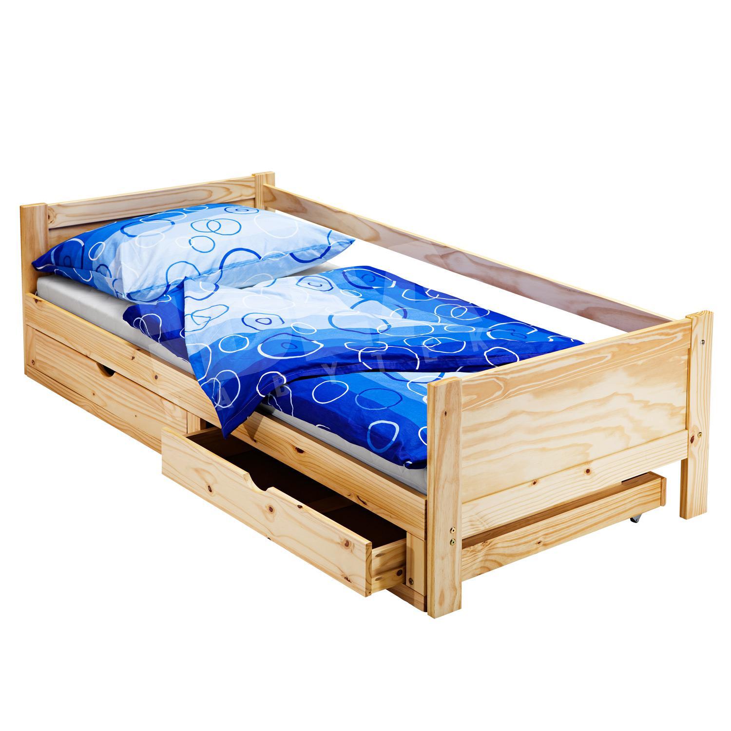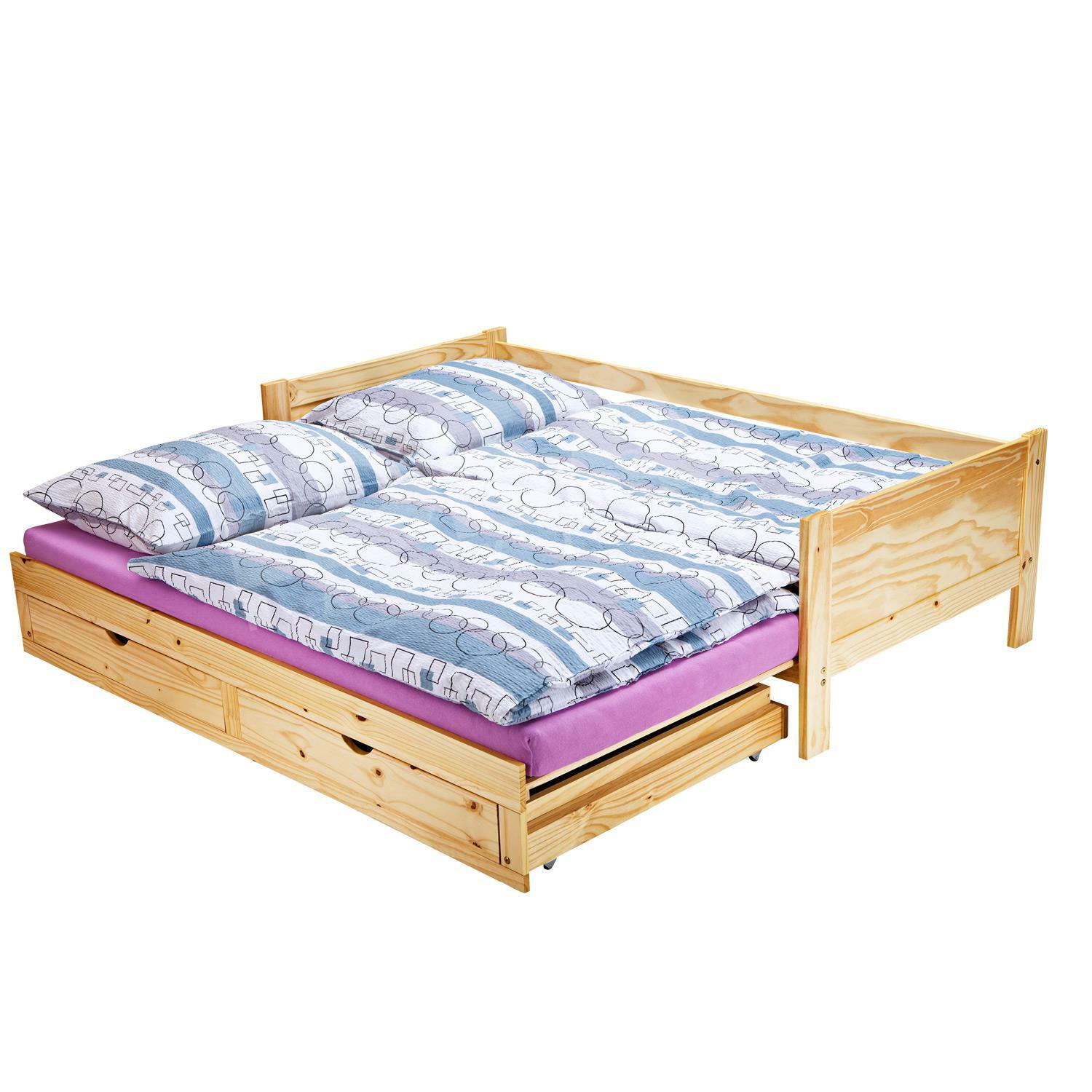 materiál masiv borovice, lakované provedení rozložitelná na dvoulůžko 180 × 200 cm, výška sedu 38 cm cena včetně roštů ale bez matrací doporučený rozměr matrací 90 × 200 cm (M2, M5, M9, M12, M24, M26)