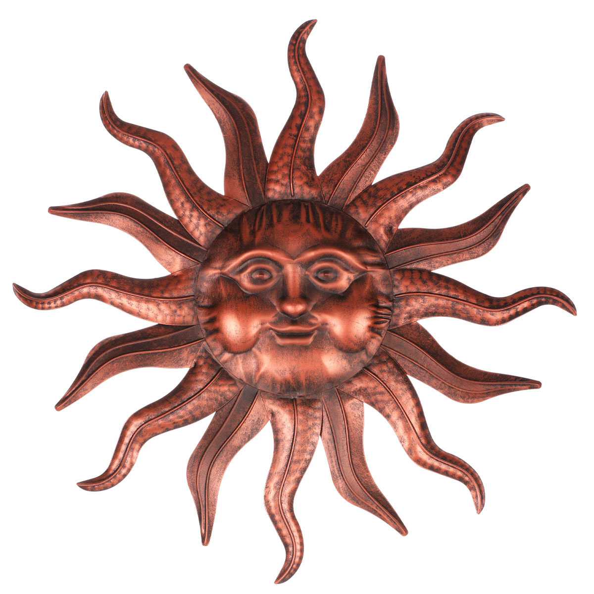 Nástěnná dekorace ve tvaru slunce je vyrobena z kovu v měděném odstínu, který dodává teplý a výrazný vizuální efekt. Detailní zpracování s výraznými paprsky a plastickým obličejem vytváří zajímavý dekorativní prvek vhodný pro různé interiéry i venkovní prostory. Díky možnosti zavěšení se snadno umisťuje na zeď a oživí každý prostor. Povrch s jemnou patinou podtrhuje rustikální charakter dekorace. Je ideální pro doplnění stěn v obytných i komerčních prostorách.