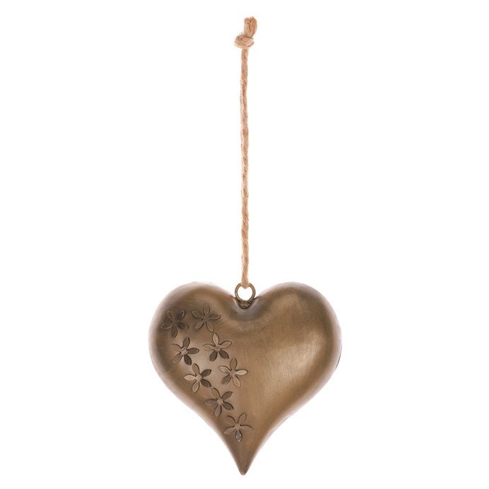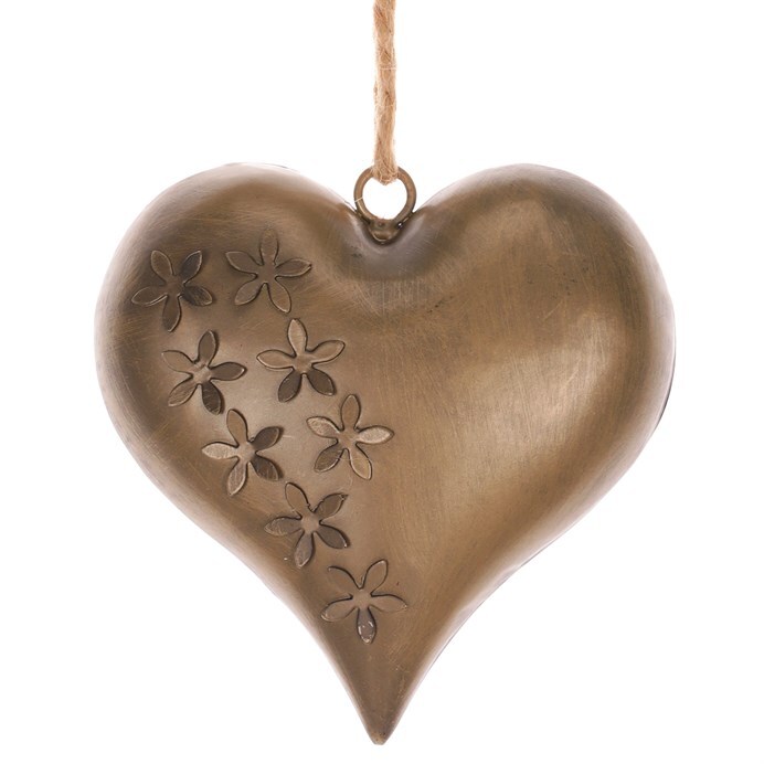 Kovová závěsná dekorace v podobě srdce měděné barvy představuje mnohem více než jen vizuálně atraktivní ozdobu. Srdce je symbolem lásky, vášně a souznění, což tuto dekoraci činí mimořádně významnou. Jeho elegantní provedení a květinový design zvýrazňují krásu a jedinečnost srdce jako symbolu. Poutko na horní straně umožňuje provlečení provázku nebo řetízku. Vyberte mu takové místo, kde pro vás bude mít největší význam, a kde zároveň bude vynikat jeho půvab a význačnost. Srdce v tomto provedení bude výrazným estetickým prvkem ve vašem interiéru, ale také může sloužit jako nádherný dárek z lásky.