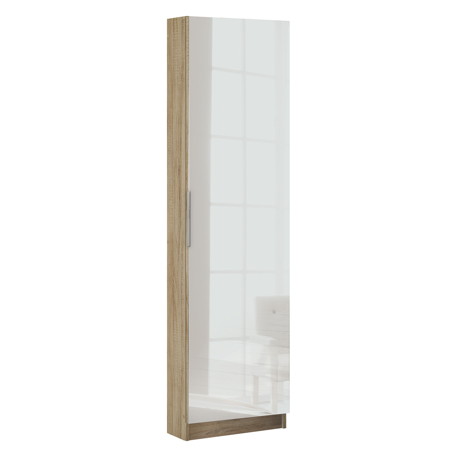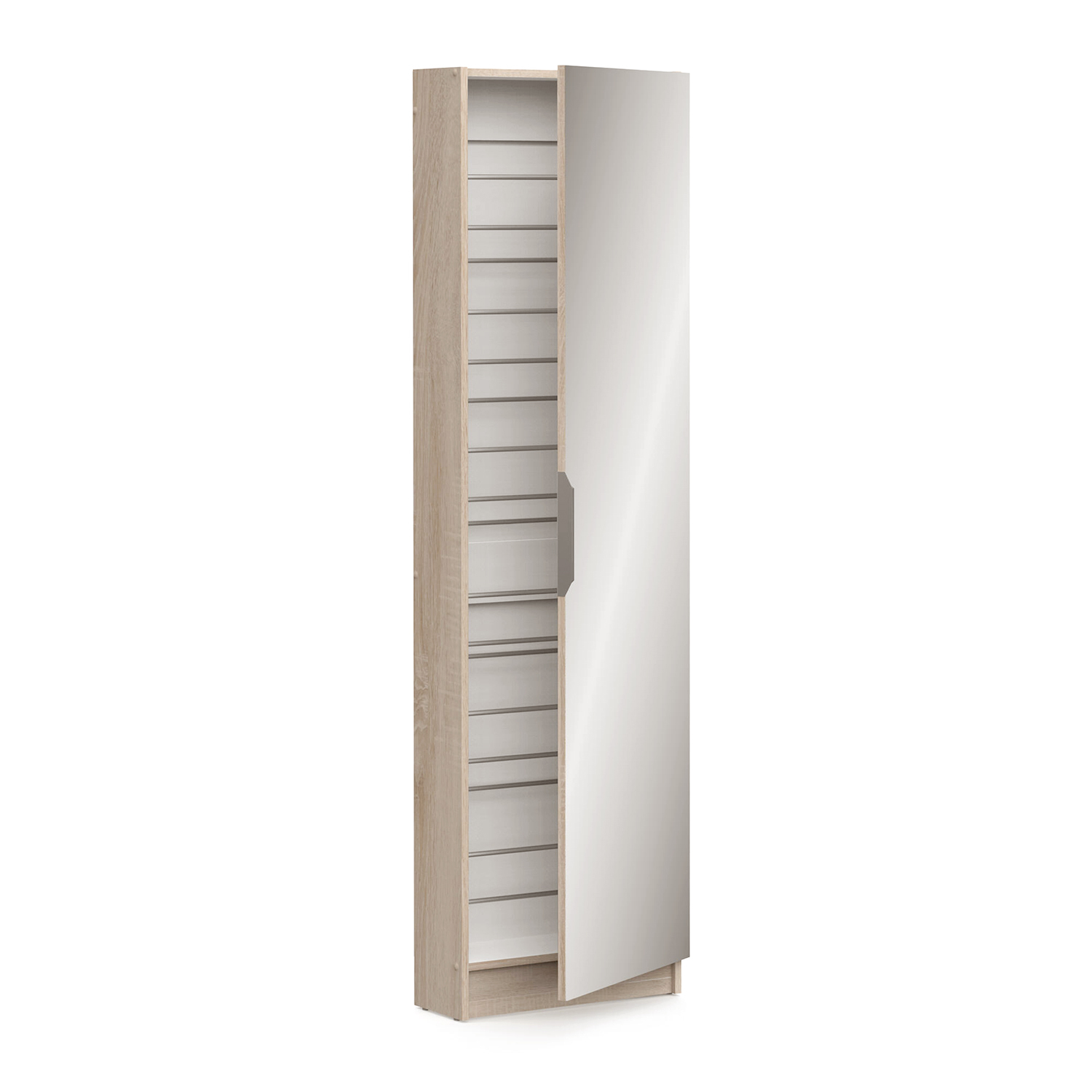 barevné provedení dub Sonoma na dveřích zrcadlo 50 × 173 cm, kovová úchytka montáž možná na levou i pravou stranu 6 úrovní pro 12 párů bot