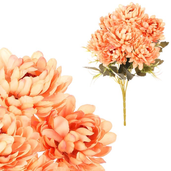 Kytice z umělých oranžových chryzantém je jedinečnou dekorací, která přináší nekonečnou krásu a potěšení. Je skvělou volbou pro ty, kteří chtějí mít krásné květiny bez starostí a péče. Nemusíte se trápit zaléváním a případně tím, že vám brzy uvadne, protože jako umělá vydrží po celou dobu v plné kráse. Bez ohledu na roční období, vám poskytne oslnivou výzdobu každého místa nebo vybrané události. Široký výběr květin podle druhů a barev umožňuje, aby si každý vybral tu, která nejlépe vyhovuje jeho preferencím a stylu. Všechny umělé rostliny jsou věrnou kopií svých živých protějšků, a udržují svou nádhernou podobu v plném květu po celý rok. Vytvořte si díky této dekoraci dokonalou atmosféru bez starostí a užívejte si nikdy nekončící květinovou výzdobu.