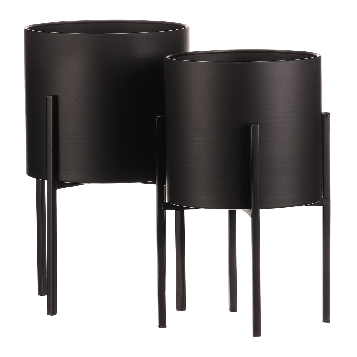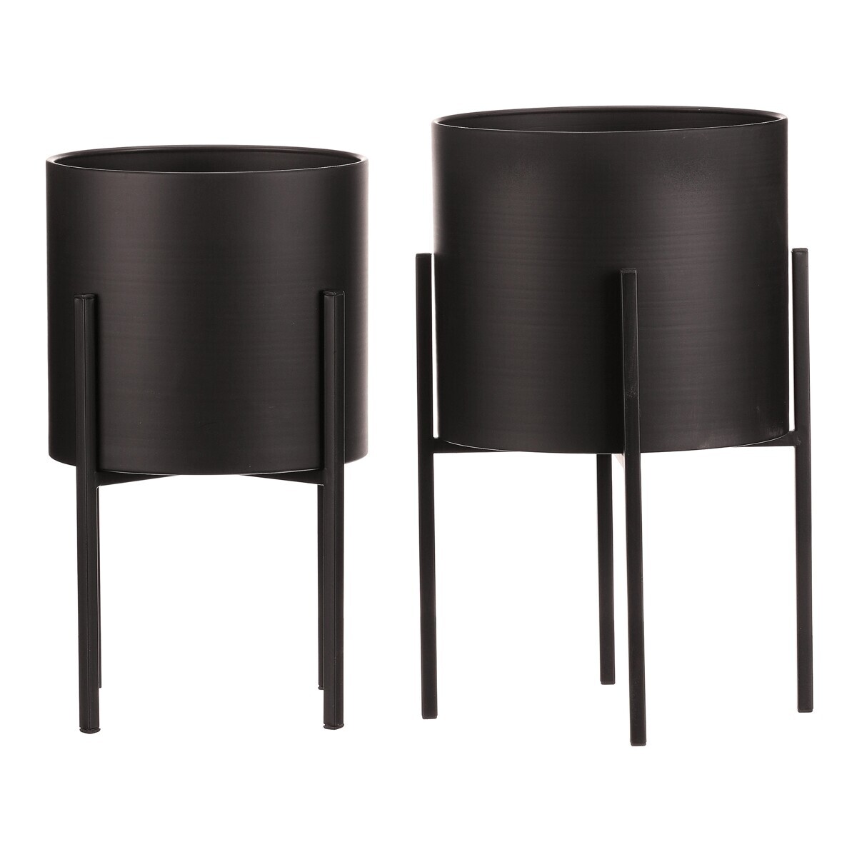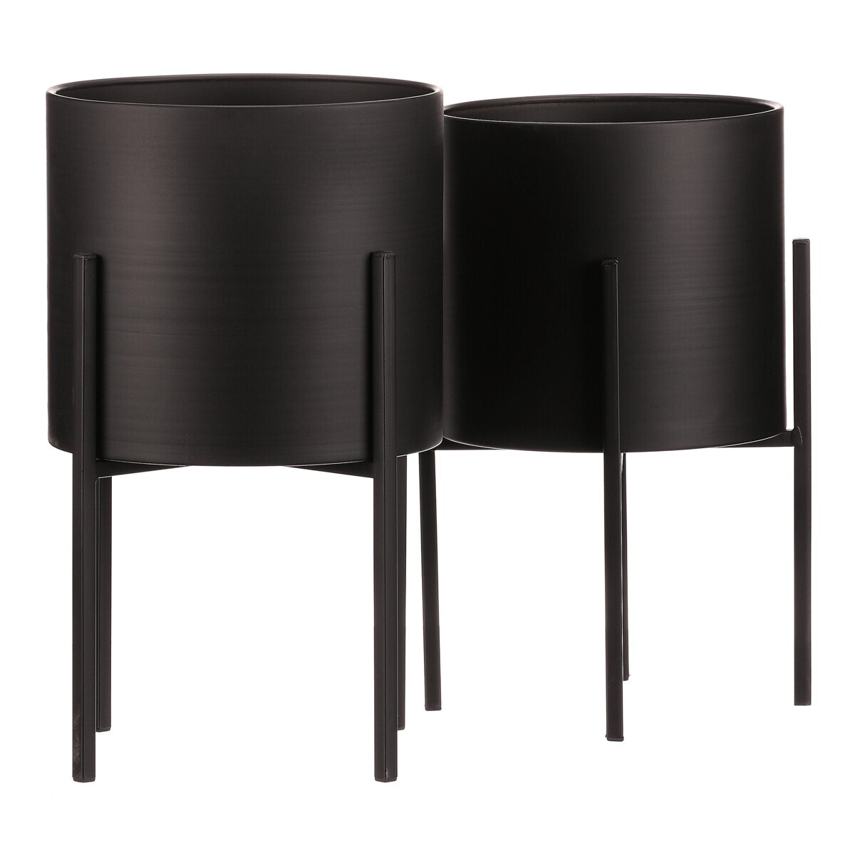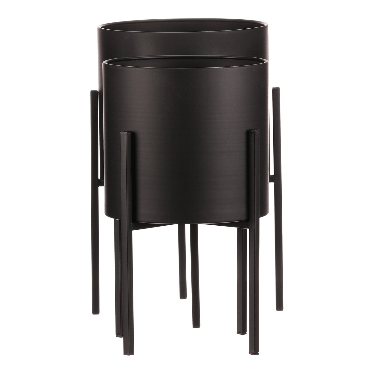 Set 2 ks kovových stojanů na květiny. interiérové provedení. Konstrukce a obal na květináč je kovový. Obal je v černém matu a nohy taktéž v černé matné barvě.