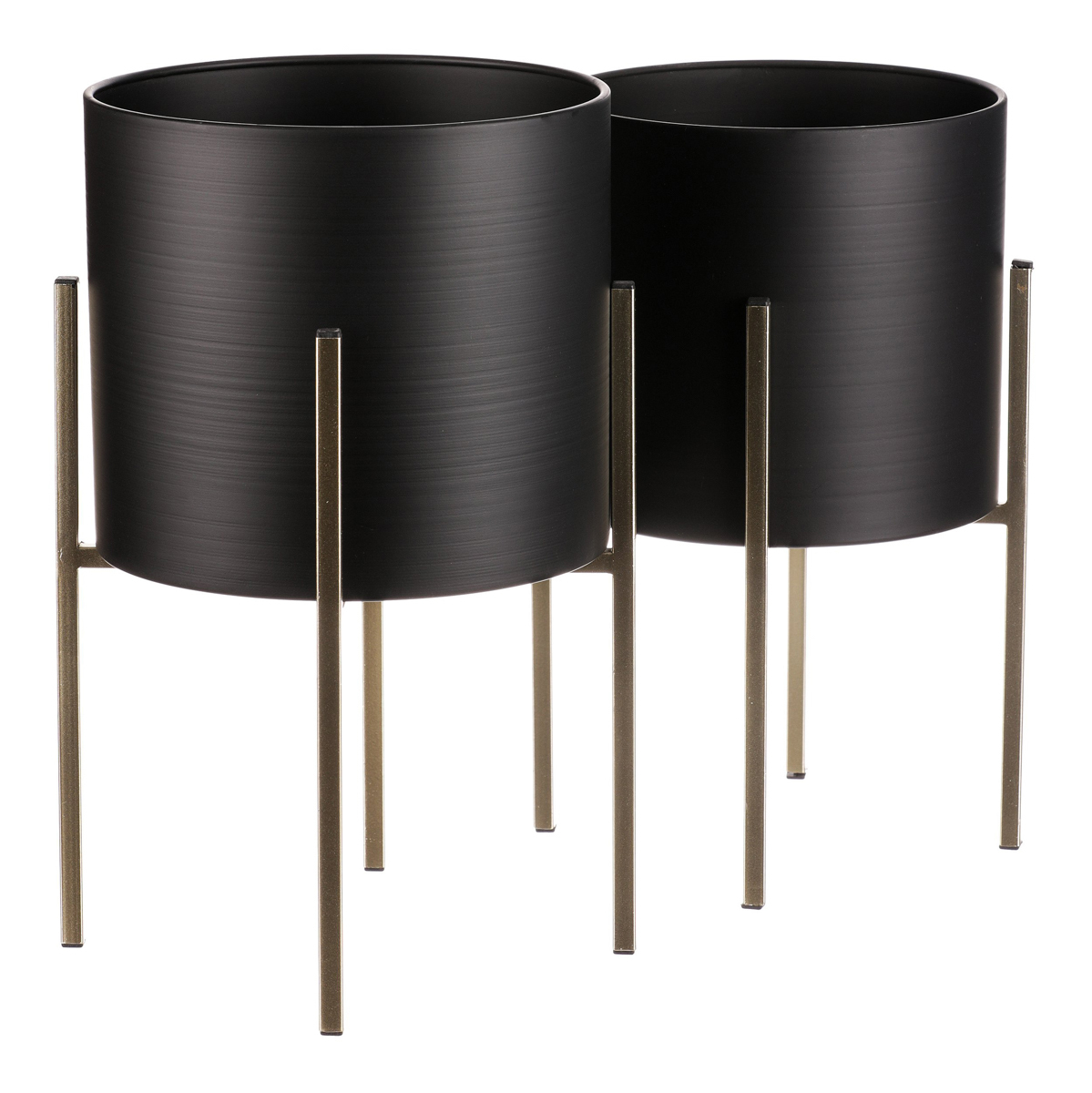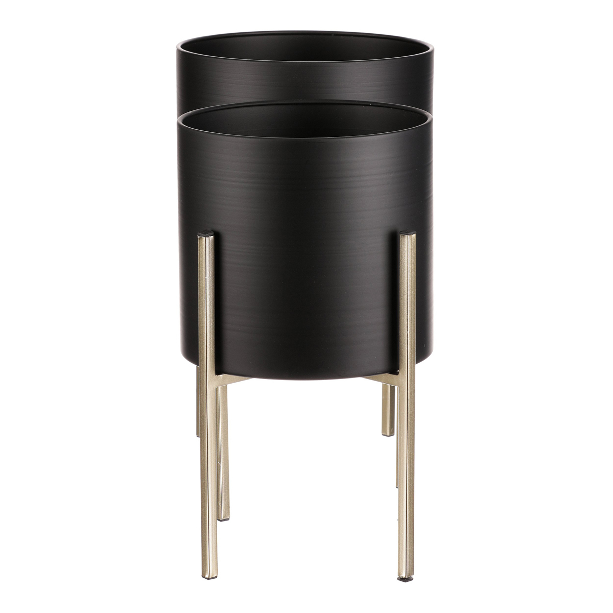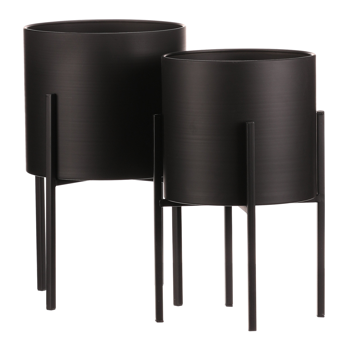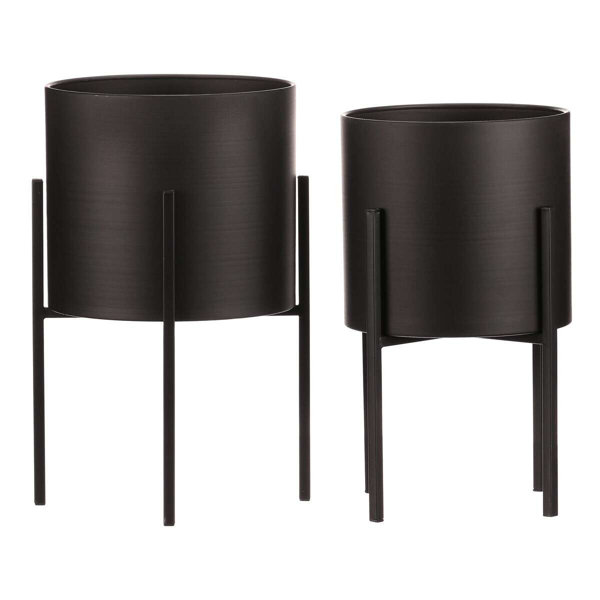 Set 2 ks kovových stojanů na květiny. interiérové provedení. Konstrukce a obal na květináč je kovový. Obal je v černém matu a nohy taktéž v černé matné barvě.