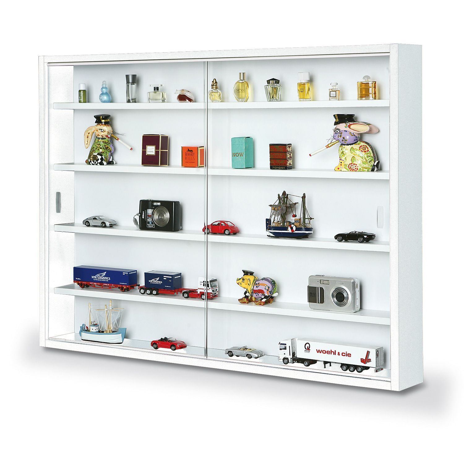 barevné provedení bílá 2 posuvná bezpečnostní skla, 4 variabilní poličky