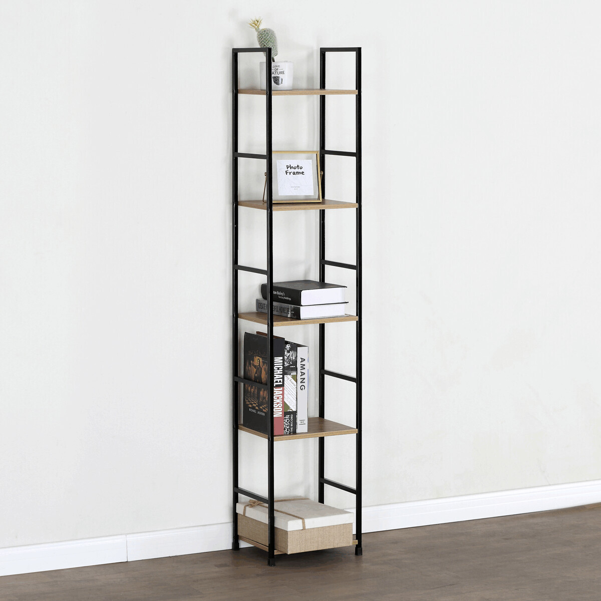 Regál s pěti policemi nabízí praktický odkládací prostor vhodný pro knihy, dekorace i další drobnosti. Police jsou vyrobeny z MDF desek s dubovým dekorem, které doplňuje pevná kovová konstrukce v černém laku, jež zajišťuje stabilitu a dlouhou životnost. Otevřená konstrukce umožňuje snadný přístup ke všem položkám a zároveň působí vzdušně v interiéru. Díky kombinaci přírodních odstínů dubu a černé barvy kovu se regál hodí do moderních i industriálních prostor. Výška a rozměry polic jsou navrženy tak, aby pojaly různé typy předmětů a zároveň šetřily místo.