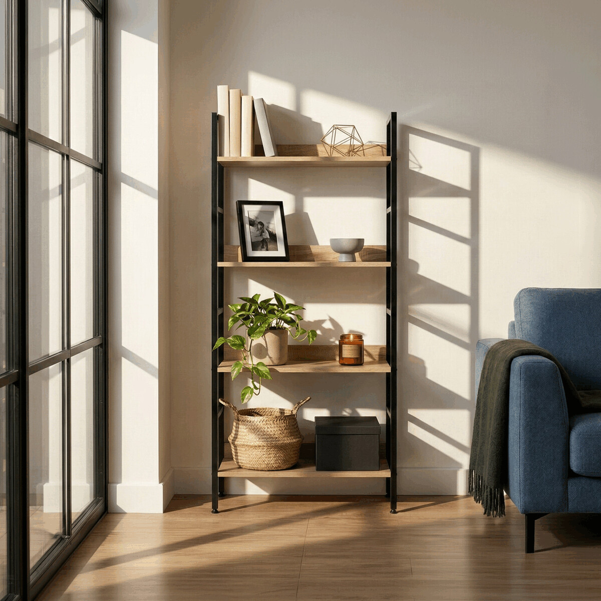 Regál s čtyřmi policemi v dekoru dub nabízí praktický odkládací prostor pro různé předměty v domácnosti či kanceláři. Police jsou vyrobeny z MDF desek s povrchovou úpravou v přírodních hnědých odstínech dubu, které dodávají nábytku příjemný a nadčasový vzhled. Stabilní kovová podnož v černém laku zajišťuje pevnost a dlouhou životnost regálu, přičemž otevřená konstrukce umožňuje snadný přístup a dobrou cirkulaci vzduchu kolem uložených věcí. Výška nožiček je nastavitelná, což pomáhá vyrovnat nerovnosti podlahy a zvyšuje stabilitu. Tento regál je vhodný pro uspořádání knih, dekorací i dalších drobných předmětů.