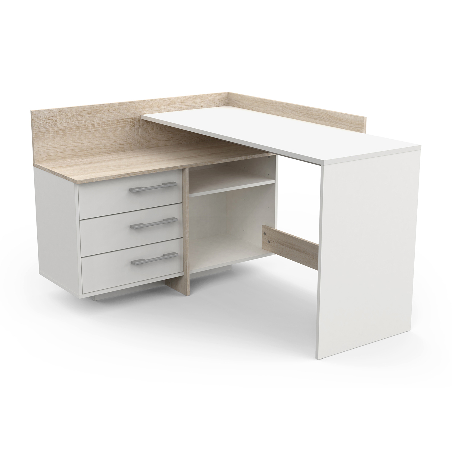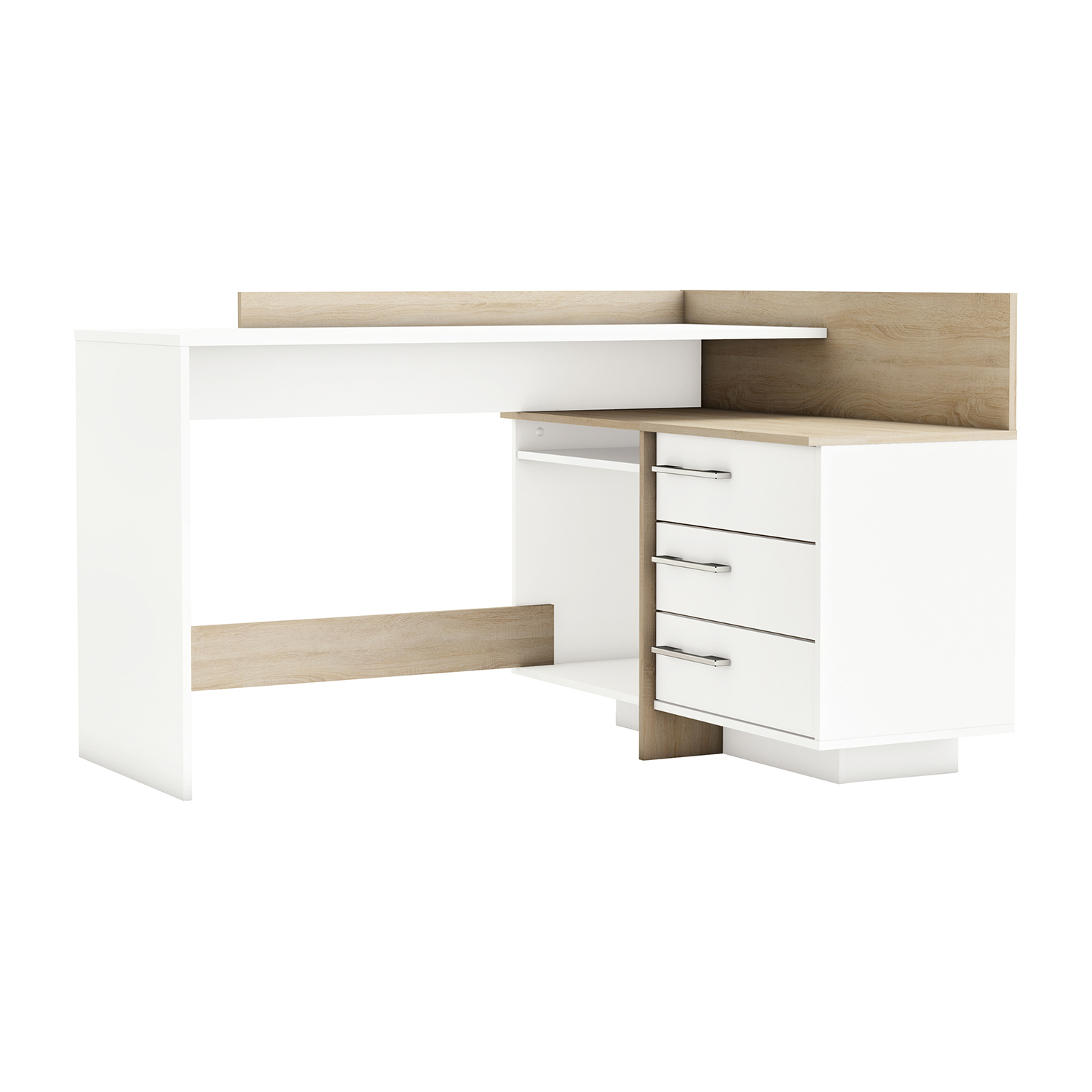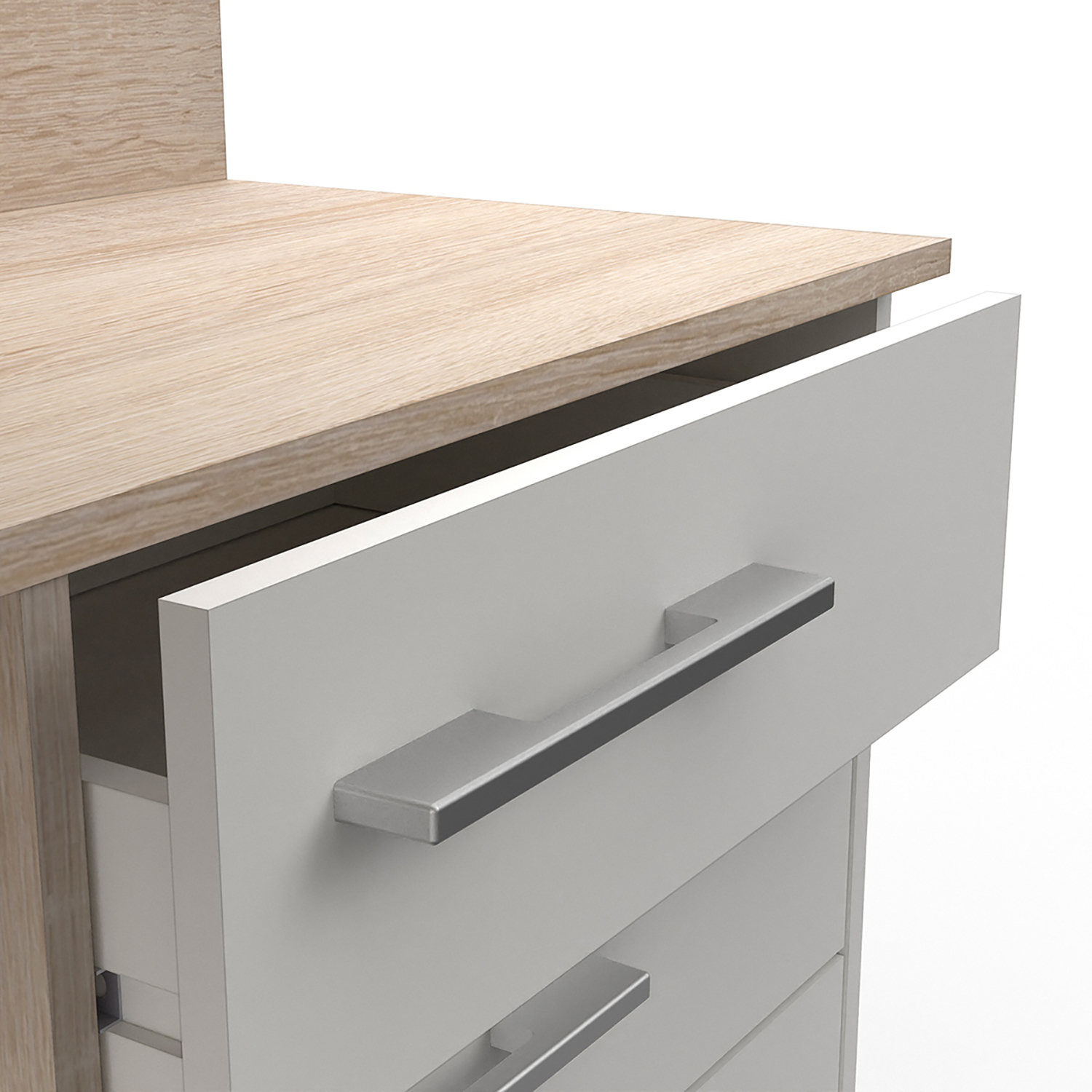 barevné provedení matná bílá / dub Sonoma možnost montáže na pravou i levou stranu, výška pracovní desky 77 cm 1 velká police, rozměr police (š/h) 51 × 39 cm 3 zásuvky s kovovými pojezdy, rozměr zásuvky (š/h/v) 47 × 31 × 9 cm stříbrné plastové úchytky