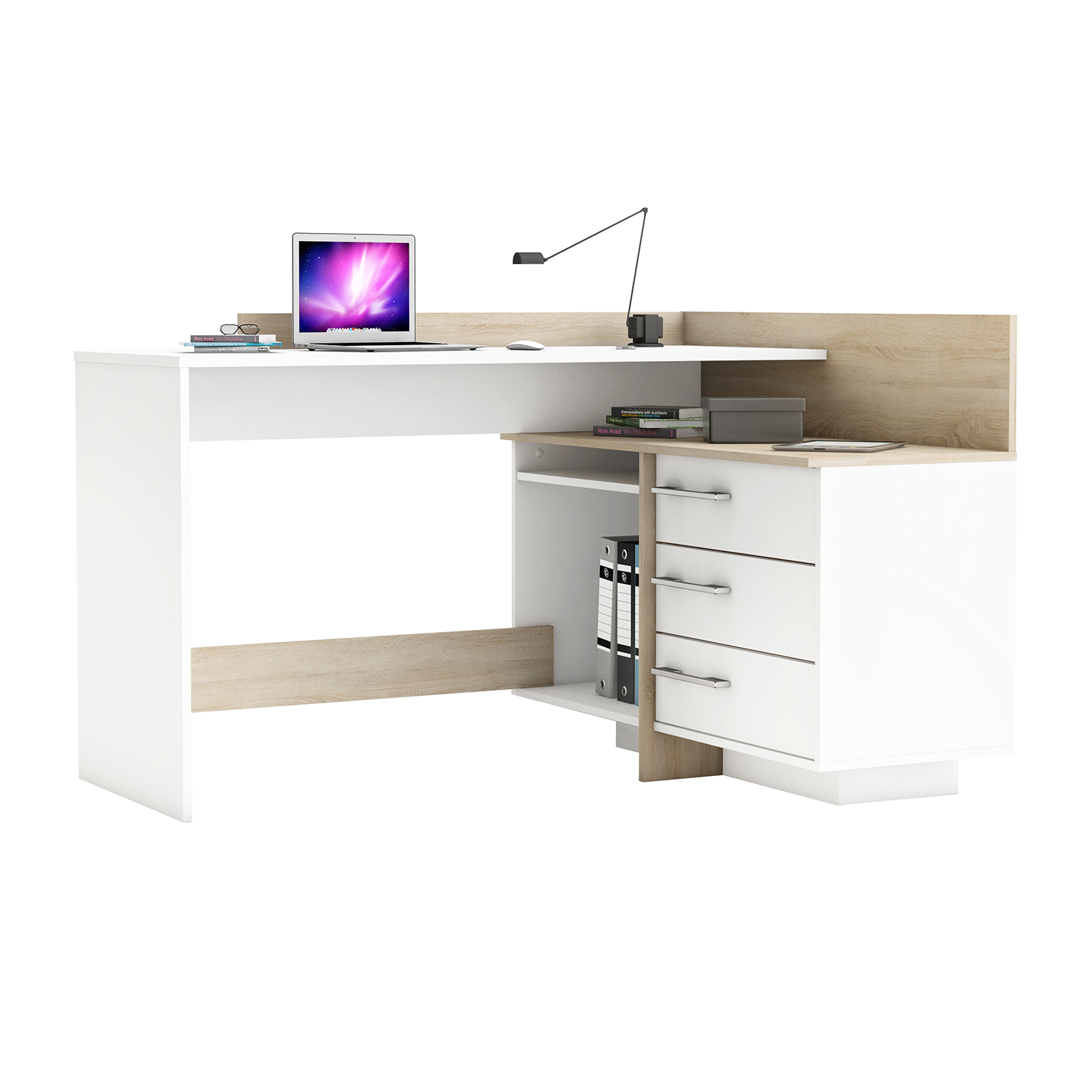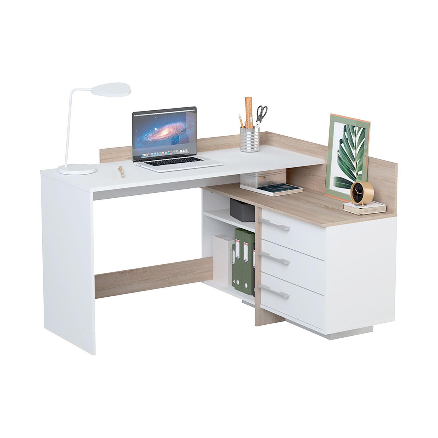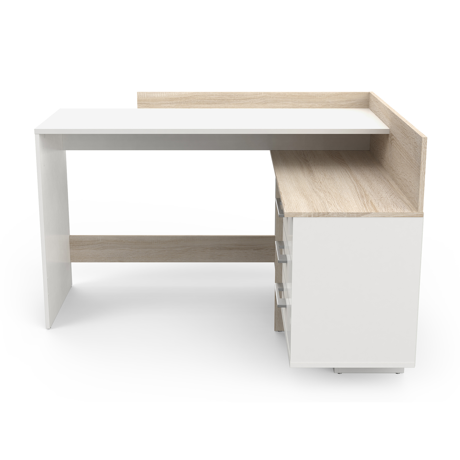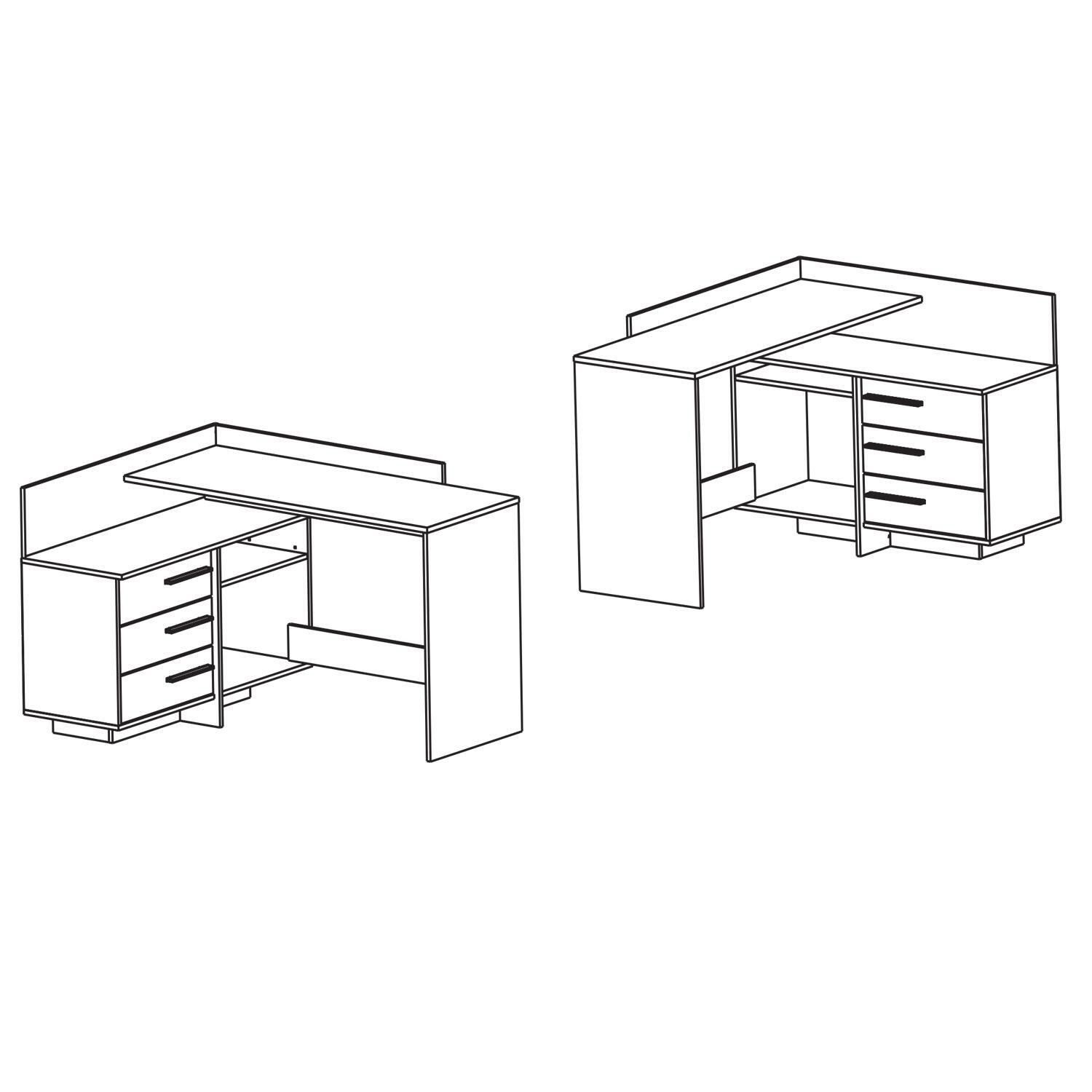 barevné provedení matná bílá / dub Sonoma možnost montáže na pravou i levou stranu, výška pracovní desky 77 cm 1 velká police, rozměr police (š/h) 51 × 39 cm 3 zásuvky s kovovými pojezdy, rozměr zásuvky (š/h/v) 47 × 31 × 9 cm stříbrné plastové úchytky