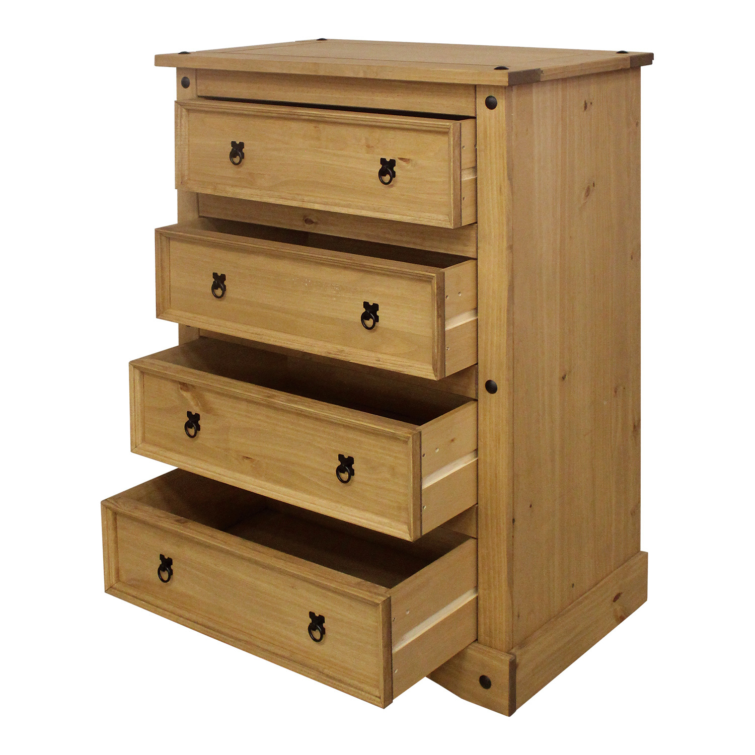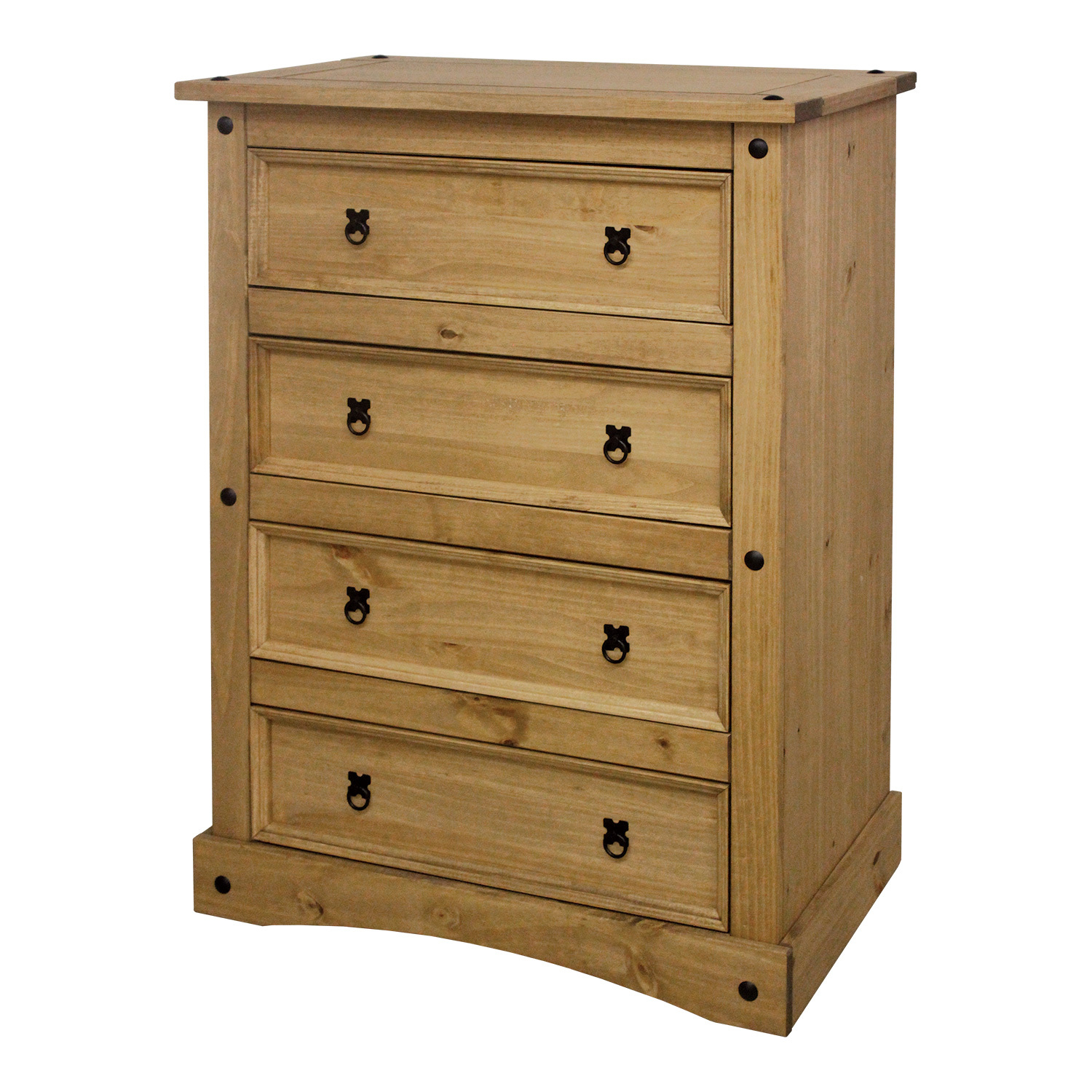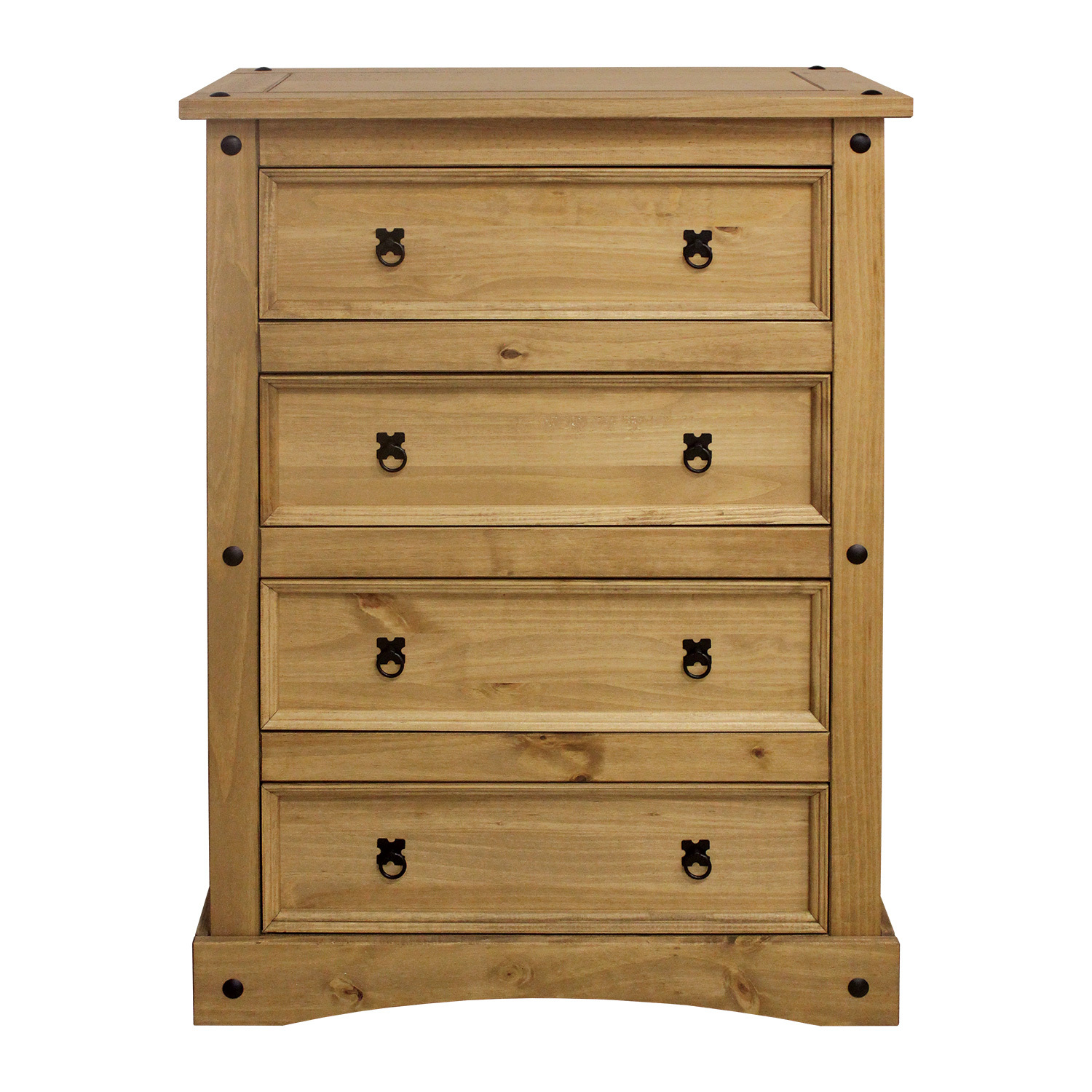 materiál masiv borovice voskovaná v medovém odstínu 4 velké zásuvky, kovové ozdobné úchytky součást sestavy Corona