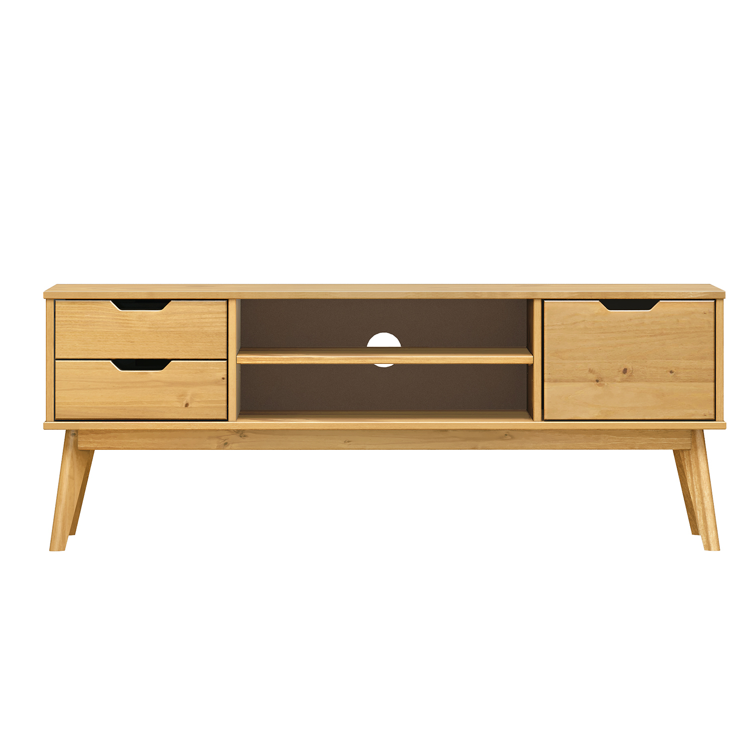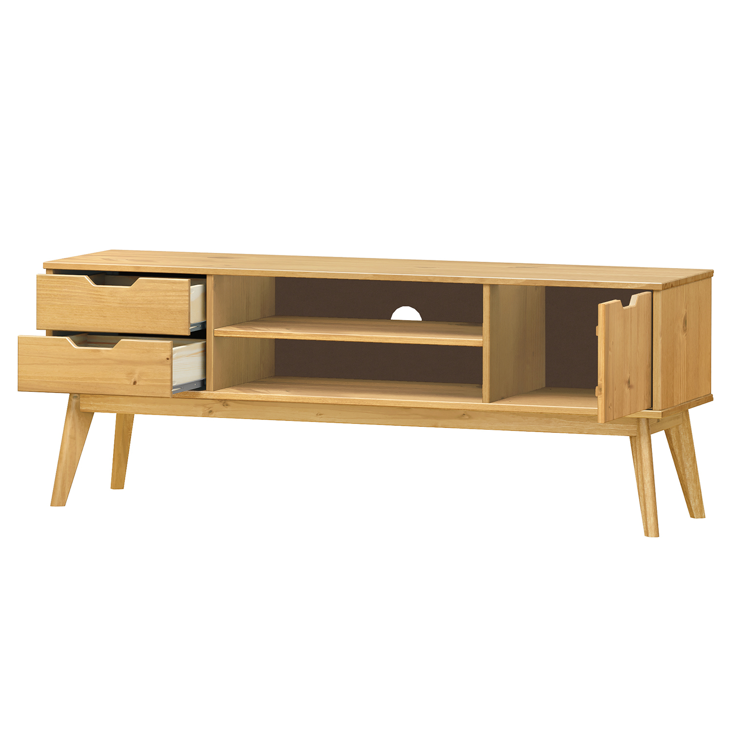 materiál masiv borovice voskovaná v medovém odstínu 2 zásuvky s kovovými pojezdy, 1 dvířka, 1 police otvor na protažení kabelů