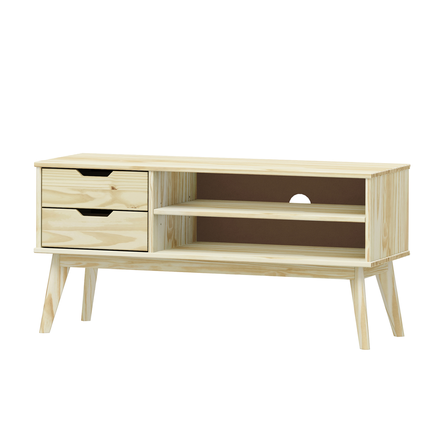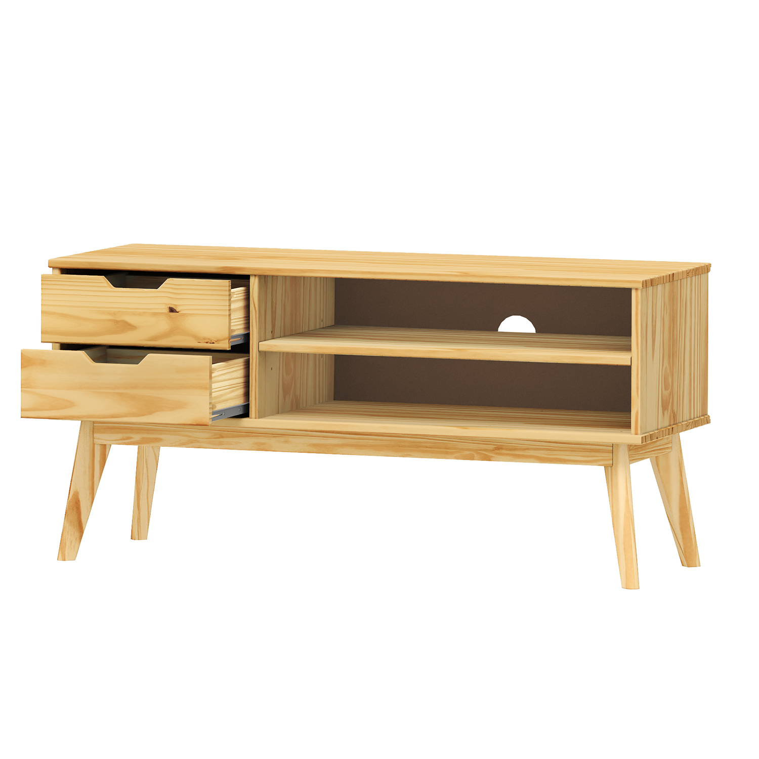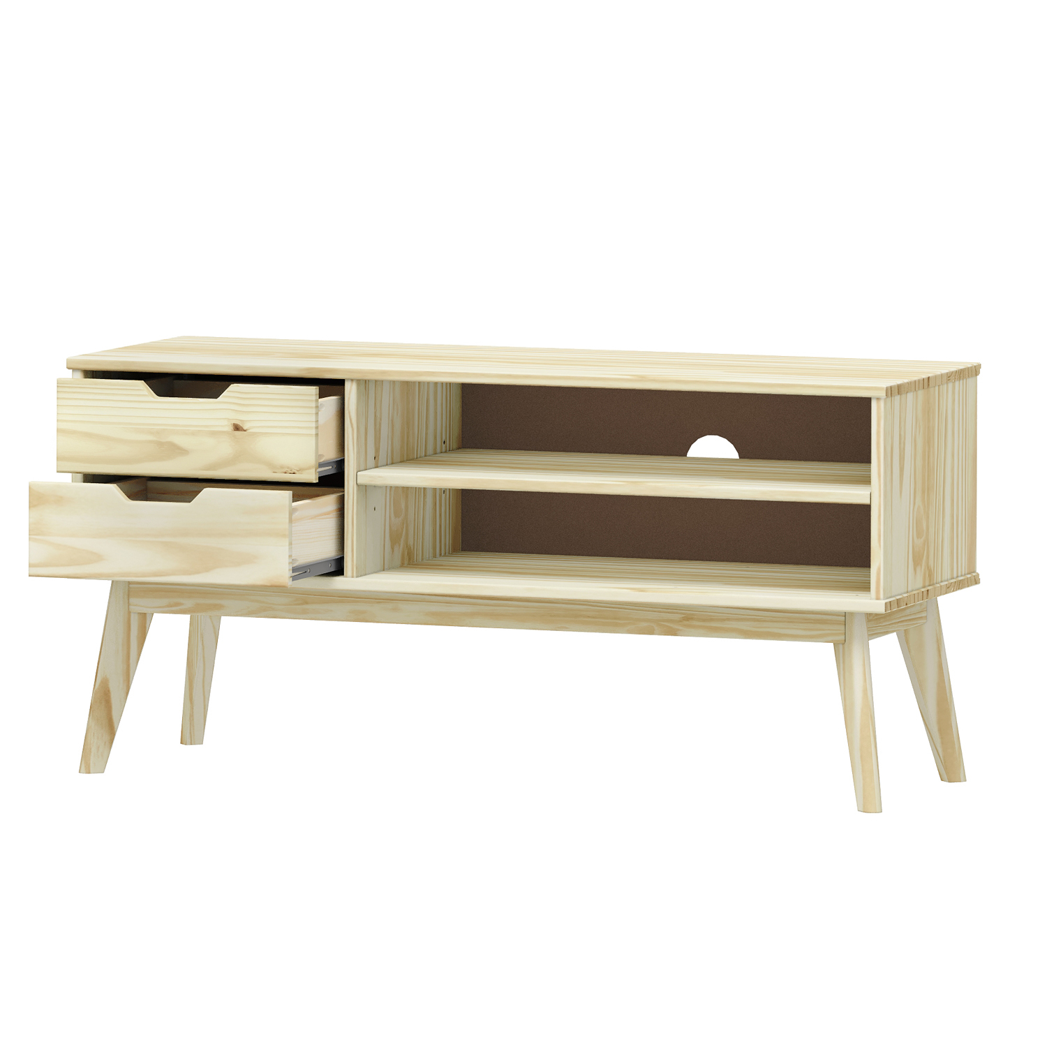 materiál masiv borovice, lakované provedení 2 zásuvky s kovovými pojezdy, 1 police otvor na protažení kabelů