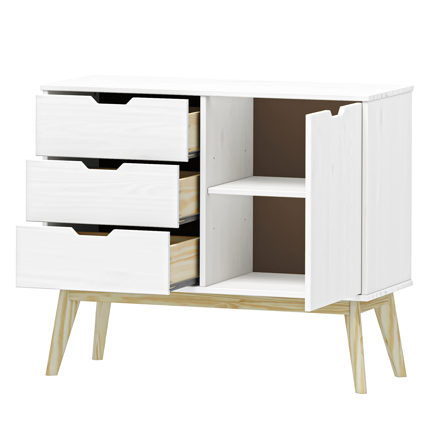 materiál masiv borovice, barevné provedení bílý lak 3 zásuvky s kovovými pojezdy, 1 dvířka, 1 police