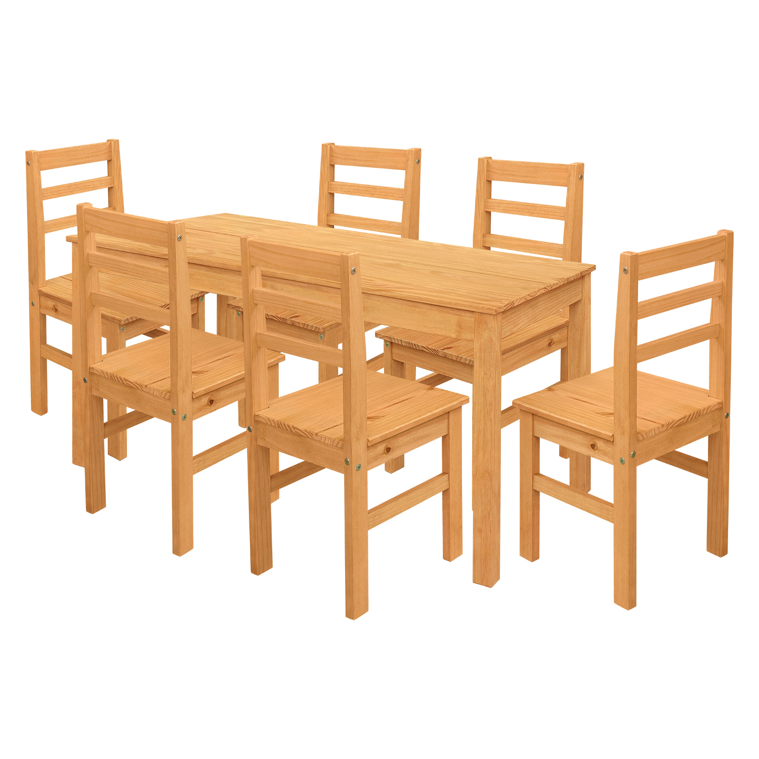 jídelní stůl 11164V a 6 jídelních židlí 1221V stůl i židle materiál masiv borovice voskovaná v medovém odstínu výška sedu židle 45 cm rozměr stolu (š/h/v): 150 × 75 × 76 cm rozměr židle (š/h/v): 42 × 46 × 91 cm