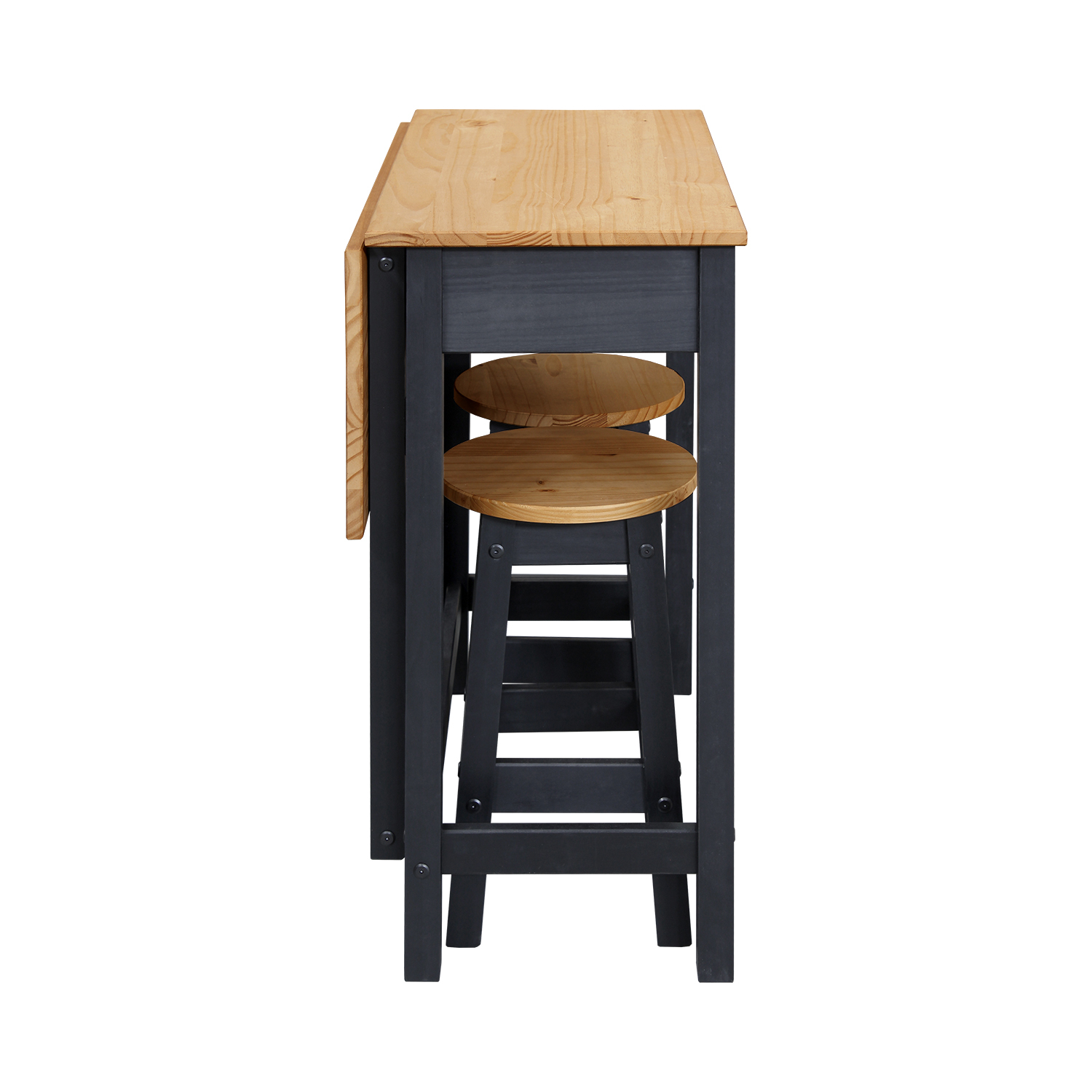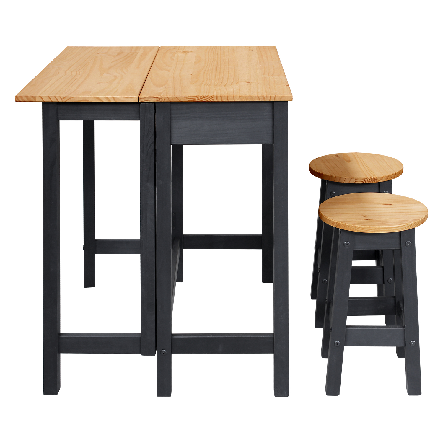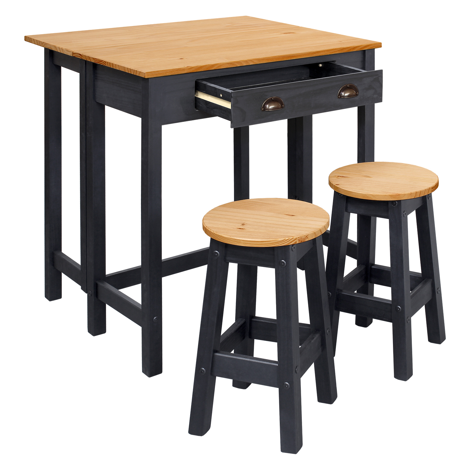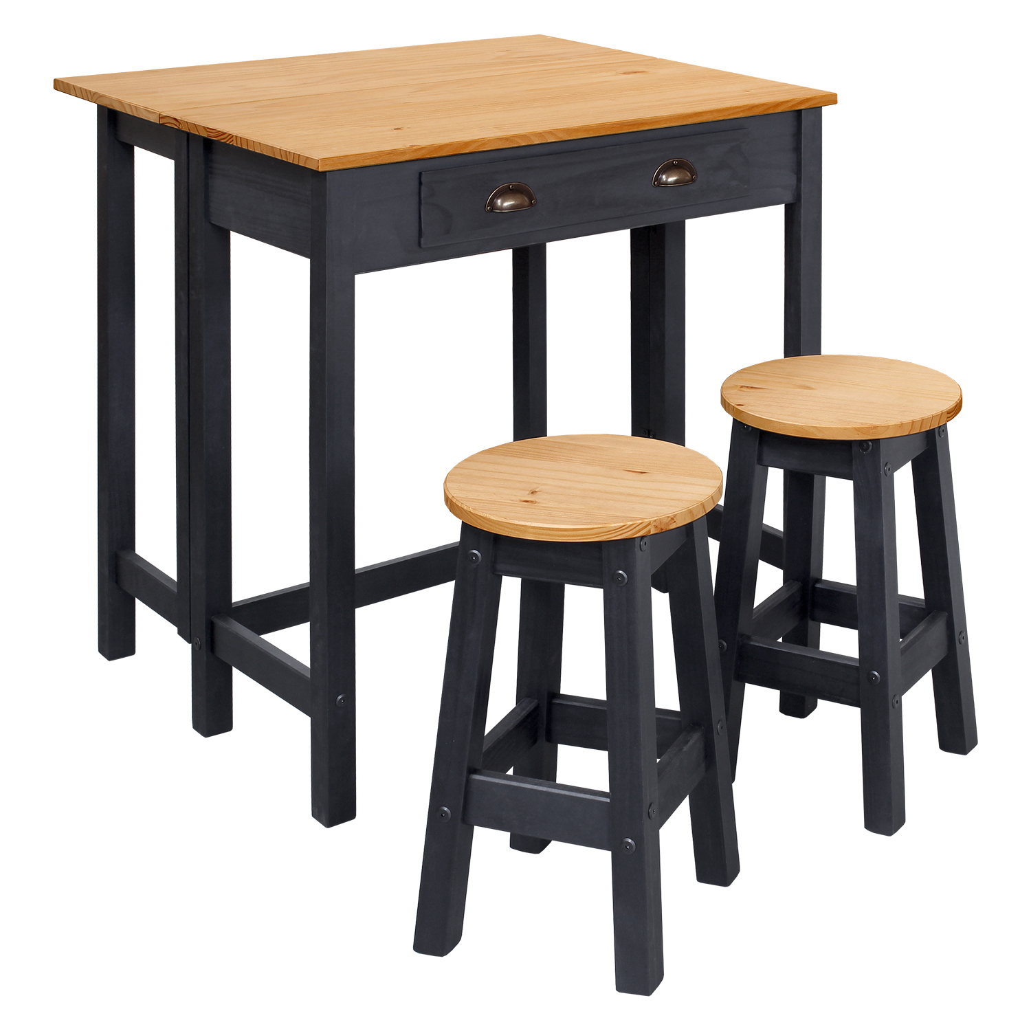 materiál masiv borovice voskovaná v medovém a černém odstínu skládací stůl se zásuvkou, dvě barové židličky rozměr složeného stolu (š/h/v) 80 × 42 × 84 cm rozměr rozloženého stolu (š/h/v) 80 × 72 × 84 cm rozměr židličky (š/h/v) 30 × 30 × 51 cm