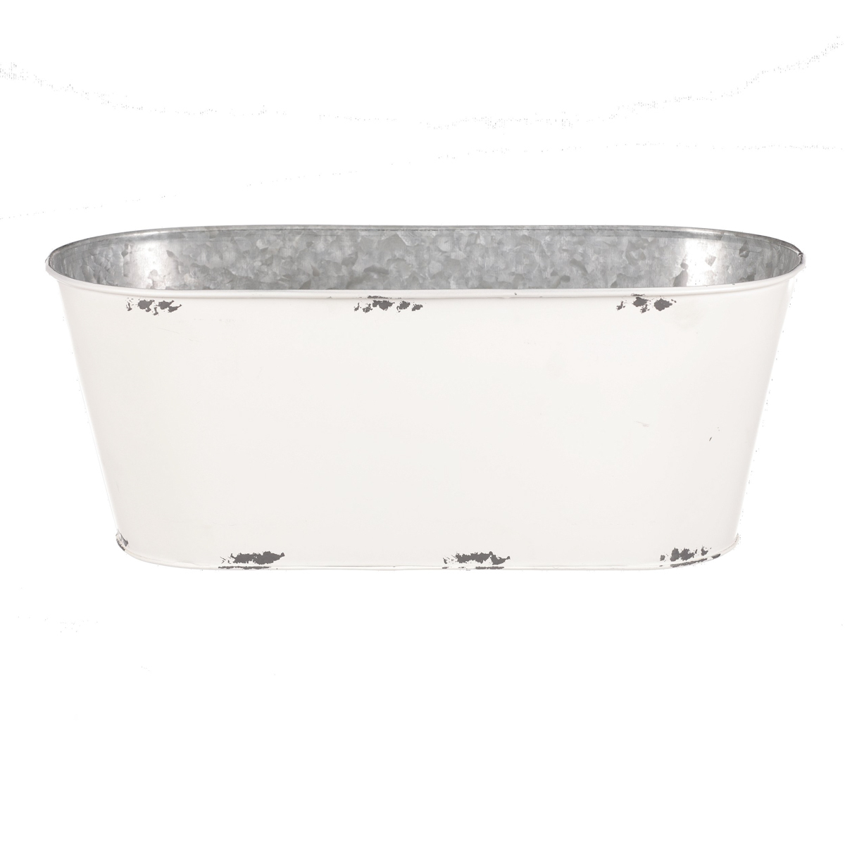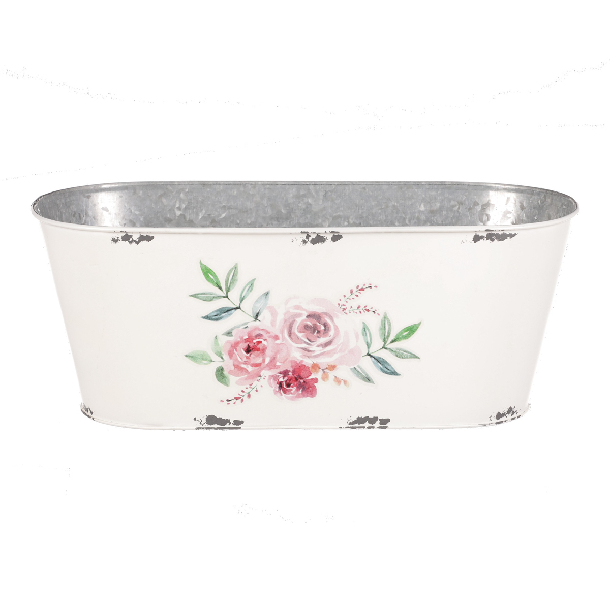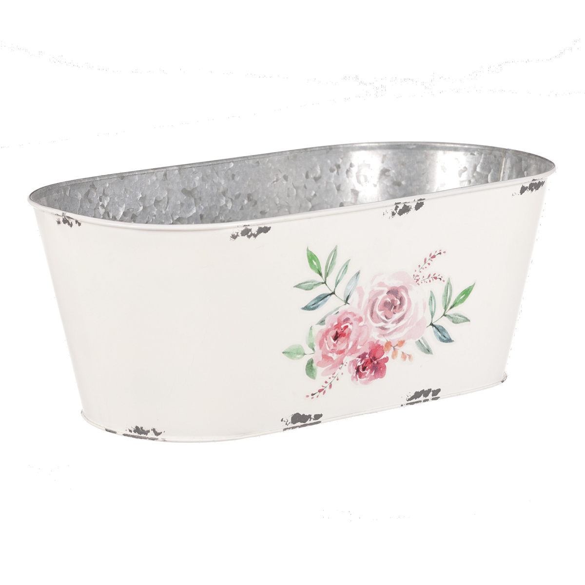 Tento krásný kovový obal na květiny v podobě truhlíku bude skvělým a netradičním doplňkem pro výzdobu vašeho oblíbeného prostoru. Svým vzhledem se hodí nejlépe pro jarní nebo letní sezónu, ale v podstatě jej můžete využívat celoročně. Je v bílé barvě a má oválný tvar. Na boku je barevný obrázek růží a jeho rozměr umožňuje zasazení i větších rostlin nebo sukulentů. Nechte vyniknout krásu své oblíbené květeny v jedinečném obalu a buďte i pro ostatní kolem vás skvělým příkladem dobrého vkusu.