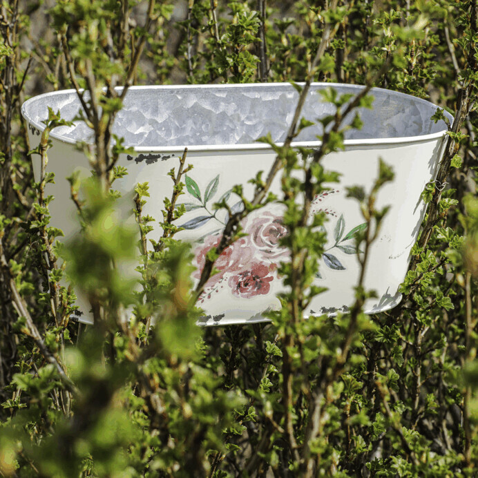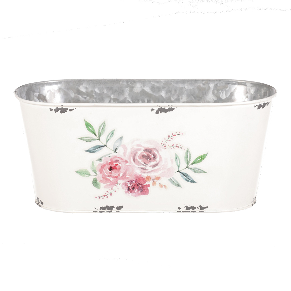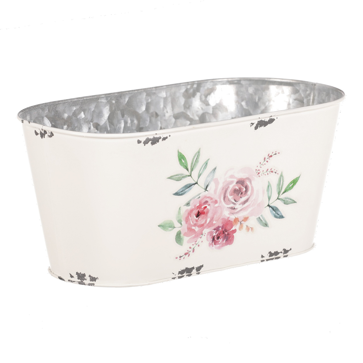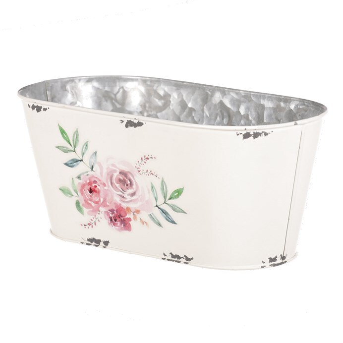 Tento krásný kovový obal na květiny v podobě truhlíku bude skvělým a netradičním doplňkem pro výzdobu vašeho oblíbeného prostoru. Svým vzhledem se hodí nejlépe pro jarní nebo letní sezónu, ale v podstatě jej můžete využívat celoročně. Je v bílé barvě a má oválný tvar. Na boku je barevný obrázek růží a jeho rozměr umožňuje zasazení i měnších rostlin nebo sukulentů. Nechte vyniknout krásu své oblíbené květeny v jedinečném obalu a buďte i pro ostatní kolem vás skvělým příkladem dobrého vkusu.