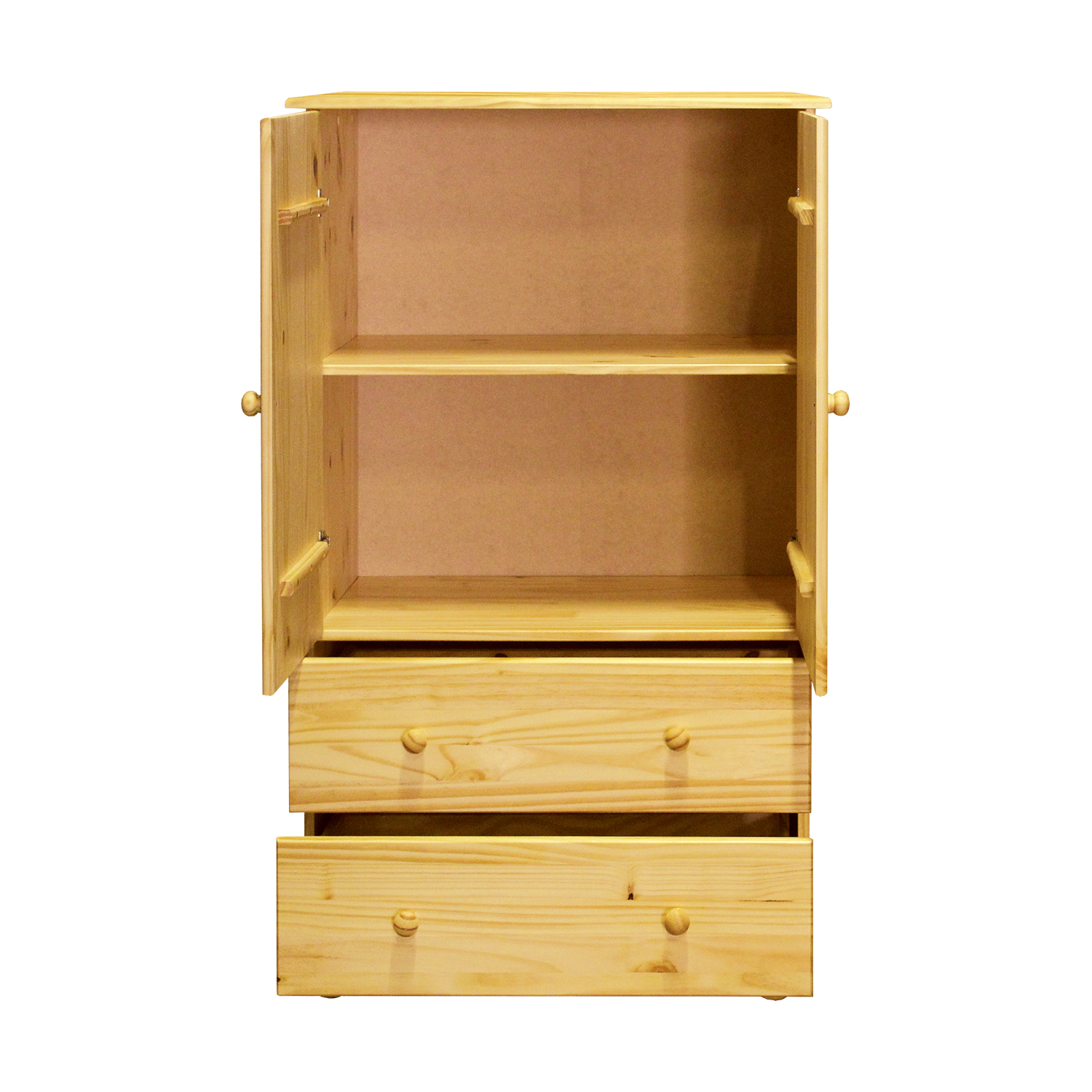materiál masiv borovice, lakované provedení dvoje dvířka, jedna variabilní police dvě zásuvky s kovovými pojezdy