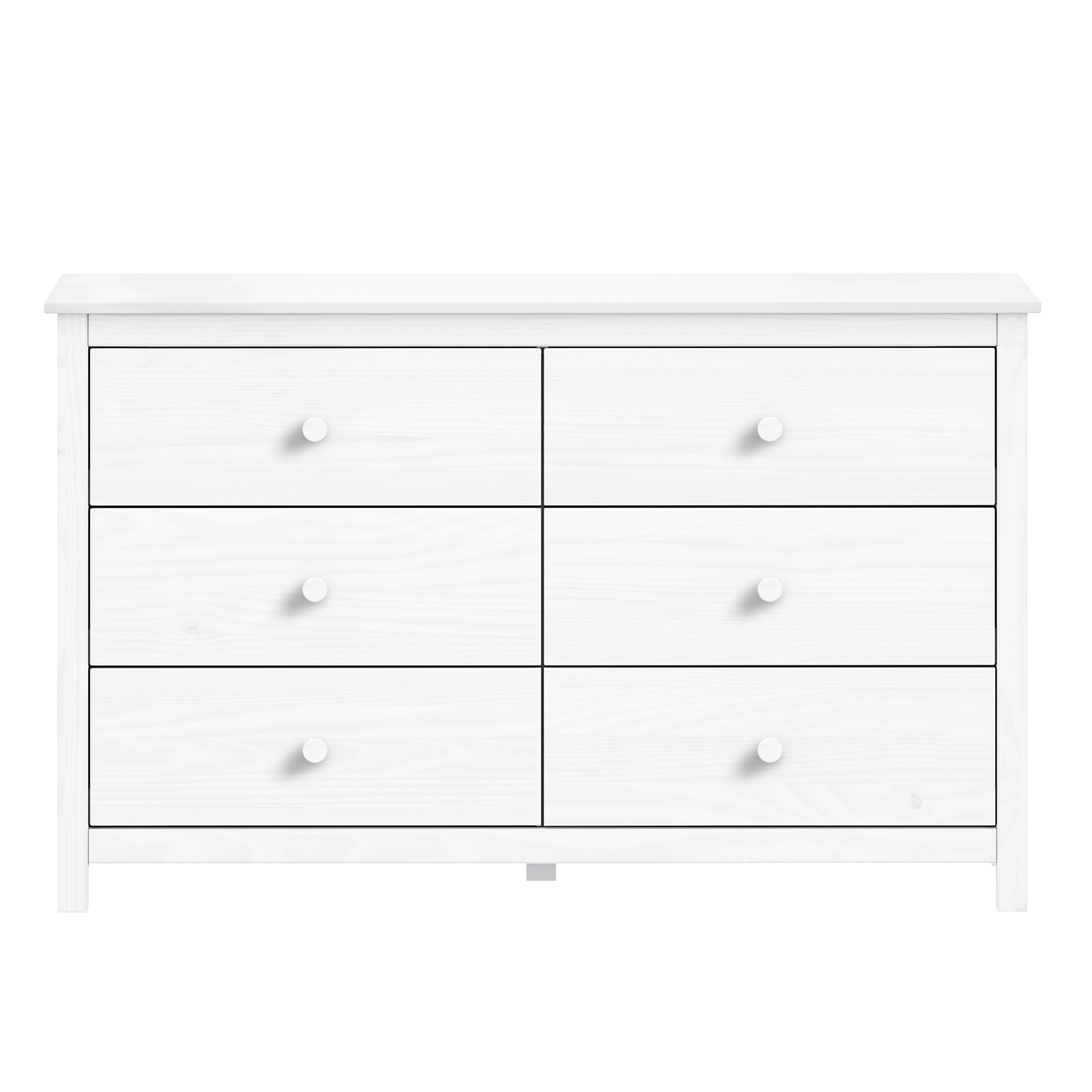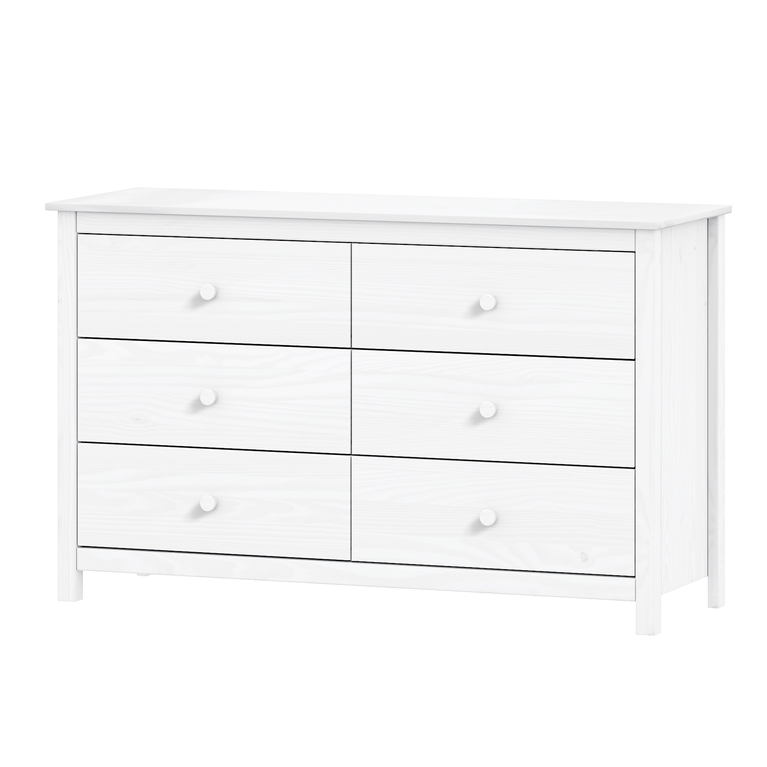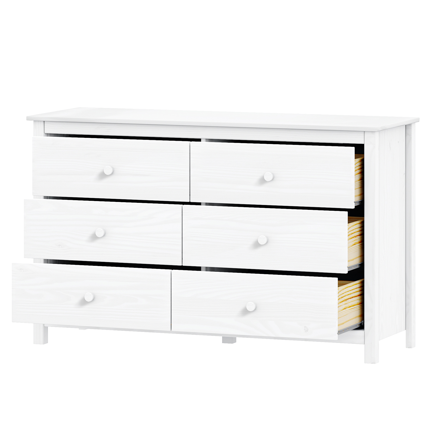 materiál masiv borovice, barevné provedení bílý lak šest zásuvek s kovovými pojezdy rozměr zásuvky (š/h/v) 52 × 33 × 19 cm