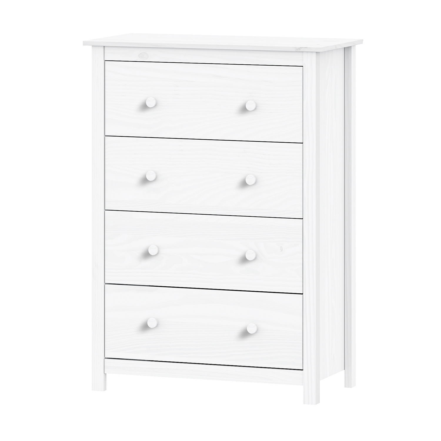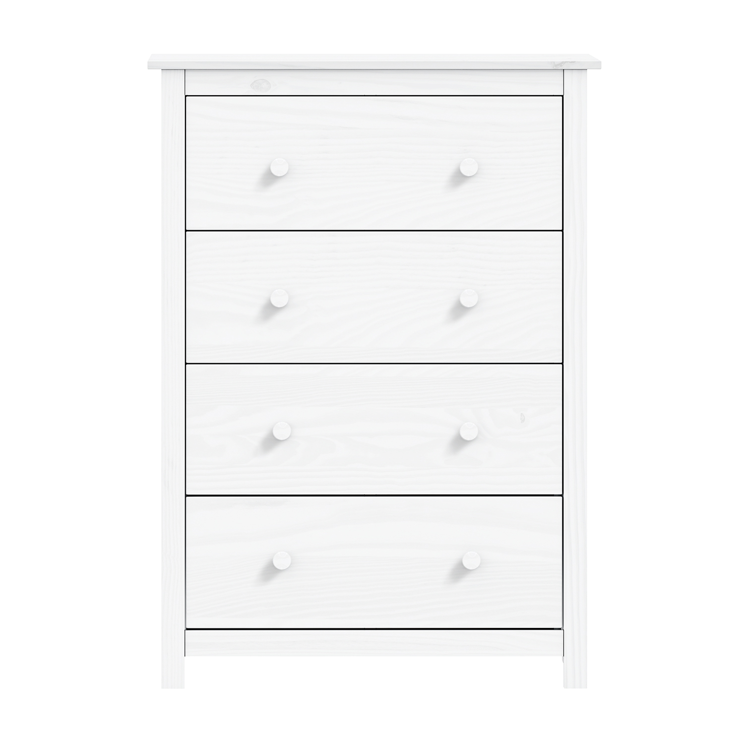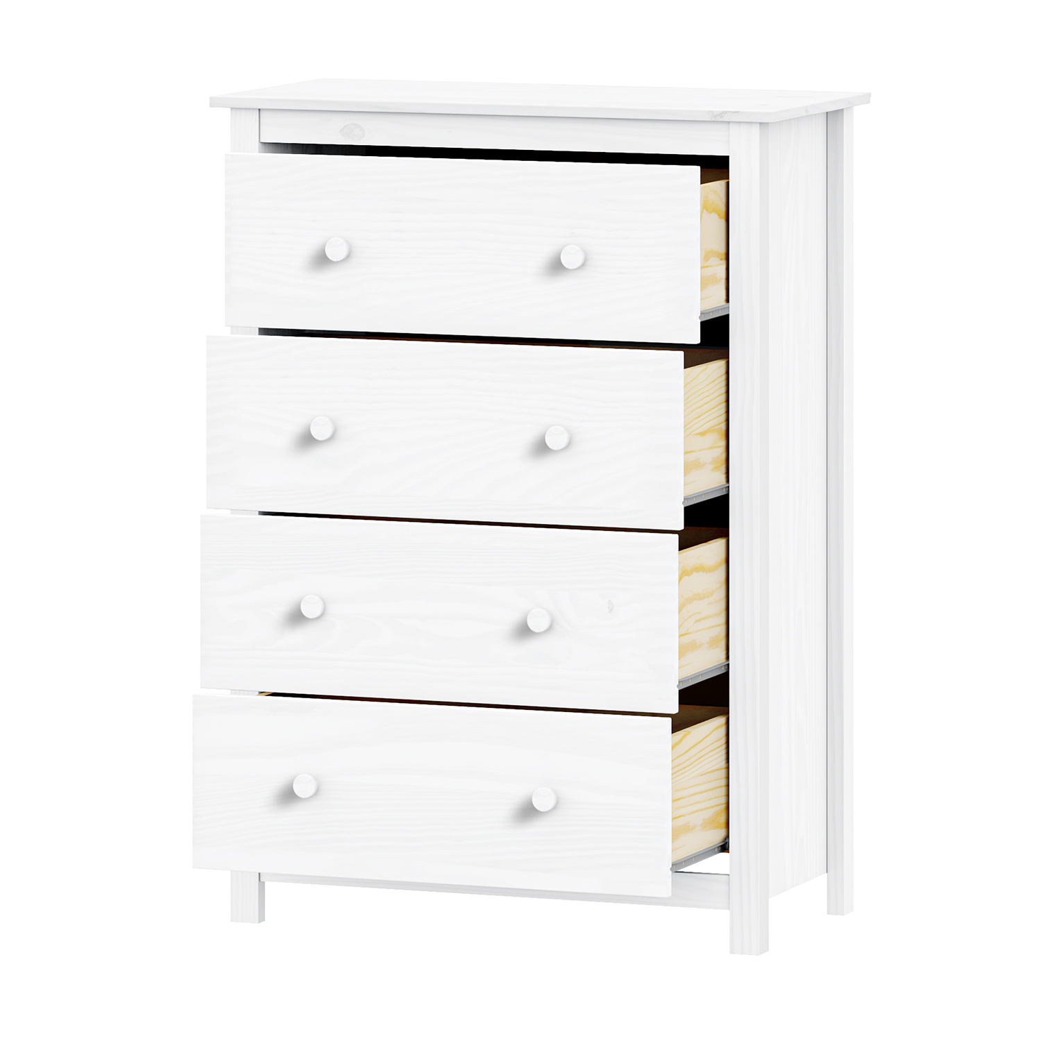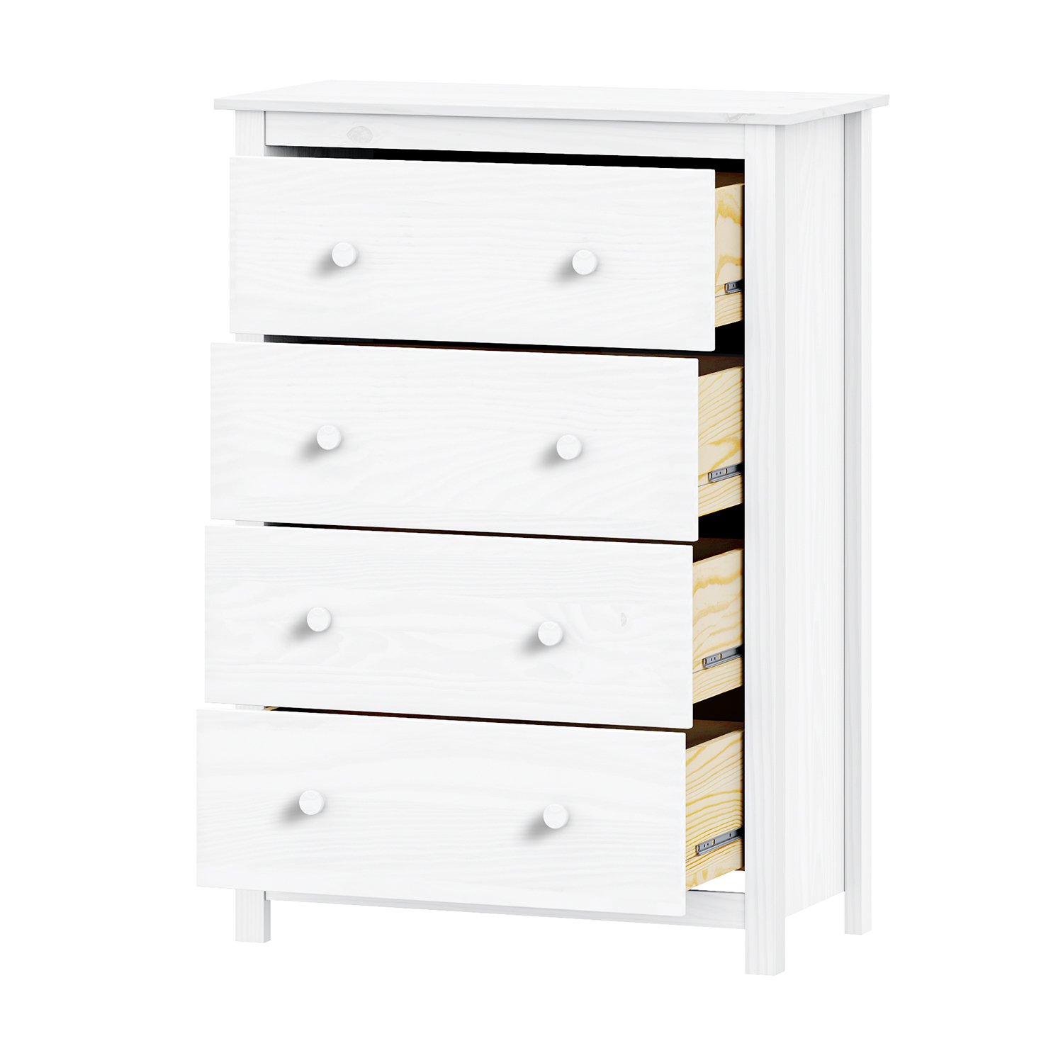 materiál masiv borovice, barevné provedení bílý lak čtyři zásuvky s kovovými pojezdy