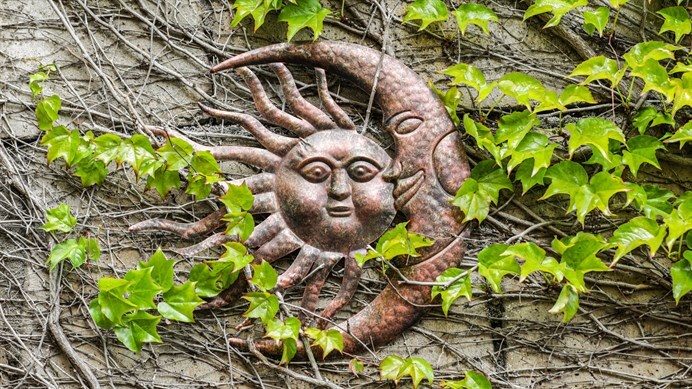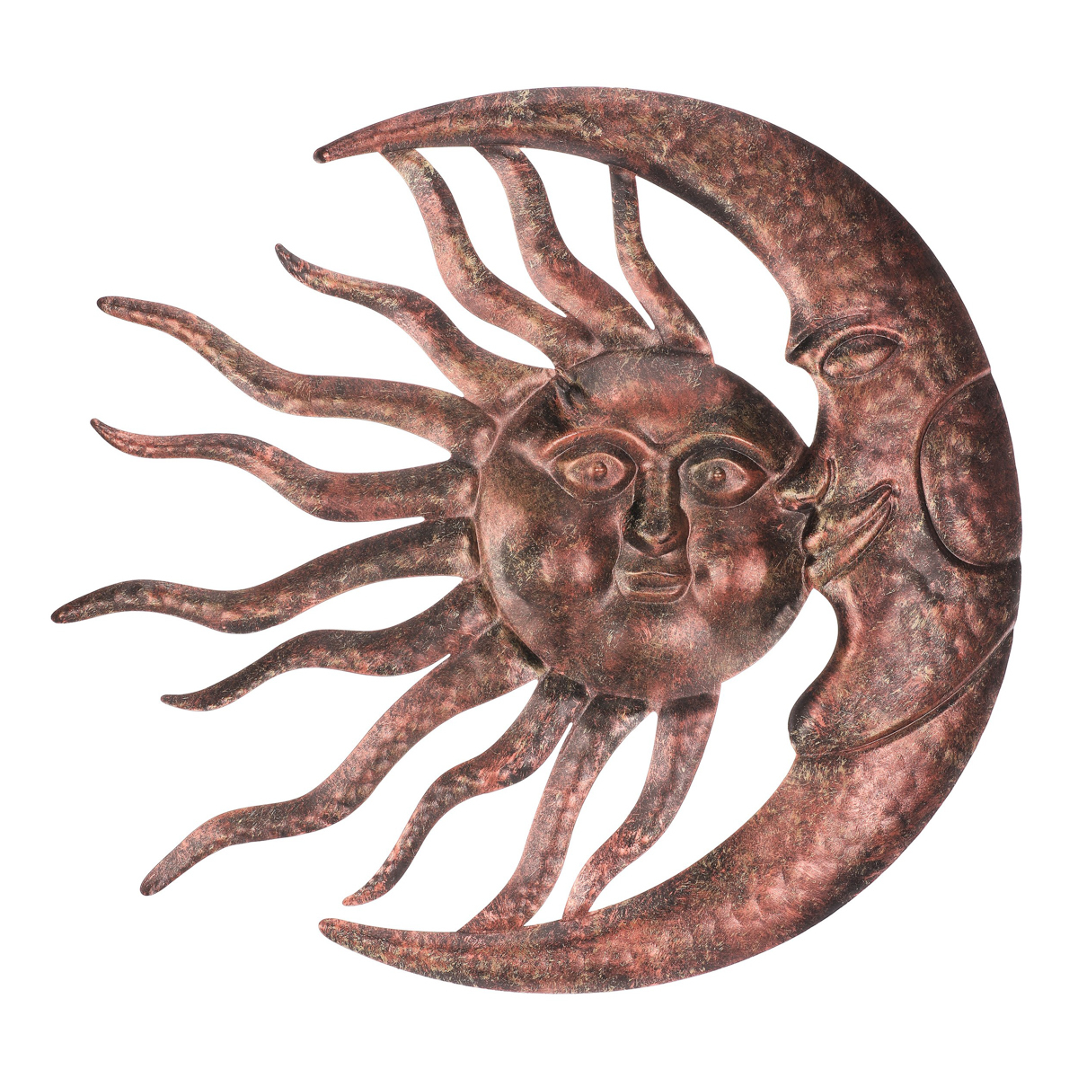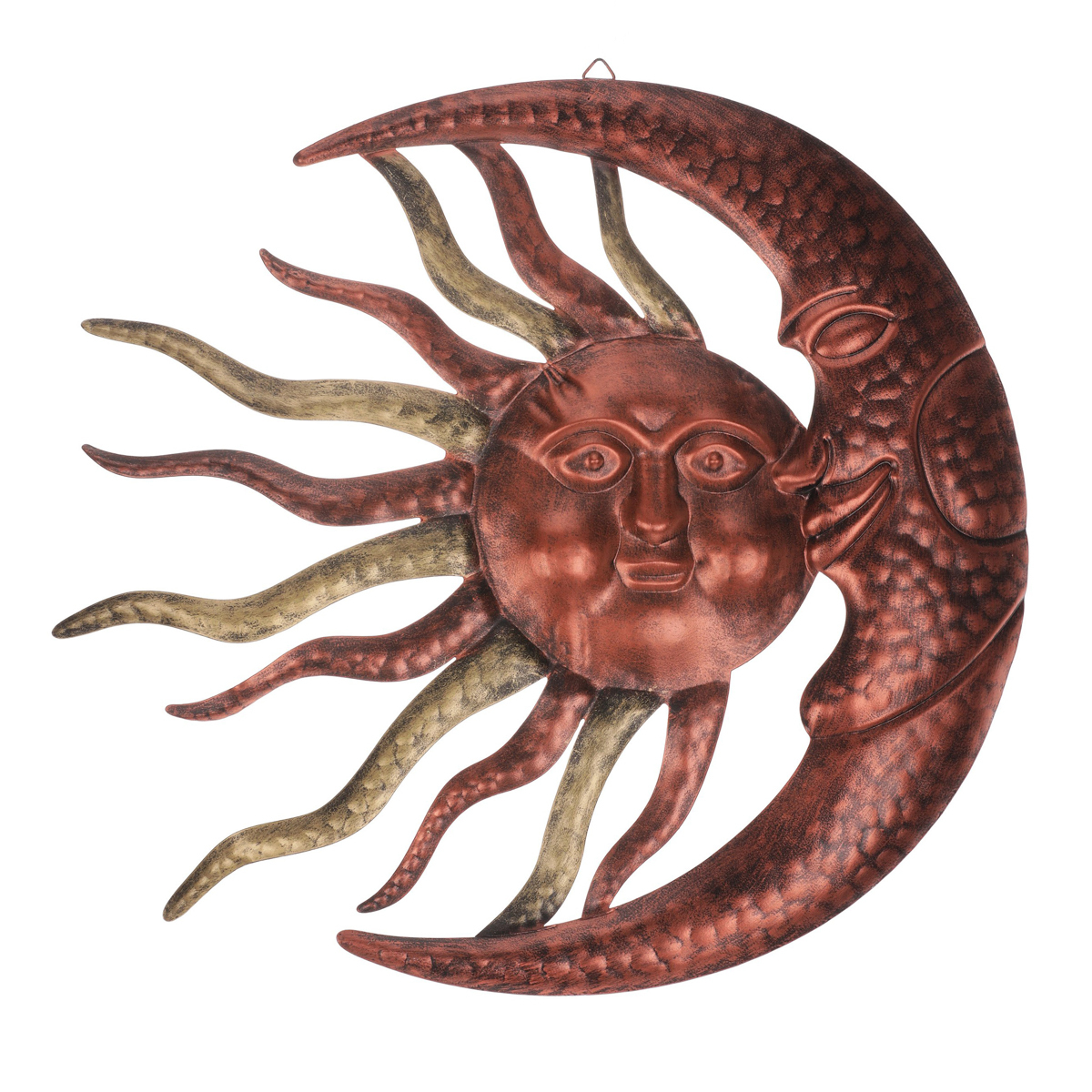 Tato závěsná kovová dekorace představuje symbolické spojení slunce a měsíce. Oba nebeské úkazy jsou v krásně měděné barvě se ztvárněnými obličeji, což jim přidává na originalitě. Slunce je zdobeno navíc dvoubarevnými paprsky, kdy se střídají měděné s mosaznými a měsíc má typický tvar úzkého srpku. Ozdoba je ideální pro milovníky astronomie a přírodních úkazů na nebi. Jde o originální a dosud nevídanou dekoraci, která se bude na stěně výjimat. Pokud chcete prokázat svůj neobyčejný a vytříbený styl, potom právě slunce s měsícem bude tou pravou volbou.