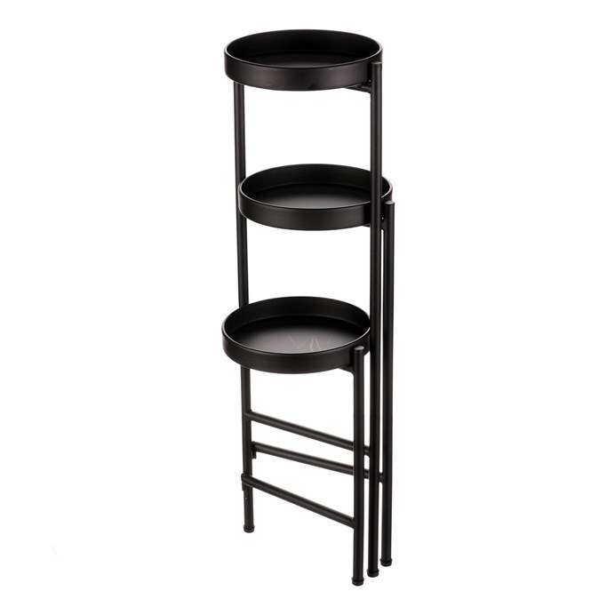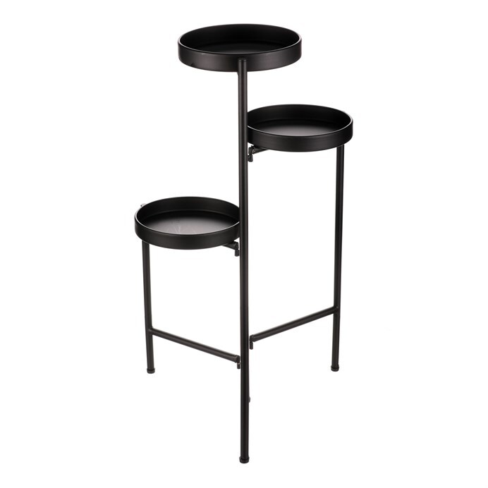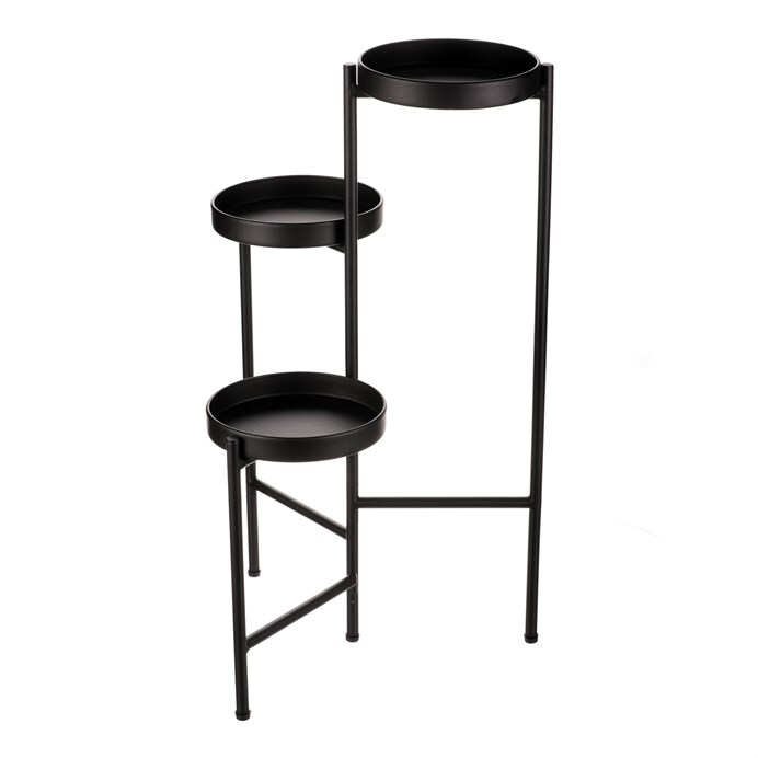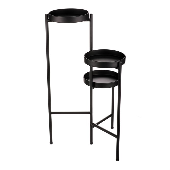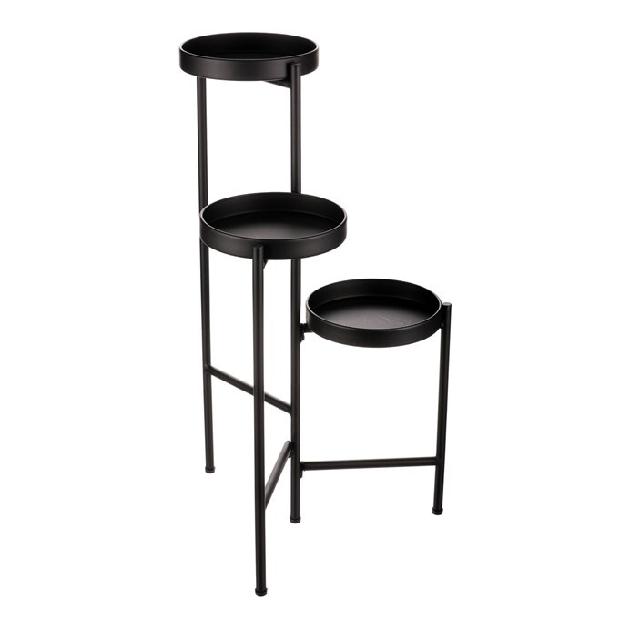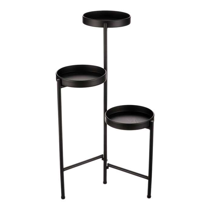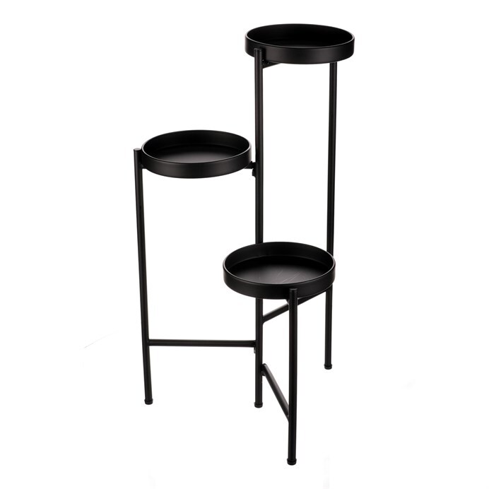 Bytový doplněk v podobě kovového stojanu v černé barvě bude skvělým pomocníkem pro prostorové umístění květin. Skládá se ze tří nosných ploch v různých výškách. Svým provedením je uzpůsoben pro umístění v rohu místnosti. Můžete tak krásně využít této mnohdy problematické plochy a terasovitě nechat vyniknout krásu rostlin na něm umístěných.