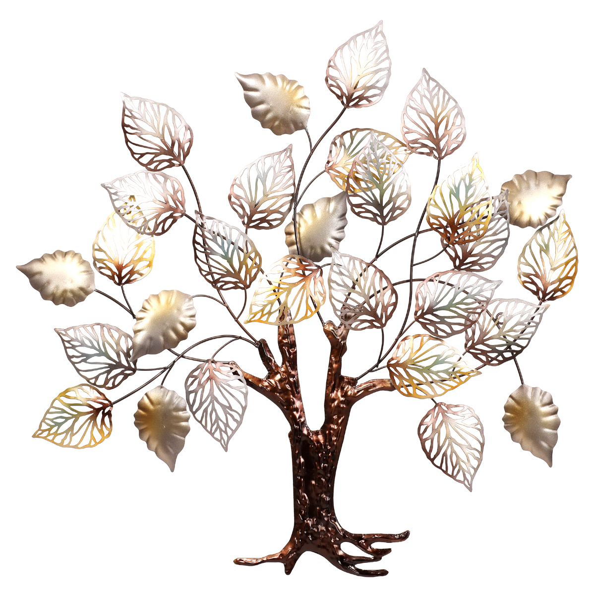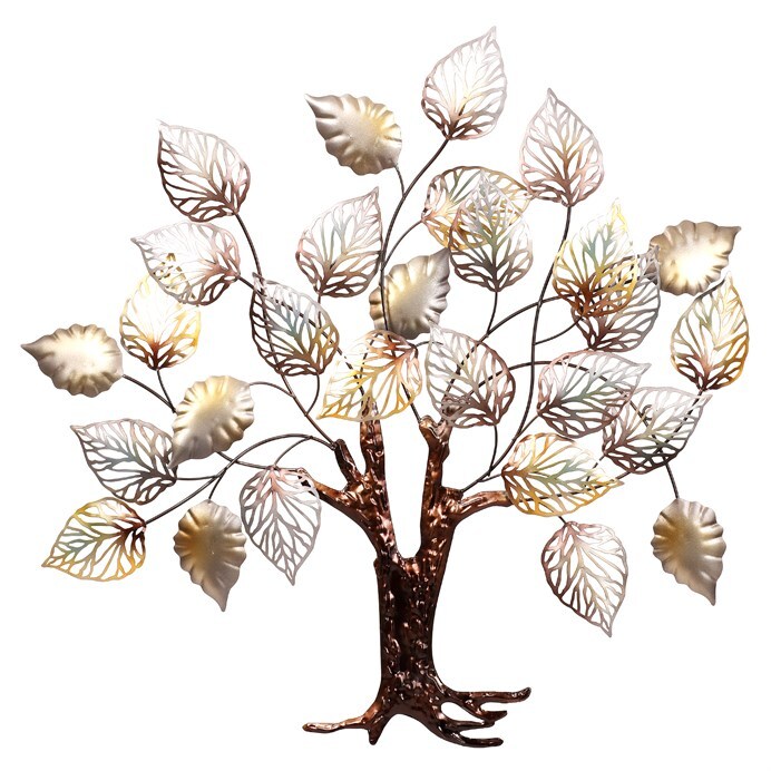 Tato velká kovová závěsná ozdoba na zeď, představující strom lístky v různých metalických odstínech, bude ústředním prvkem vašeho interiéru. S jejími rozměry (85 x 85 cm) a jedinečným designem představuje dokonalý způsob, jak přidat do vašeho prostoru nádech elegance a originality.Střídání stříbrných, žlutých a zelených odstínů lístků vytváří výrazný působivý kontrast, který přitahuje pozornost. Tento kovový strom se stane na stěně skutečně výrazným prvkem. Vyzařuje kreativitu a nápaditost a dodá vašemu interiéru osobitý charakter. Buďte připraveni na obdiv vašich návštěvníků, kteří budou fascinováni touto jedinečnou závěsnou ozdobou ve formě kovového stromu.