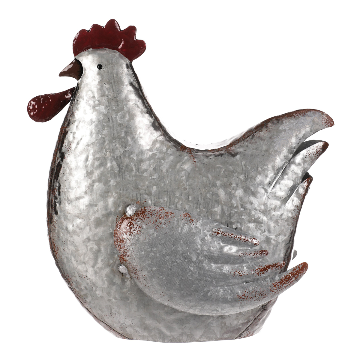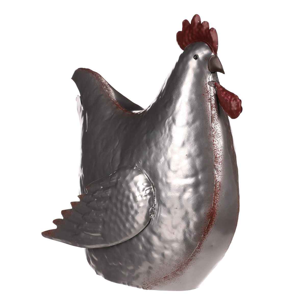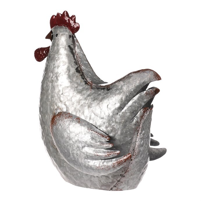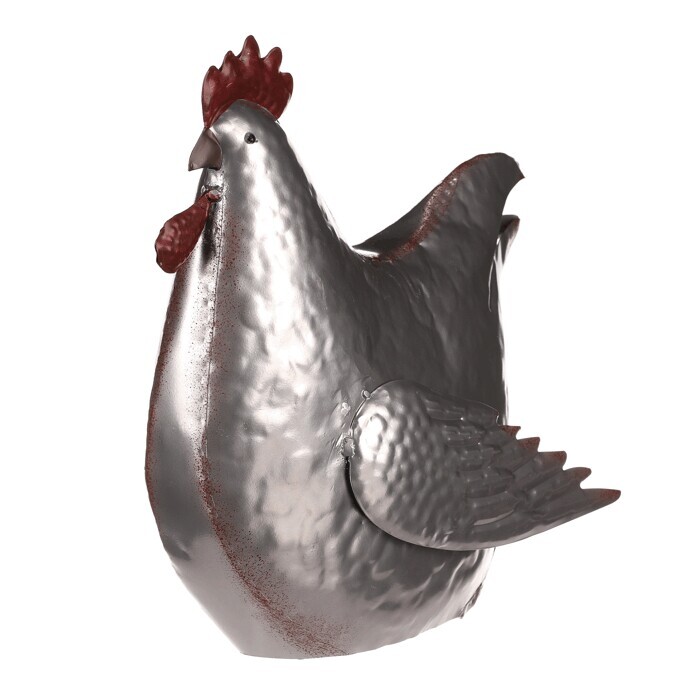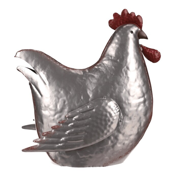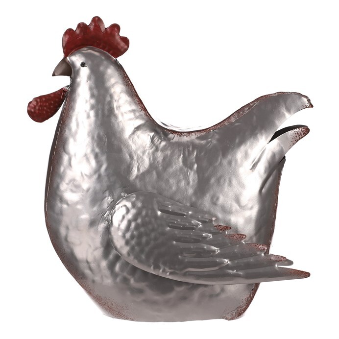 Tato kovová dekorace v podobě slepice je skutečně netradiční a originální zvířecí ozdobou, která se snadno stane středem pozornosti. Je v kovové až stříbrné barvě a místy doplněna hnědými až narezavělými odstíny. Působí dojmem opotřebeného ozdobného předmětu s dlouhou historií. S celoročním využitím je ideální pro interiéry, kde může vytvořit nádhernou a nápaditou atmosféru. Slepice může působit skvěle sama o sobě, nebo být součástí ucelené kompozice s ostatními figurkami, květinami či nejrůznějšími přízdobami. Hodí se spíše do vnitřních, nebo krytých prostor, kde nebude čelit povětrnostním vlivům.