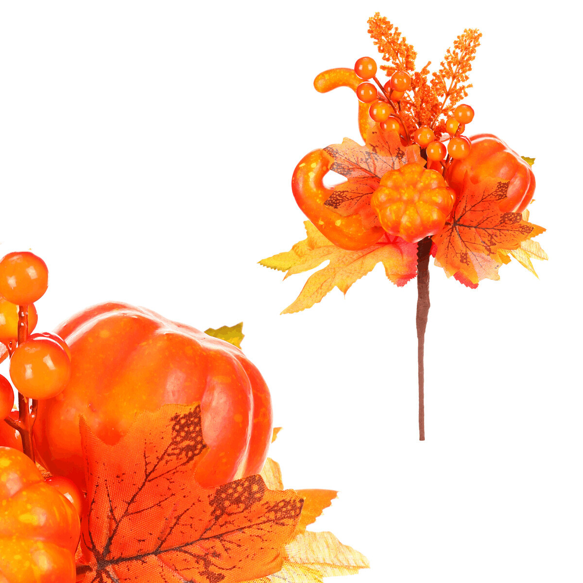 Umělá podzimní větvička s oranžovými lístky, doplněná dýněmi a bobulemi v podobných odstínech, je skvělým doplňkem pro výzdobu interiéru. Tato dekorace přináší do vašeho domova pestrobarevnost a široké možnosti využití, díky čemuž ji můžete snadno kombinovat s dalšími přízdobami a květinami. O její trvanlivost nemusíte mít obavy, neboť jako umělá vám neopadá a vydrží prakticky na věky. Těšit se z její krásy můžete bez obav po celou sezónu i mnoho dalších. Její syté barevné odstíny dodají místnosti hřejivý nádech a přinesou do ní atmosféru podzimního tepla a pohodlí.