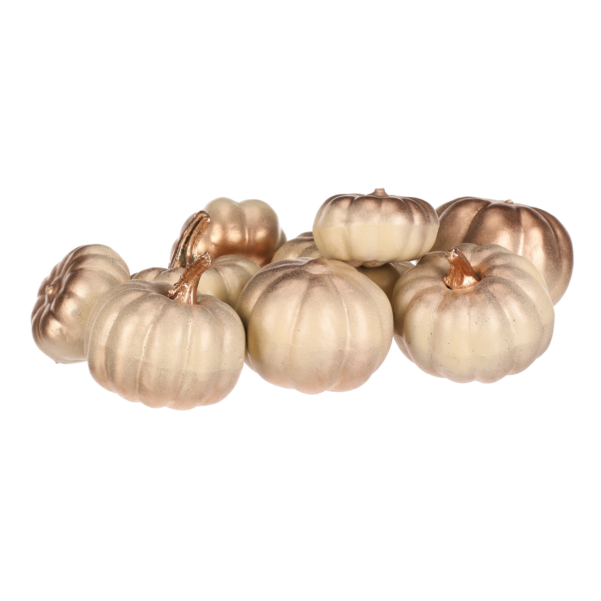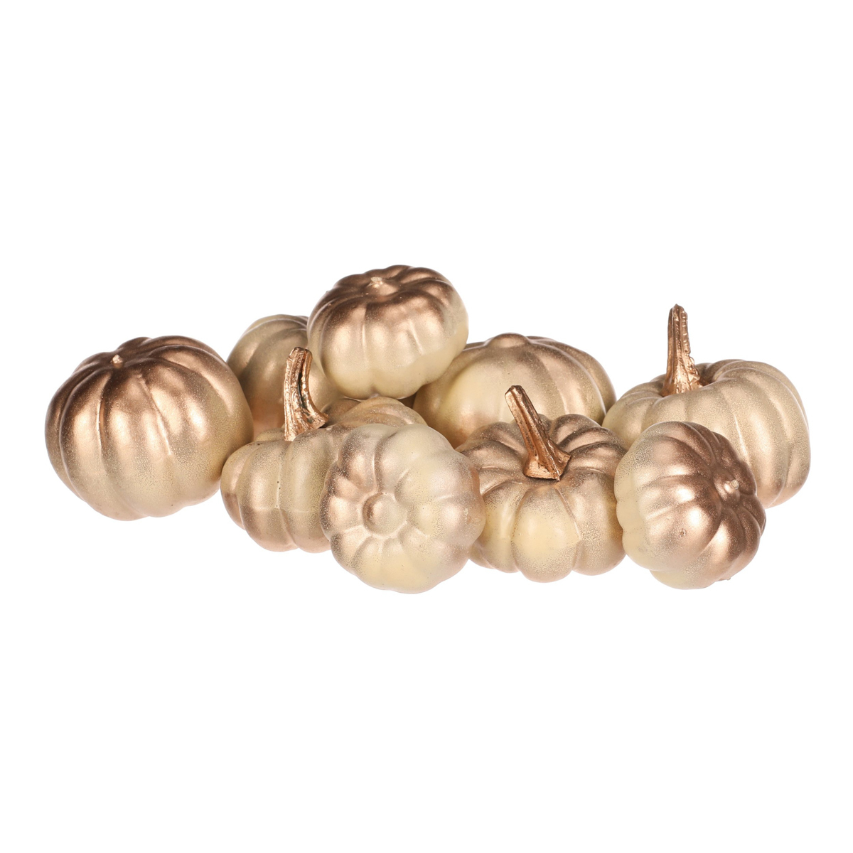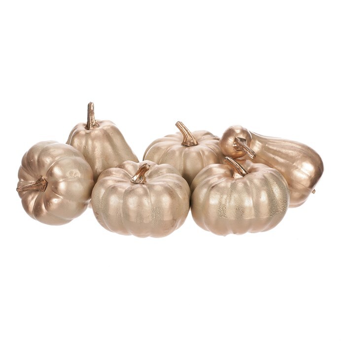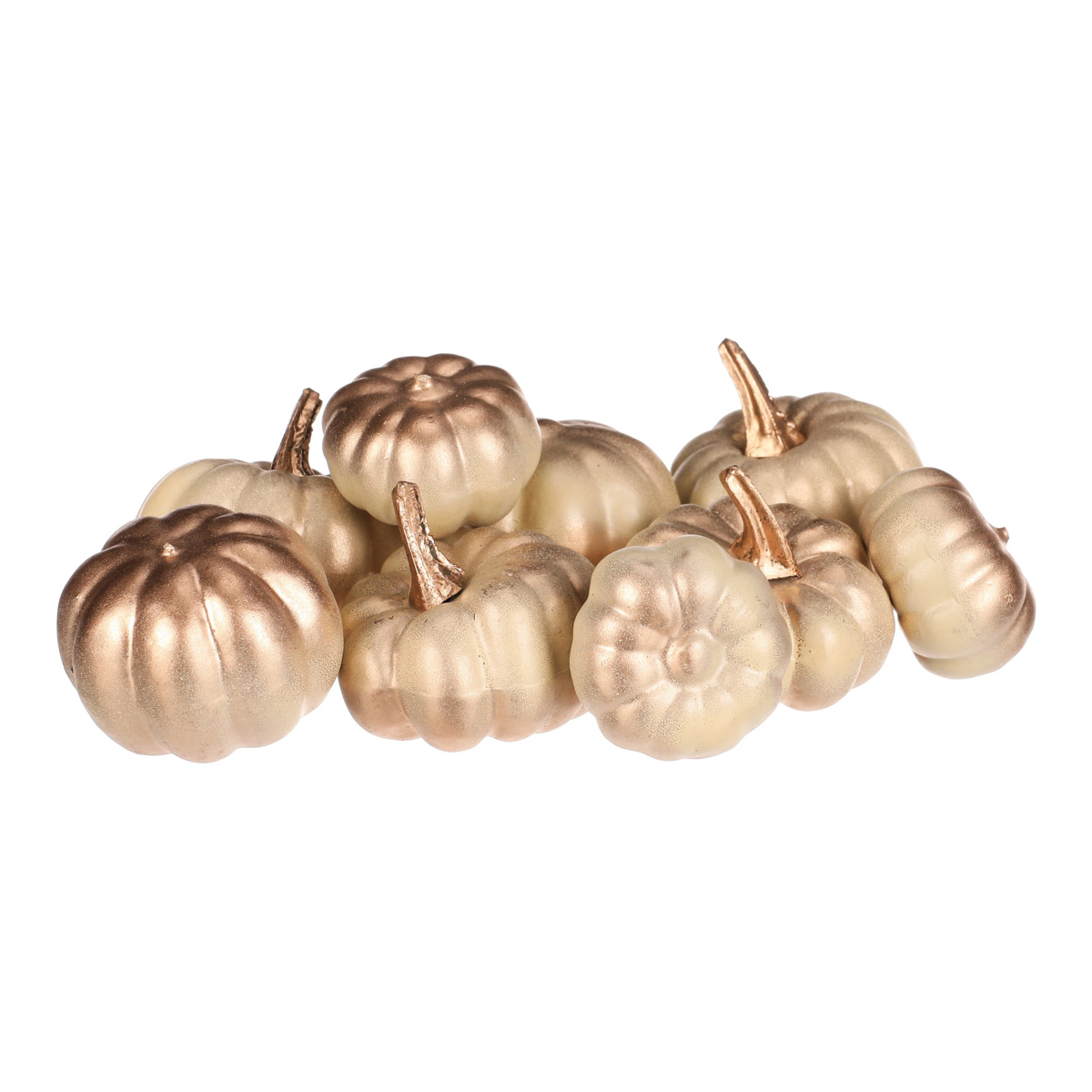 Naše plastové dýně díky svému realistickému vzhledu a pevné struktuře, se stanou důležitým ozdobným prvkem vašich podzimních kreativních nápadů. Balení obsahuje celkem 9 kusů, ve kterém najdete plody různých velikostí, všechny ve zlaté, až béžové barvě. Díky tomu je můžete hravě kombinovat s dalšími plody, přízdobami či například květinami. Tyto plastové dýně se nikdy nezkazí, což z nich činí ideální volbu pro trvalé nebo opakované použití, bez nutnosti péče a obav, že by časem ztratily kousek ze své krásy.