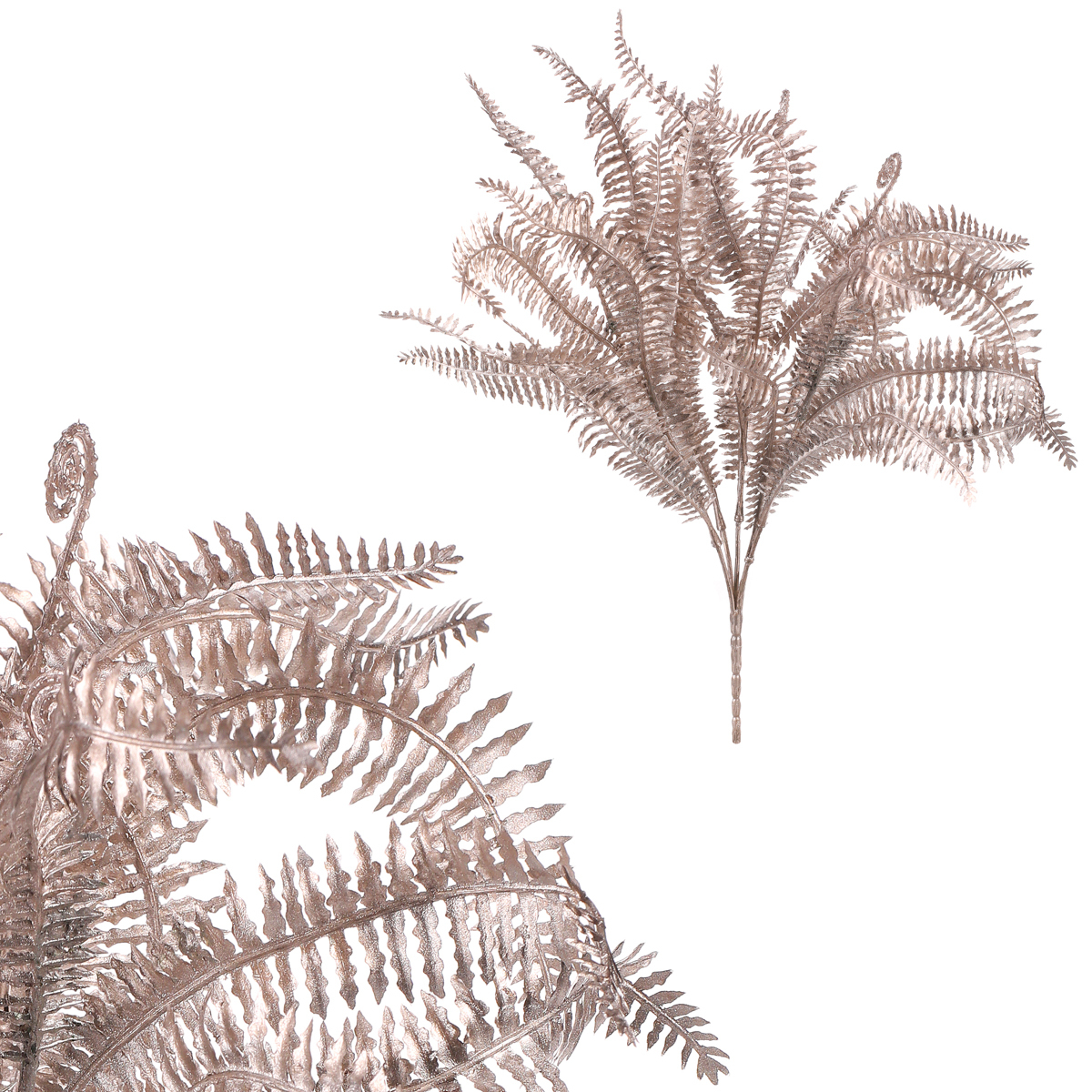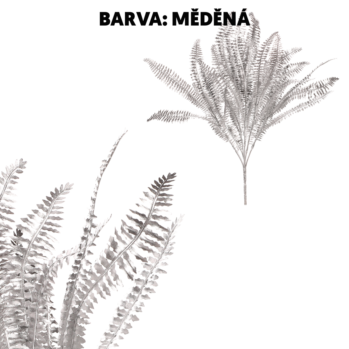 Oživte vaši vánoční výzdobu umělým trsem kapradin v nádherném odstínu měděné barvy. Jeho jemné a realistické detaily připomínající pravé kapradí, dodají svátečnímu prostředí útulný a elegantní vzhled. Tato trvanlivá přízdoba zůstane svěží a krásná po dlouhou dobu, čímž se stane dokonalým doplňkem vašeho aranžování. Své specifické barevné tóny vnesou do prostoru teplou a zářivou atmosféru, která vytvoří kouzelný prostor. Díky své všestrannosti a trvanlivosti je výborným základem pro dodání květin, přízdob a dalších dekorativních prvků, a to i pro mnoho dalších let.