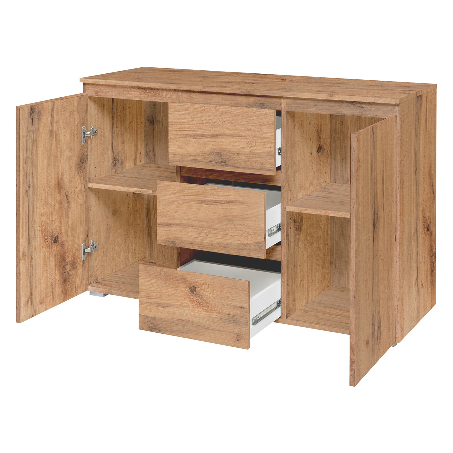 barevné provedení zlatý dub 2 dveře, 2 police, 3 zásuvky s kovovými pojezdy