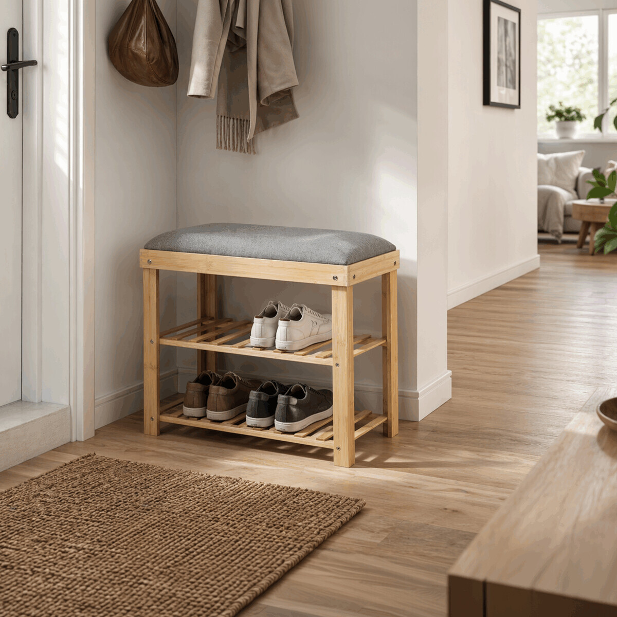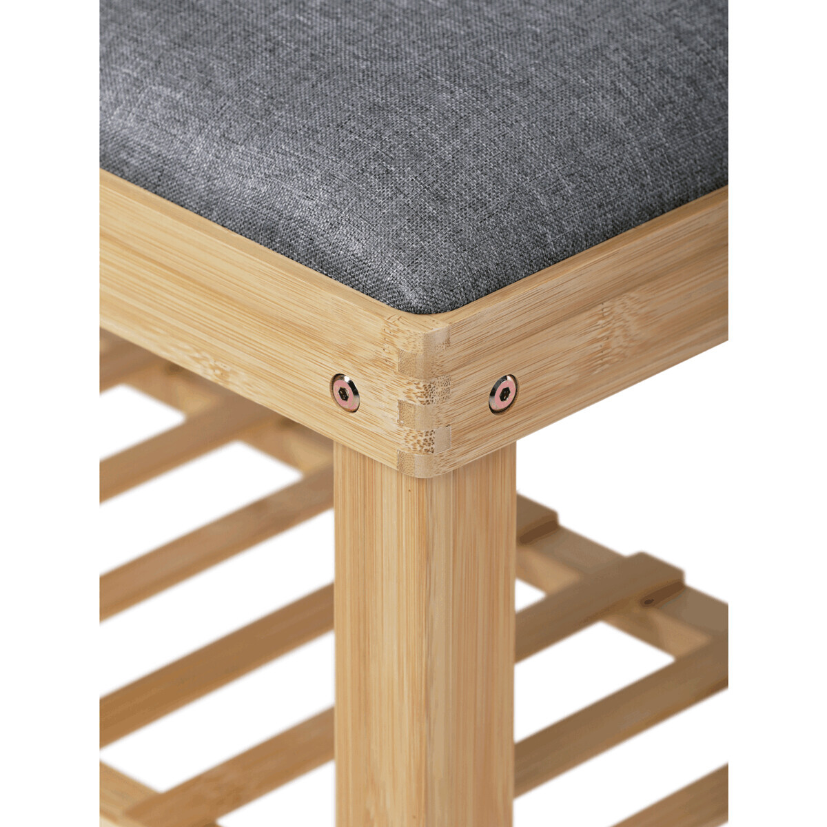 Botník a taburet DR-N1010 GREY2 značky Autronic kombinuje funkčnost s přírodní estetikou díky konstrukci z masivního bambusu v přírodním odstínu, která zajišťuje pevnost a dlouhou životnost. Sedák je čalouněný šedou látkou s jemnou strukturou, která poskytuje pohodlné posezení a zároveň doplňuje minimalistický design. Dvě police tvořené bambusovými latěmi nabízejí praktický úložný prostor pro uložení obuvi nebo drobných předmětů, přičemž otevřená konstrukce umožňuje cirkulaci vzduchu a snadnou údržbu. Robustní rám je sestavený pomocí kovových spojovacích prvků, které zvyšují stabilitu celého výrobku. Kompaktní rozměry a ergonomické tvarování sedáku zajišťují komfortní sezení i v menších prostorách, což činí botník vhodným do předsíní či chodeb s omezeným prostorem. Nosnost výrobku odpovídá běžnému zatížení při sezení a ukládání obuvi, což zaručuje jeho všestranné využití v domácnostech s důrazem na přírodní materiály a jednoduchý design.