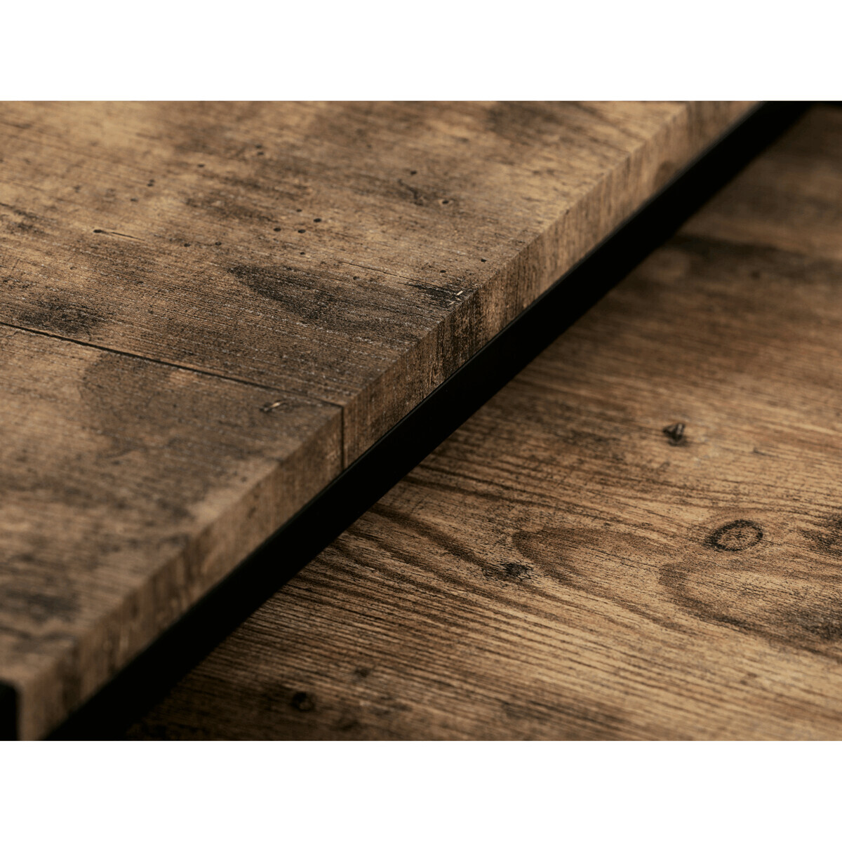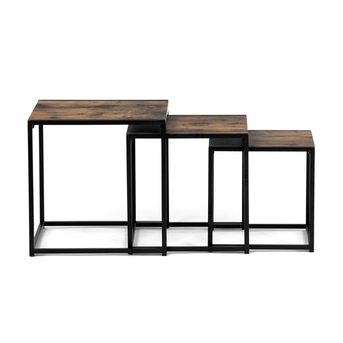 Set 3 ks přístavných nebo odkládacích stolků přinese do Vašeho domova praktičnost, variabilitu, ale také industriální šarm. Stolky můžete rozmístit jednotlivě po interiéru, kde Vám vytvoří zajímavé odkládací prvky v různých výškových hladinách. A nebo společně povytažené, kde vytvoříte velkou obdélníkovou stupňovitou odkládací plochu. Velkou výhodou je možnost zasunutí stolků do sebe, což oceníte při úklidu, skladování nebo při potřebě většího prostoru. Čtvercové desky z MDF v dekoru staré dřevo harmonicky doplňují černá kovová konstrukce, která tvoří rovněž nohy a celkově stolky zpevňuje. Stolek jistě zaujmou nejen svým nadčasovým designem, ale i variabilitou a praktičností. Desky májí rozměr 35 x 35 x 35 , 40 x 40 x 40 a 45 x 45 x 45 cm, tloušťku 1,5 cm. Konstrukce je čtvercového průřezu, na spodních plochách opatřená plastovými kluzáky. Nosnost jednotlivého stolku je do 15 kg.
