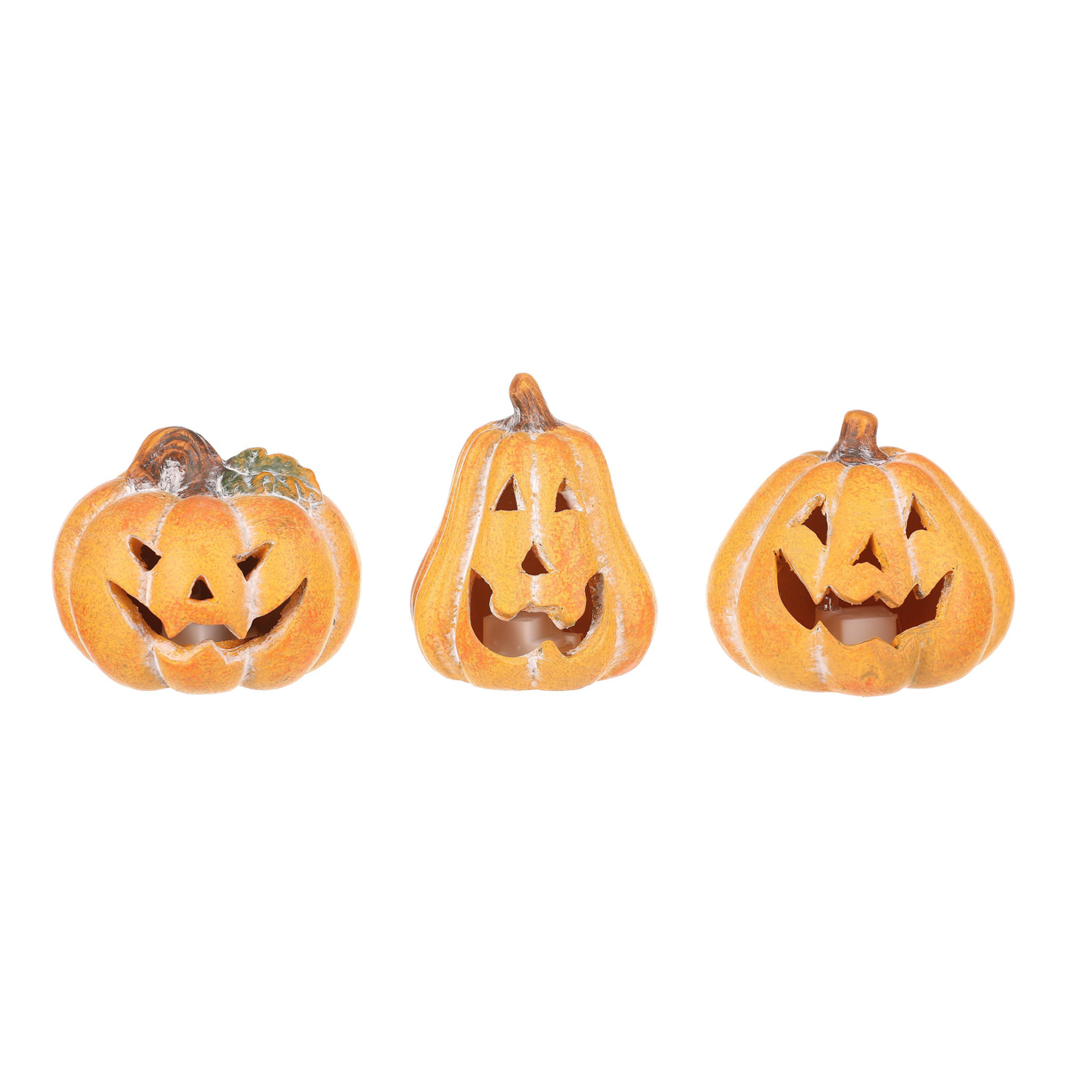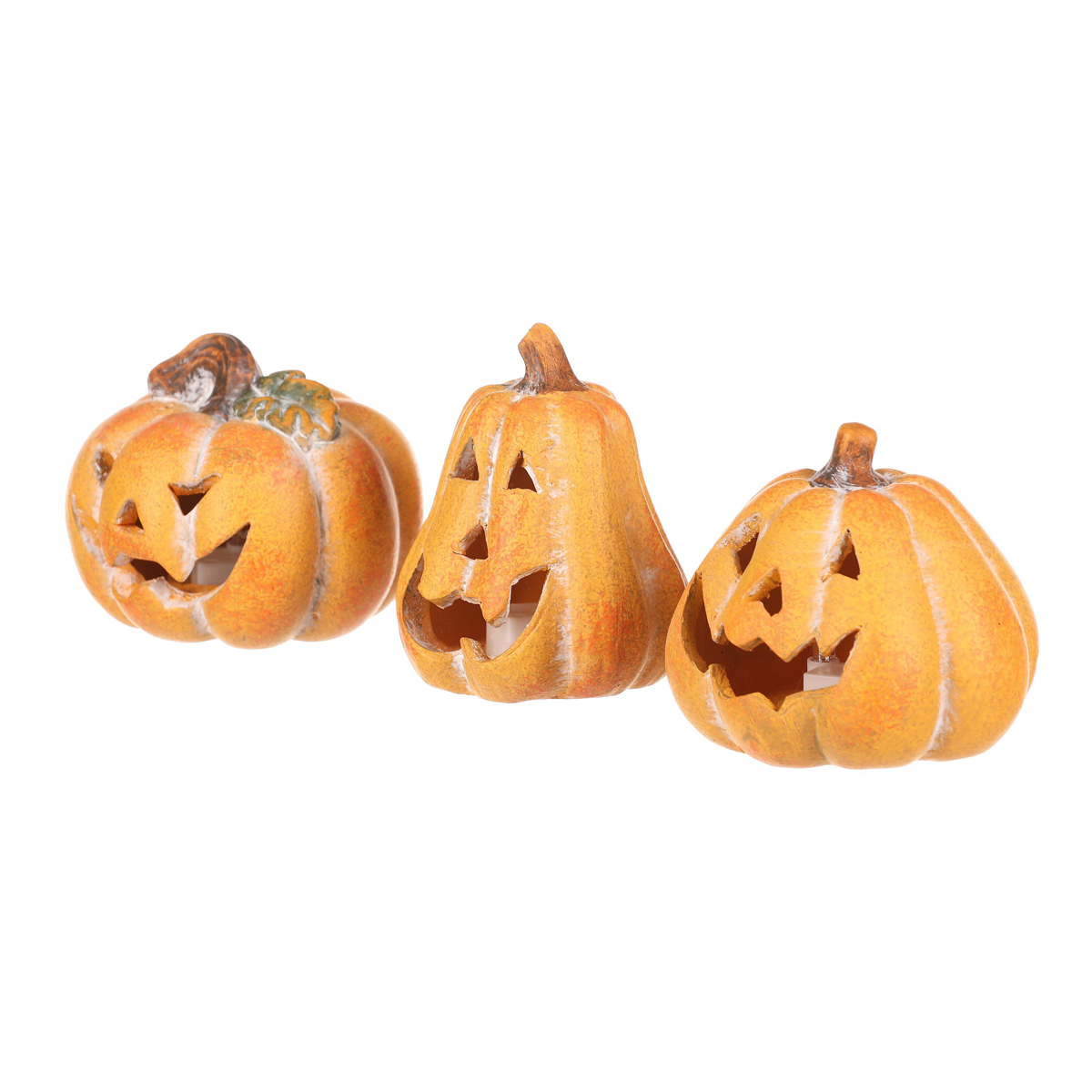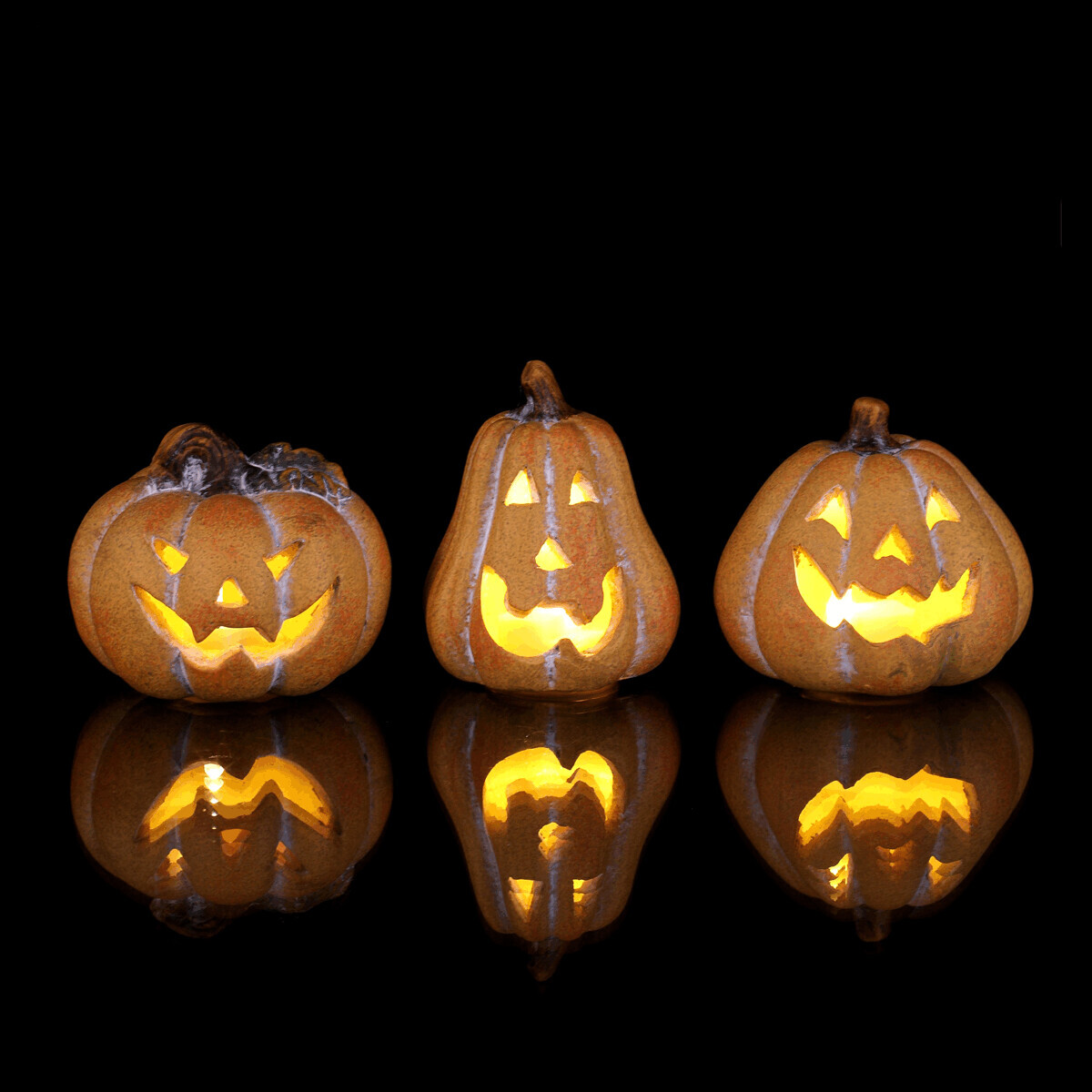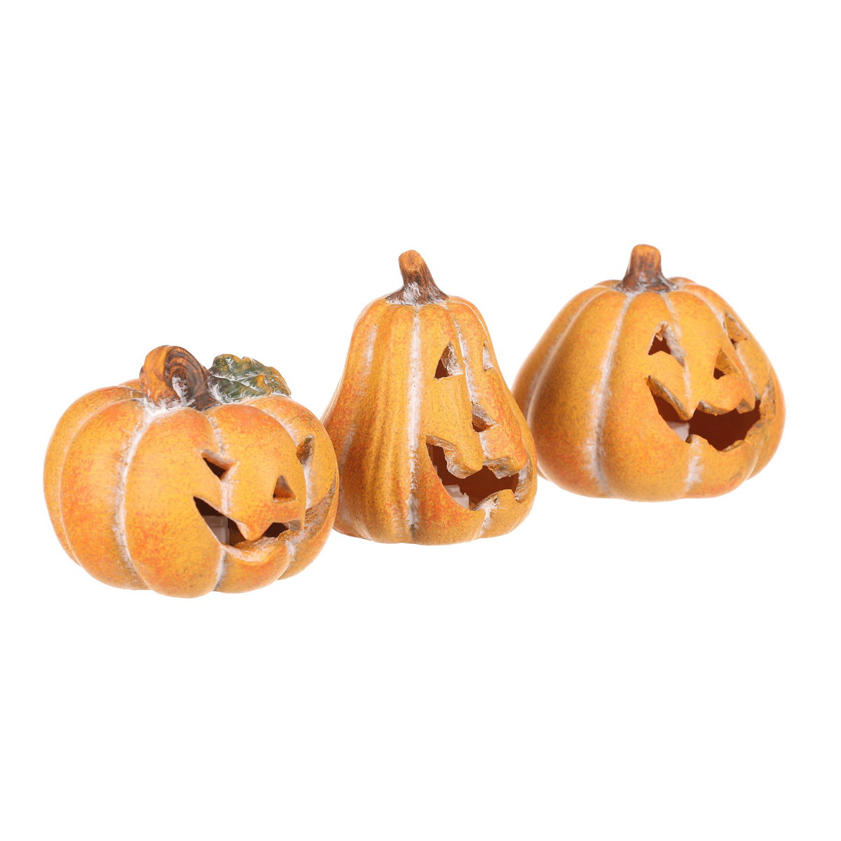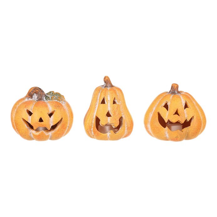 Vytvořte si jedinečnou podzimní atmosféru s naším mixem malých keramických dýní s vyřezanými obličeji. Každá z nich má vyřezaný obličej, který připomíná veselého strašáka, a je vyrobena z keramiky, což zajišťuje jejich trvanlivost. Mají dutý vnitřek, kde se nachází LED osvětlení, což za dlouhých podzimních večerů bude mít neodolatelný světelný efekt. Tři druhy dýní se liší tvarem, ale všechny jsou ve stejném, žlutém odstínu, což zajistí harmonický vzhled vaší dekorace. Tyto malé keramické tykve jsou skvělou volbou pro ozdobení jak venkovních prostor, tak i interiérů vašeho domova. Užijte si naplno atmosféru barevného podzimu, případně děsivého Halloweenu, s našimi keramickými dýněmi s osvětlením.