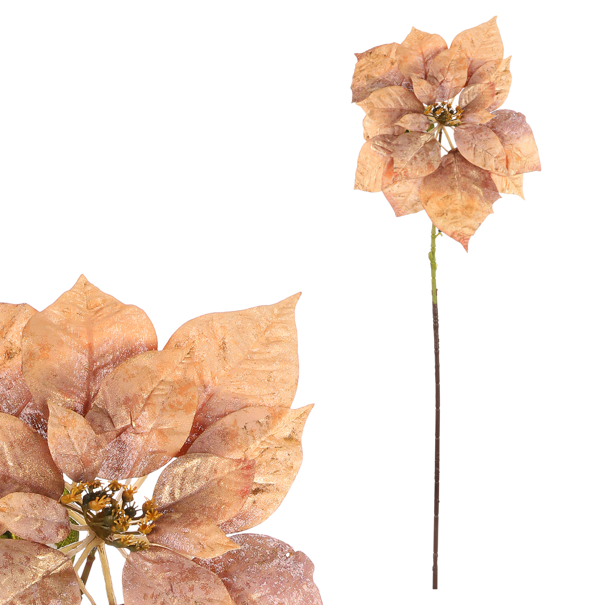 Využijte pro vánoční výzdobu tuto umělou vánoční hvězdu ve svátečním barevném provedení. Je v podobě velkého květu na dlouhém, holém stonku, která má zlaté květy včetně středu. Tato umělá varianta jednak skvěle vypadá, ale taktéž nabízí trvalou možnost jejího použití, a to i v mnoha dalších letech.