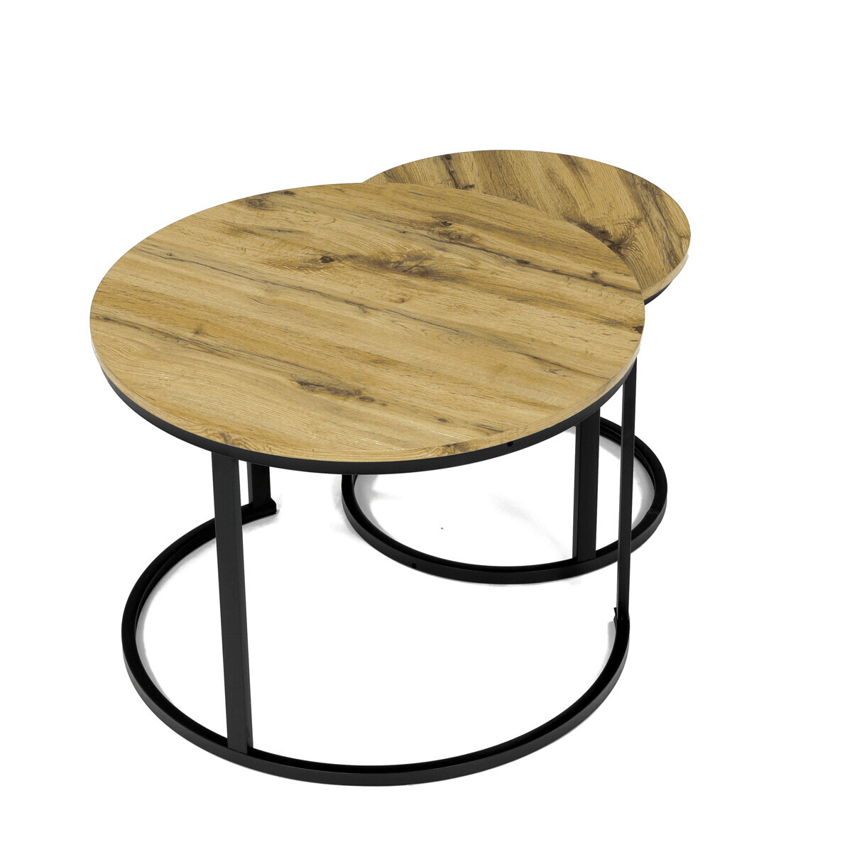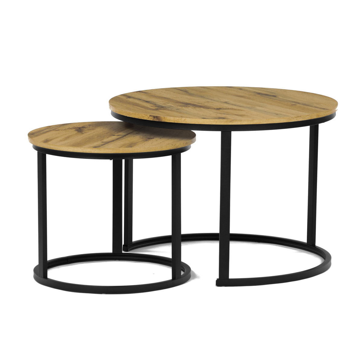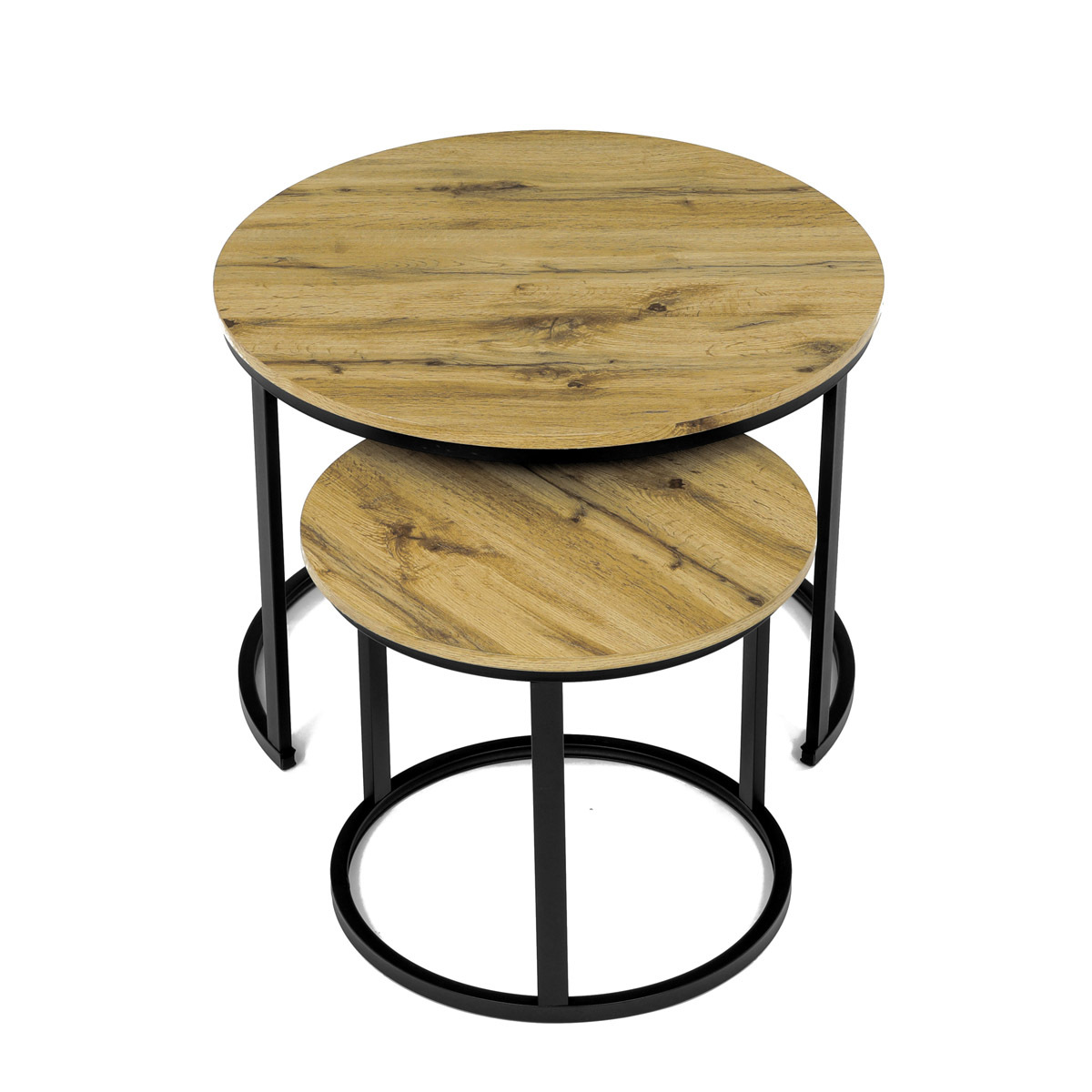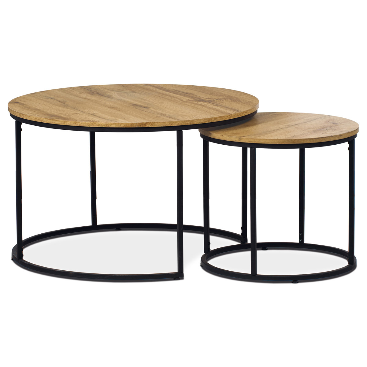 Konferenční stoly v setu dvou kusů kombinují desky z MDF s dekorem divokého dubu a pevnou kovovou podnož v černém matném laku. Kulaté desky s přírodními hnědými odstíny jsou navrženy s ohledem na snadnou údržbu a odolnost proti poškrábání. Kovová podnož tvoří stabilní kruhový rám, který zajišťuje pevnost a stabilitu stolů. Výška většího stolu je 50 cm, což umožňuje pohodlné použití v obývacím prostoru jako praktický doplněk k sedací soupravě. Menší stůl lze díky kompaktním rozměrům snadno zasunout pod větší, čímž šetří místo a nabízí variabilní uspořádání.