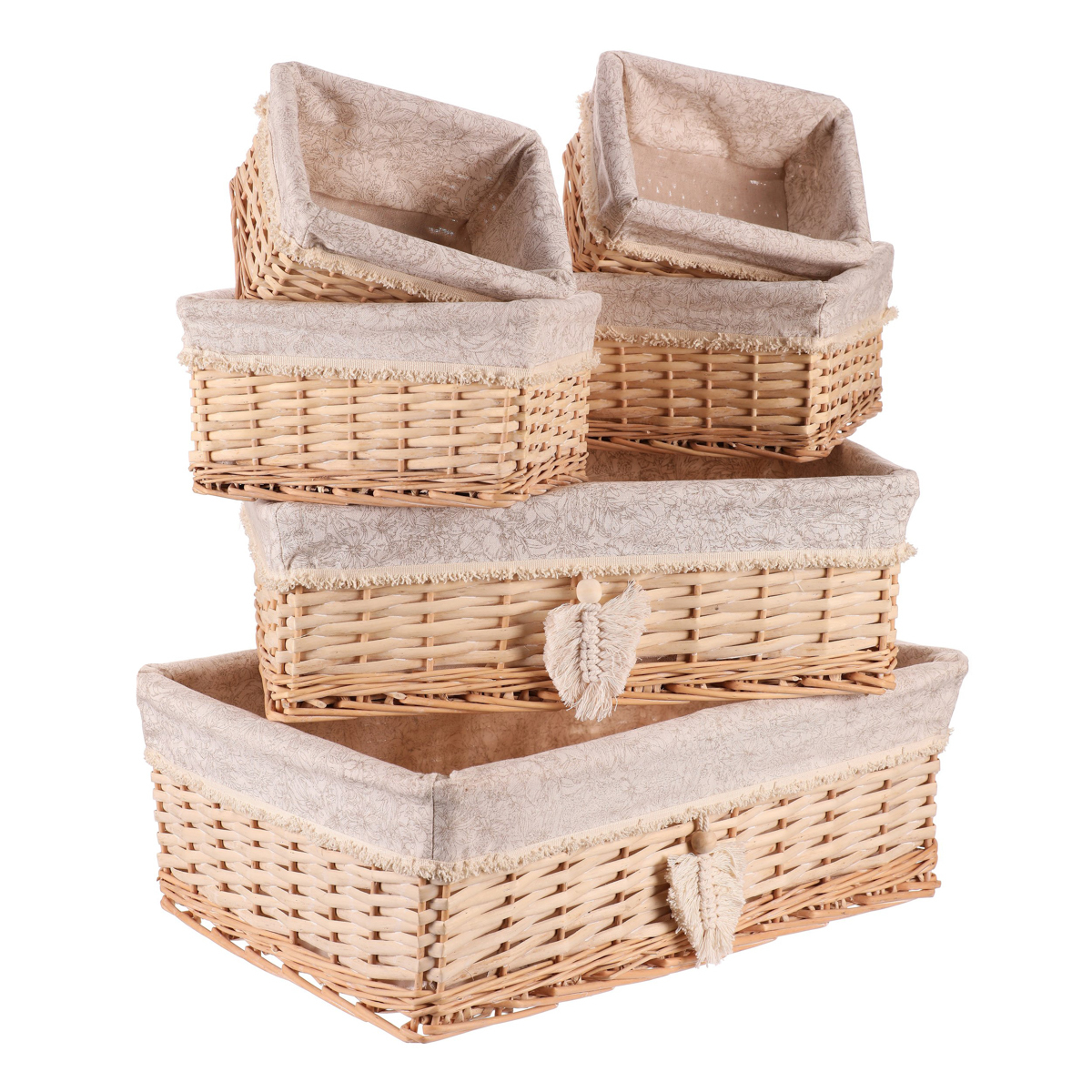 Sada šesti hranatých proutěných košů v přírodních barvách o různých velikostech přináší eleganci i praktičnost. Nejmenší dva kusy jsou zastoupeny dvakrát, což vám umožní efektivně využít každý kout vaší skříně nebo regálu. Všechny koše jsou potažené lehce snímatelnou světle šedou látkou, takže údržba je hračkou. Vytvořte si uklizený a uspořádaný domov snadno a rychle!