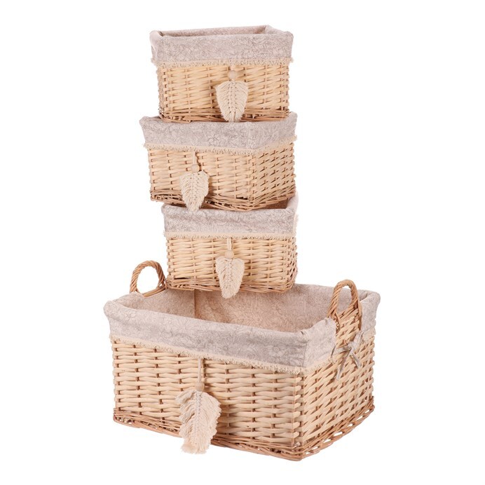 Sada čtyř hranatých proutěných košů v přírodních barvách o 2 různých velikostech přináší eleganci i praktičnost. Větší kus je pouze jeden, zatímco ty menší jsou zastoupeny rovnou třikrát, což vám umožní efektivně využít každý kout vaší skříně nebo regálu. Všechny koše jsou potažené lehce snímatelnou světle šedou látkou, takže údržba je hračkou. Vytvořte si uklizený a uspořádaný domov snadno a rychle!