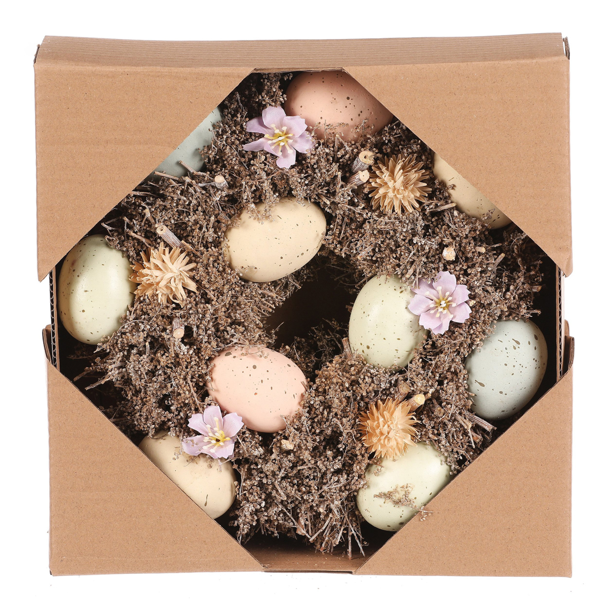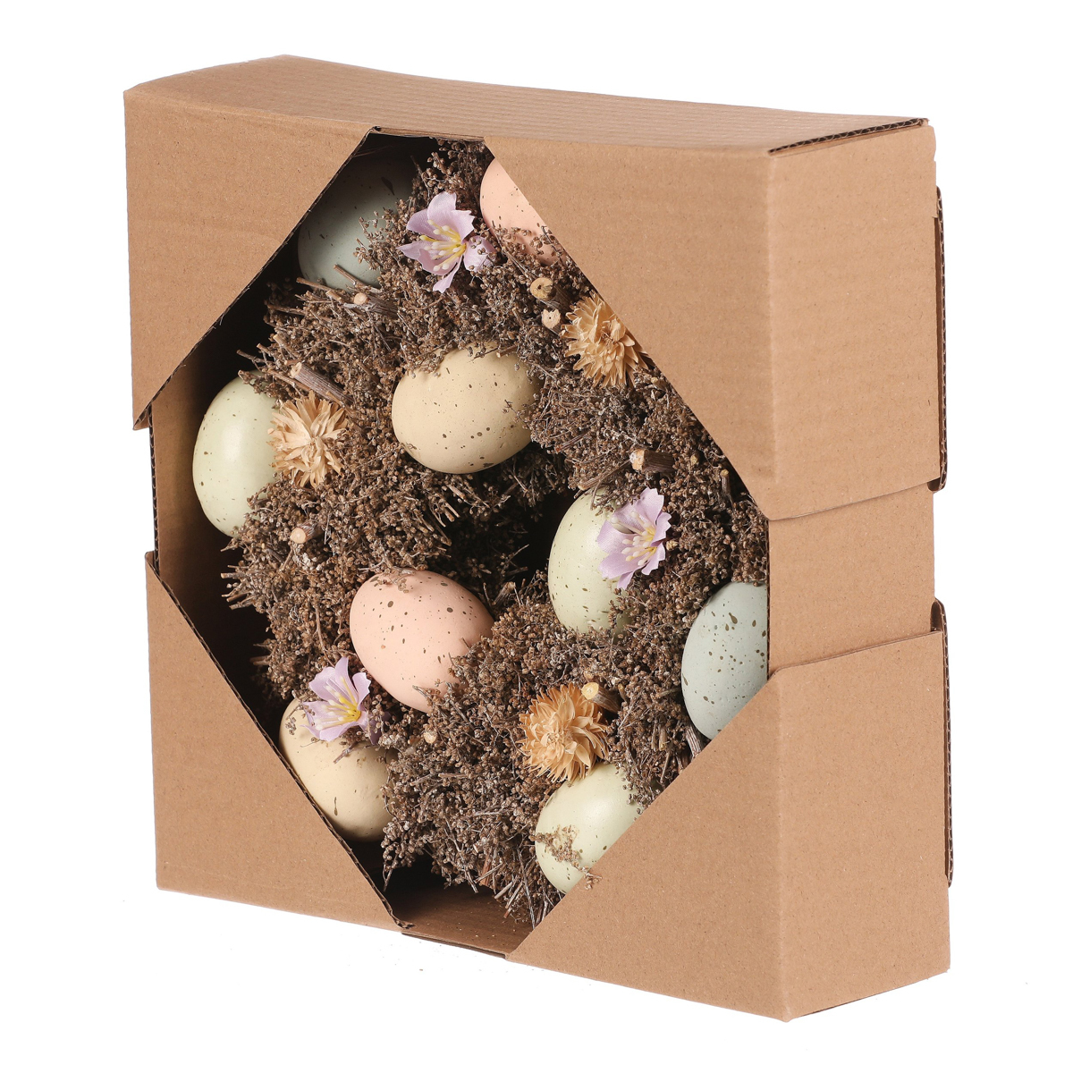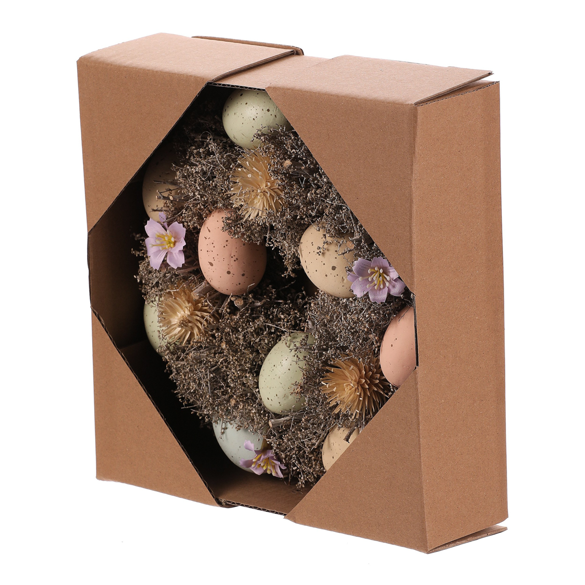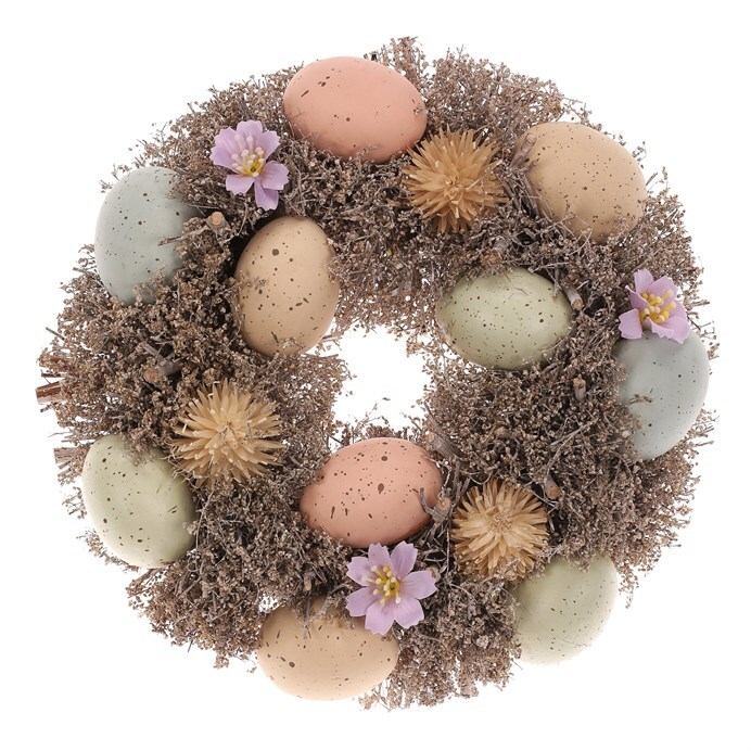 Tento velikonoční věnec o průměru 24 cm má proutěný základ a je zdoben různobarevnými vajíčky, drobnými kvítky a větvičkami. Je to trvalá dekorace, ideální jak na pověšení, tak na umístění na stůl, která přinese do vašeho domova veselou a jarní atmosféru.
