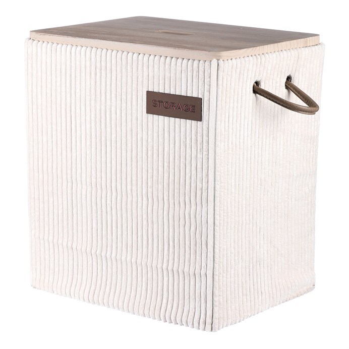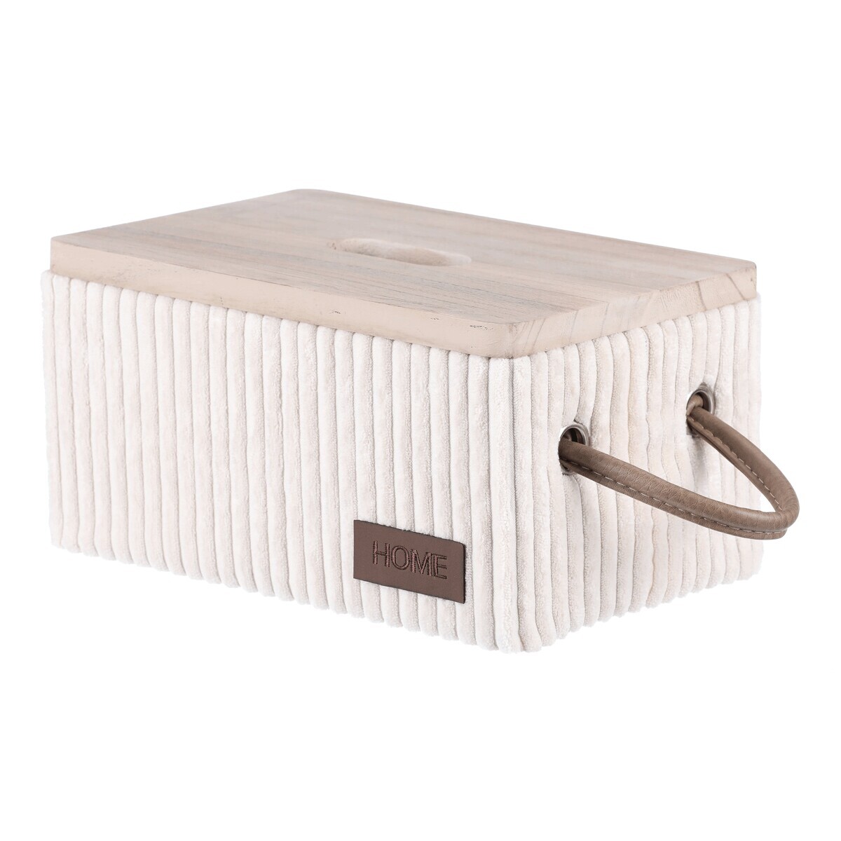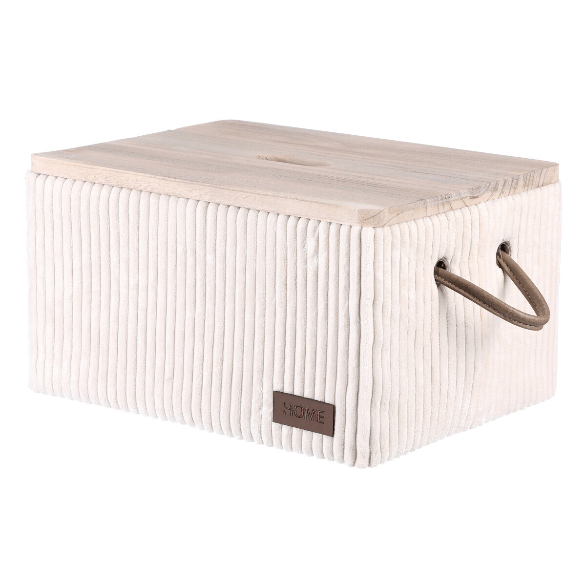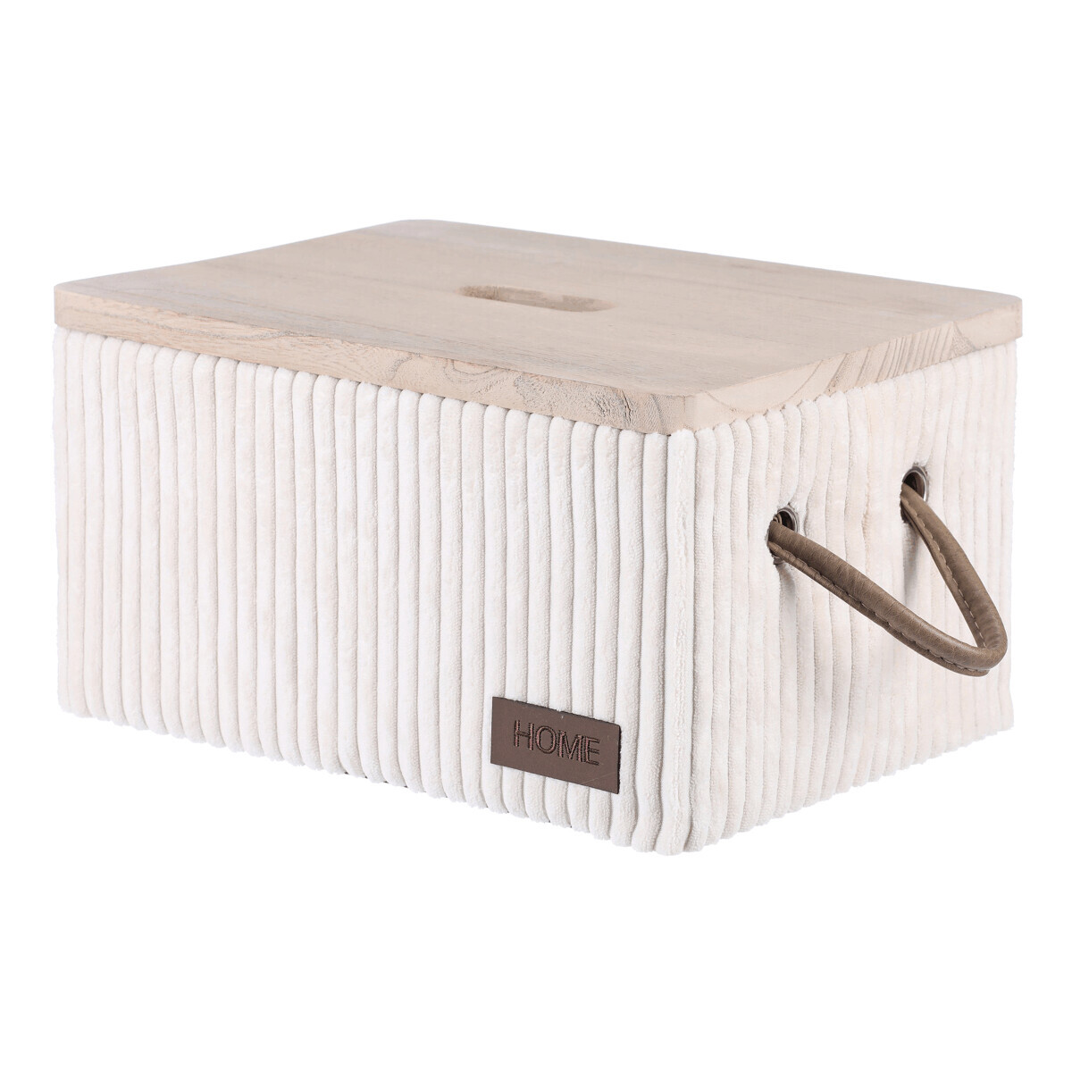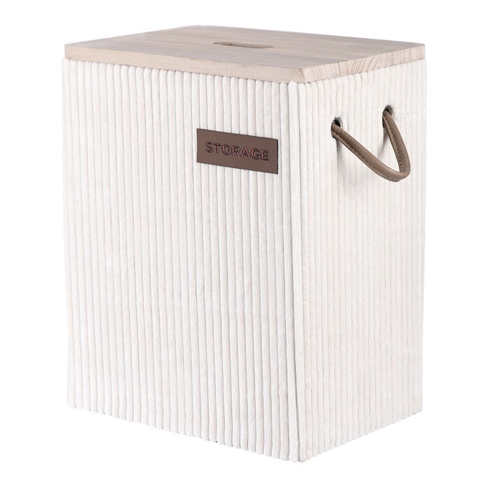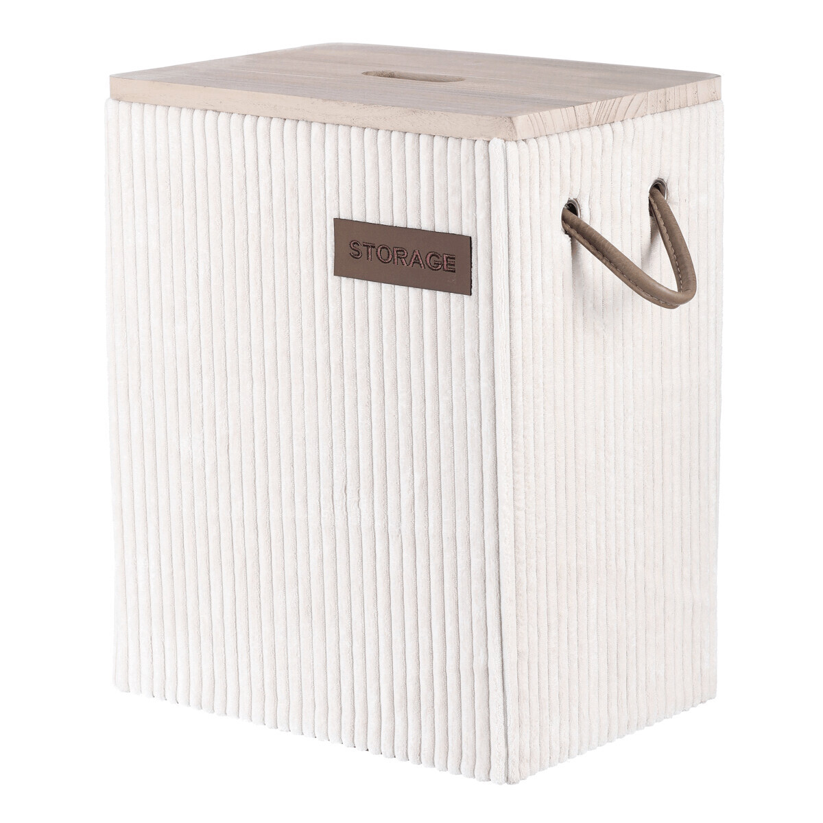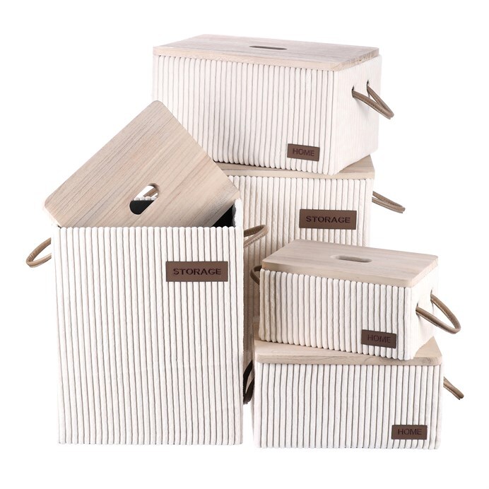 Sada látkových prádelních košů v krémové barvě s elegantním dřevěným víkem a praktickými poutky po stranách. Obsahuje 5 různých velikostí, které jsou nejen estetické, ale i funkční pro váš domov.